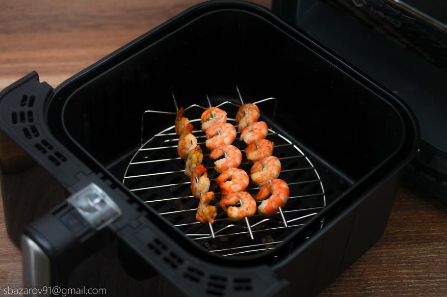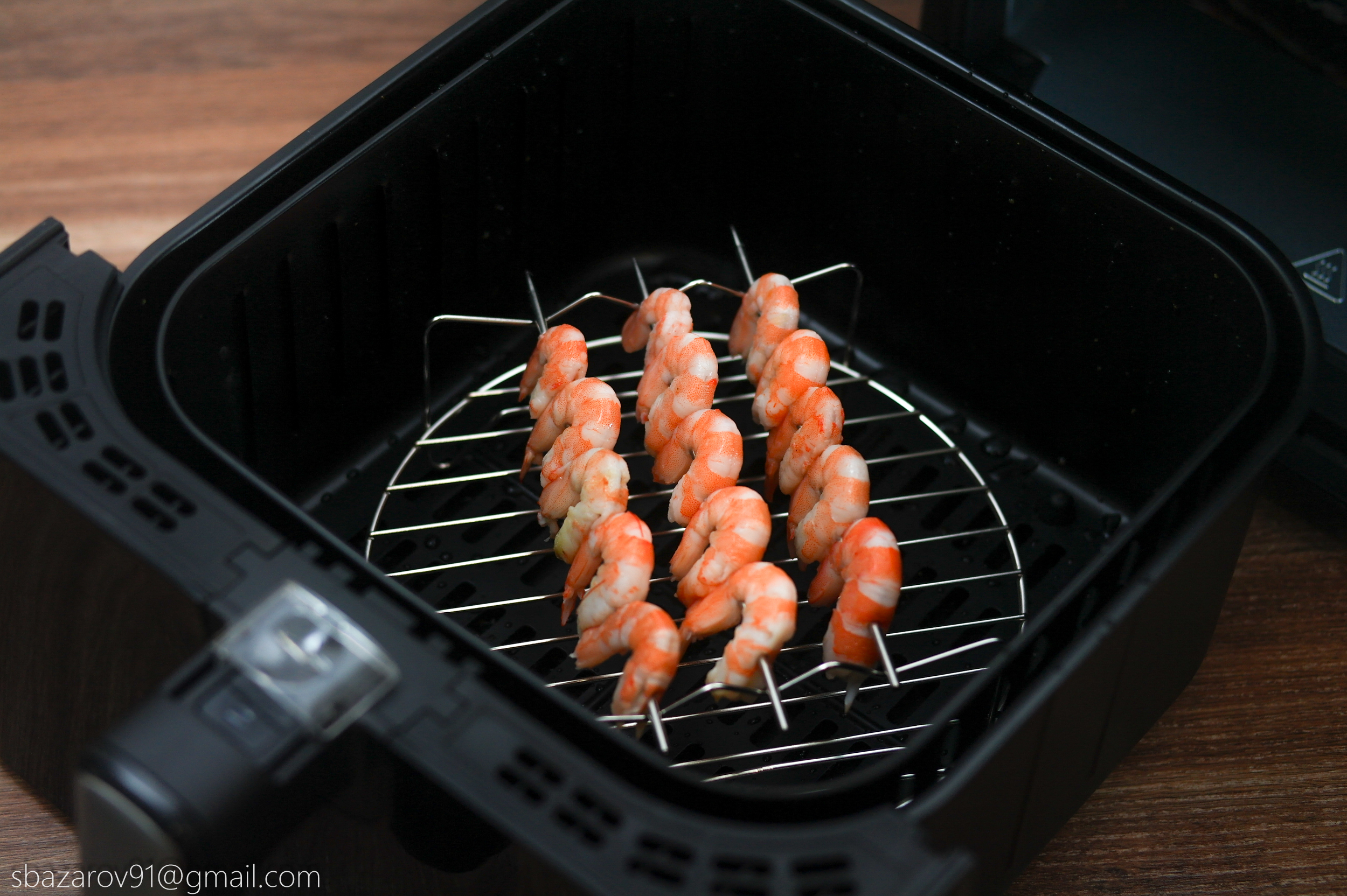 А вы знали, что креветки в аэрогриле получаются ничуть не хуже, чем на углях? Берем креветки, нанизываем на шпажки и устанавливаем на специальную решетку гриль. Для креветок есть своя программа: всего 160 градусов и 12 минут — и перед нами идеальная закуска, которая украсит любой стол. Креветки получились невероятно нежными, ароматными и их даже не хочется портить соусом. Самое главное в приготовлении креветок — минимум усилий, максимум удовольствия.