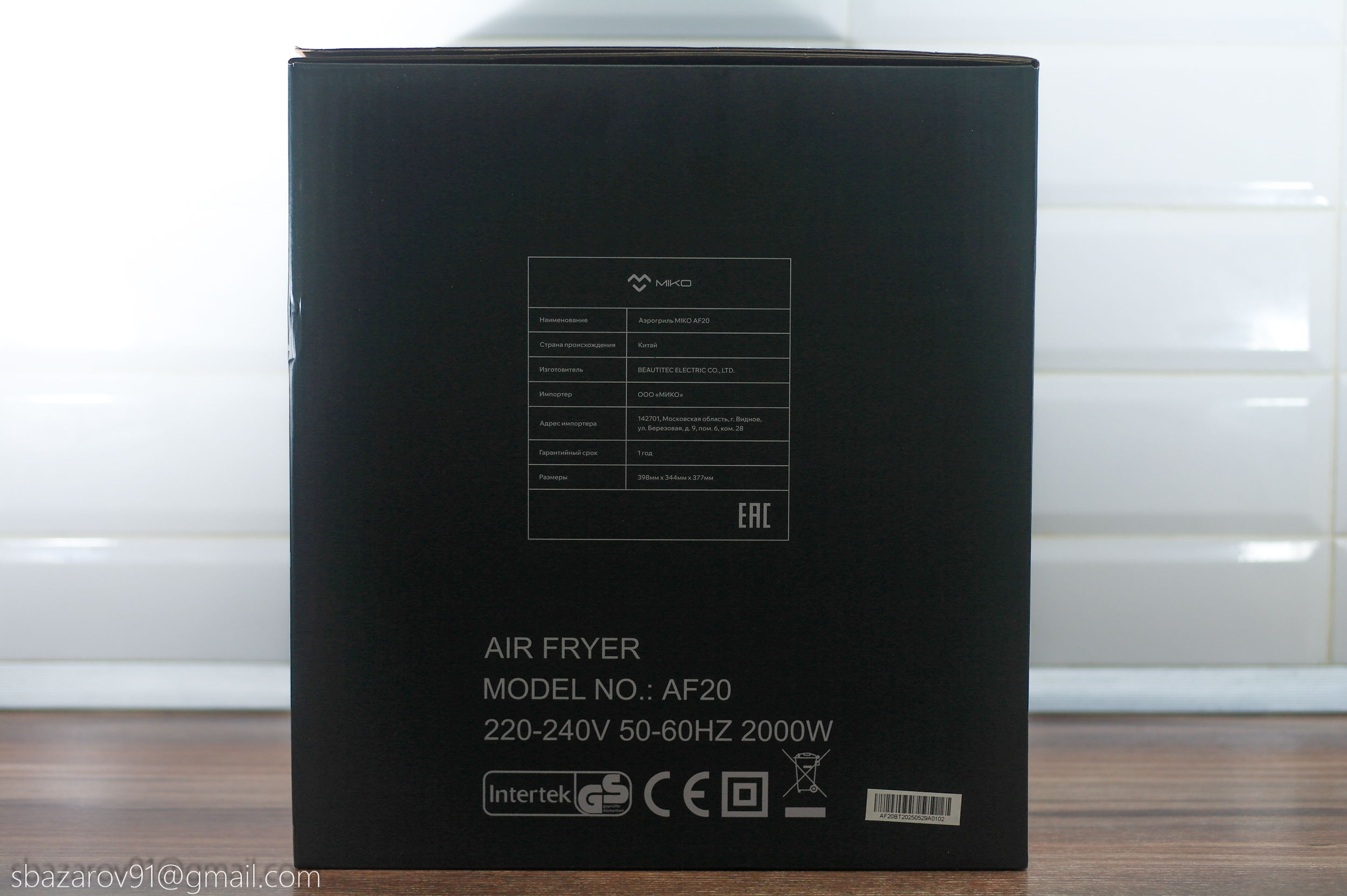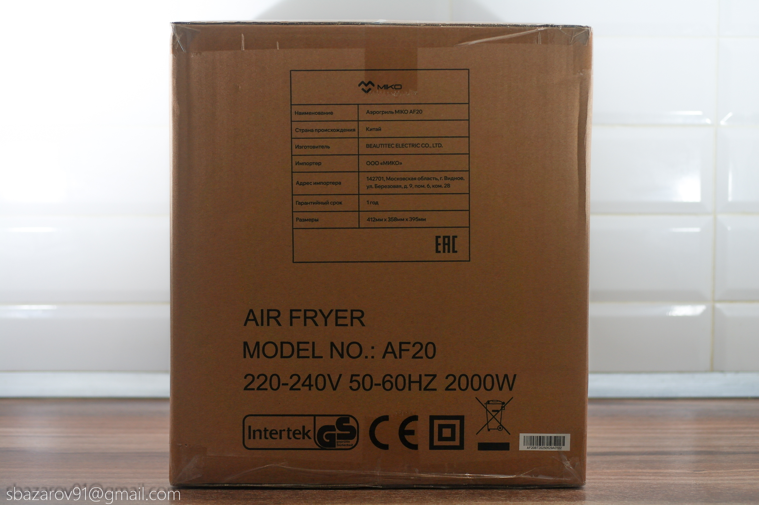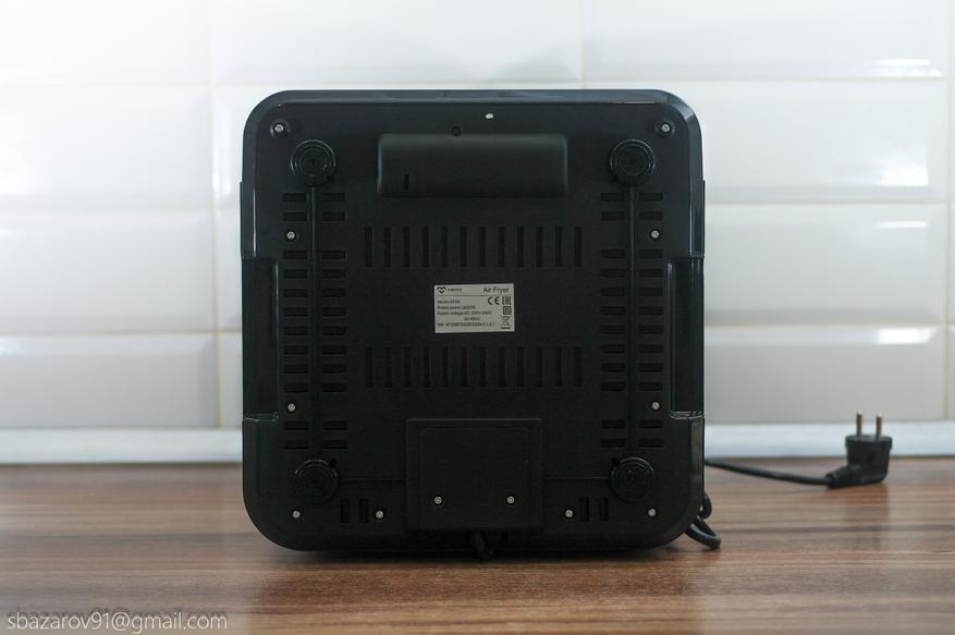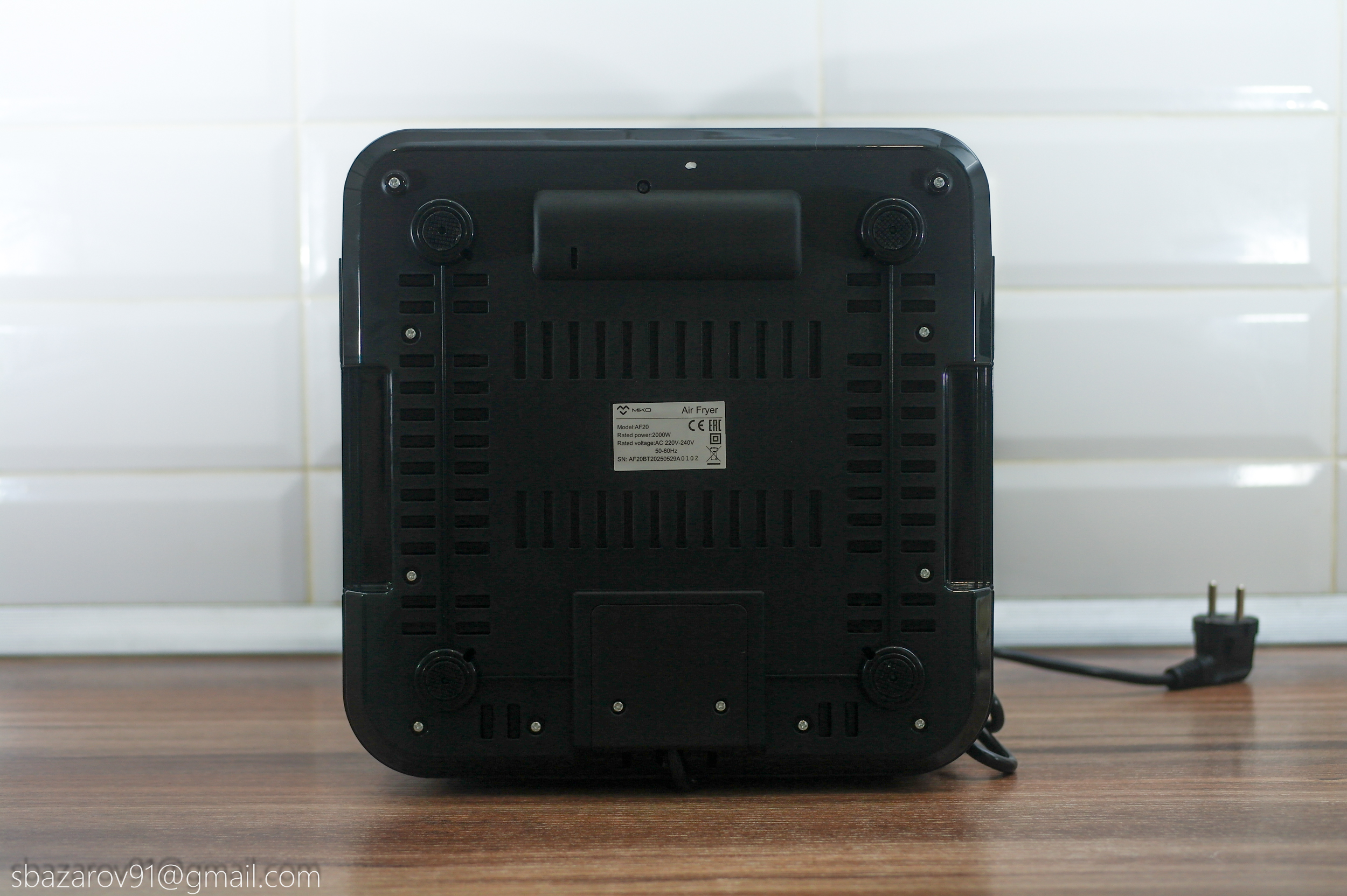 Сердцем MIKO AF20 выступает электрический тэн, расположенный над чашей. Таким образом, за счет конвекции происходит теплообмен и еда прогревается равномерно. Максимальное потребление от сети аэрогрилем составляет 2000 Вт (EU вилка длиной 100 см).