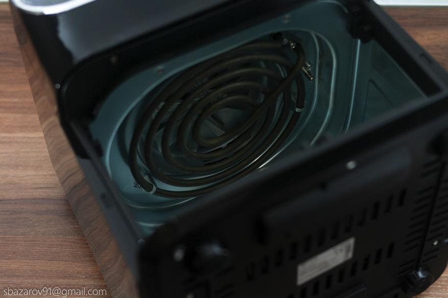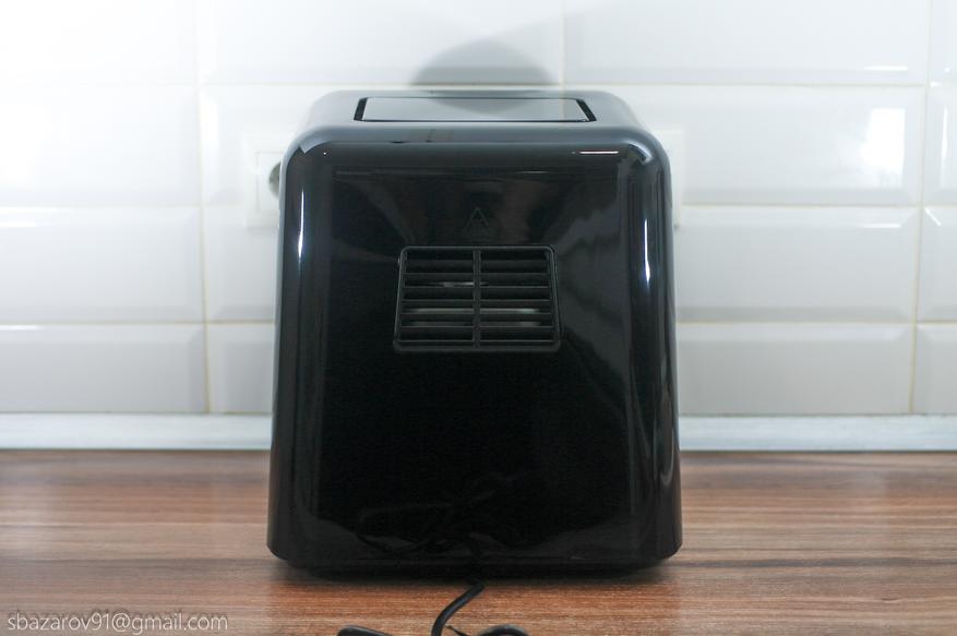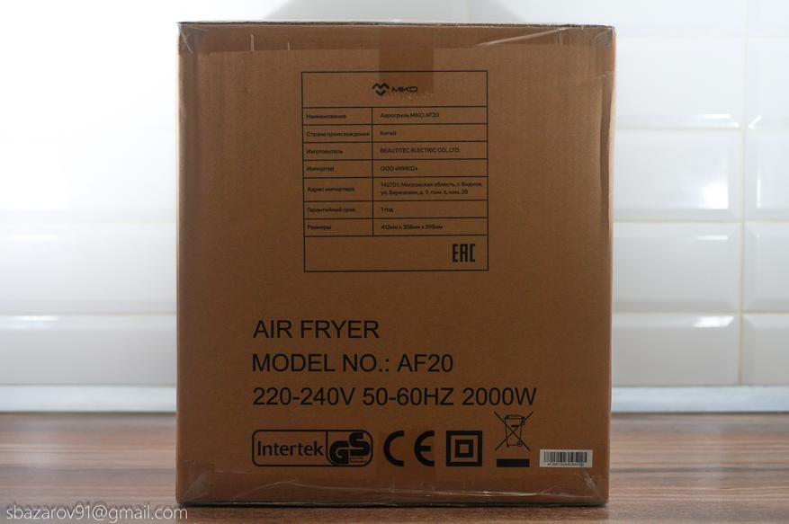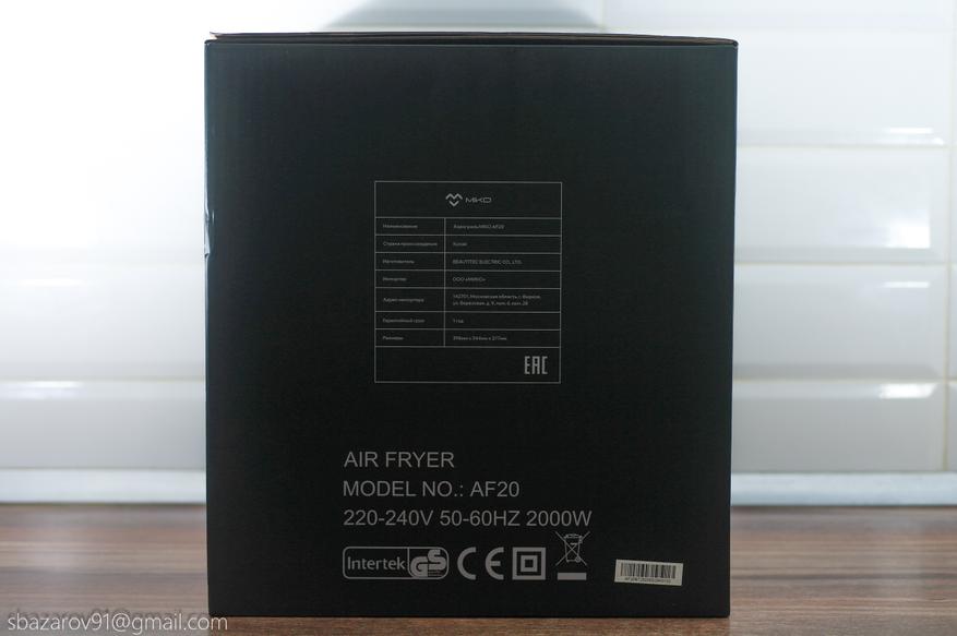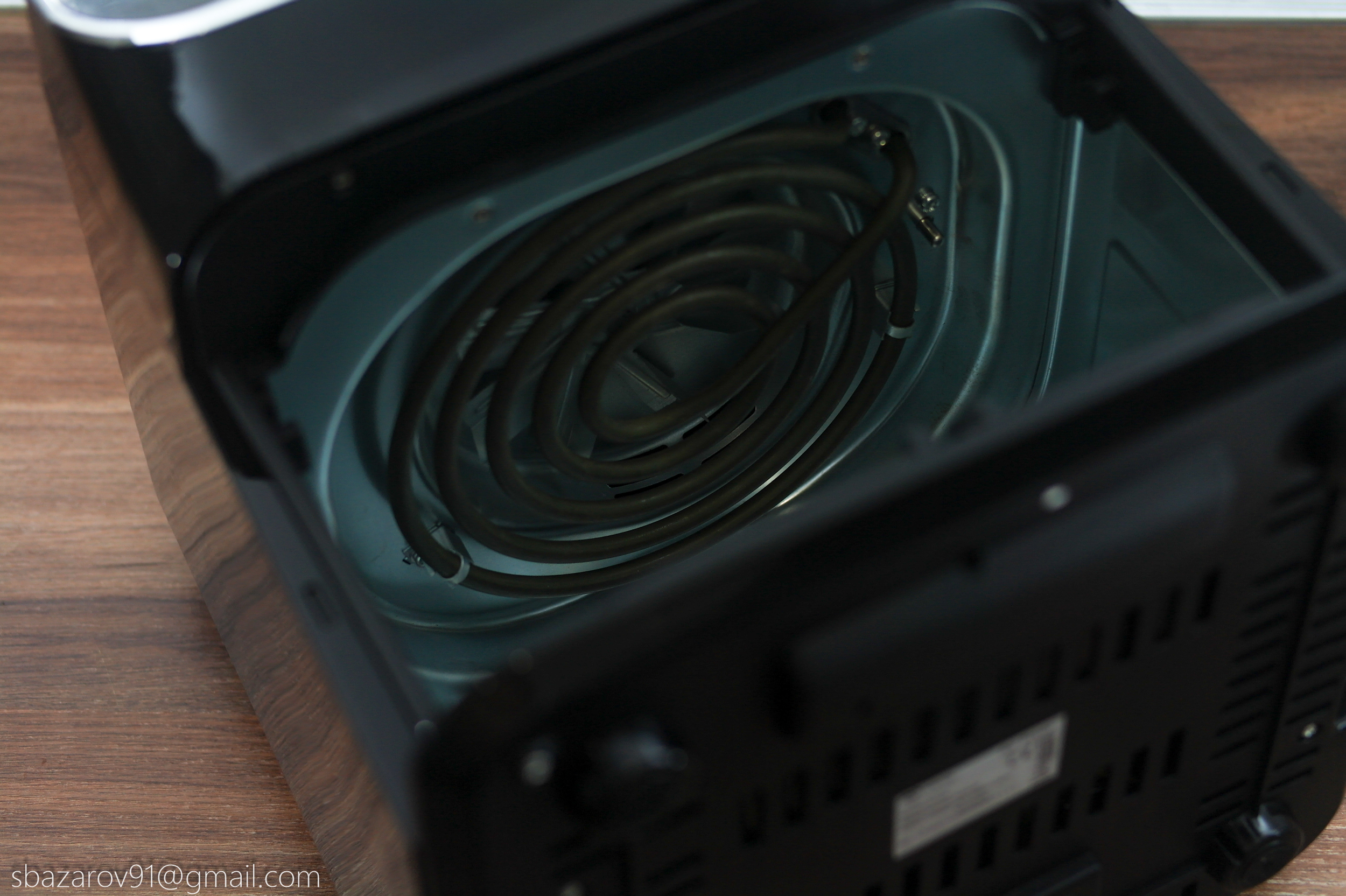 Сердцем MIKO AF20 выступает электрический тэн, расположенный над чашей. Таким образом, за счет конвекции происходит теплообмен и еда прогревается равномерно. Максимальное потребление от сети аэрогрилем составляет 2000 Вт (EU вилка длиной 100 см).