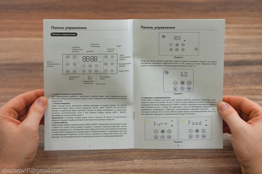 | Комплектация | основной блок -1 шт; Съемная чаша — 1 шт.; Поддон для сбора жидкости — 1 шт.; Решетка для гриля — 1 шт.; форма для запекания — 1 шт.; инструкция по эксплуатации — 1 шт., книга рецептов — 1шт |