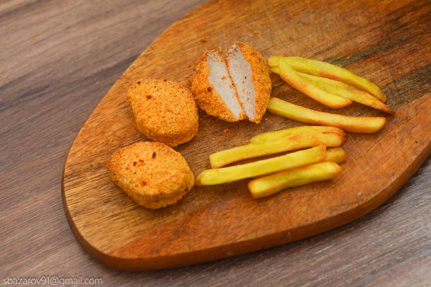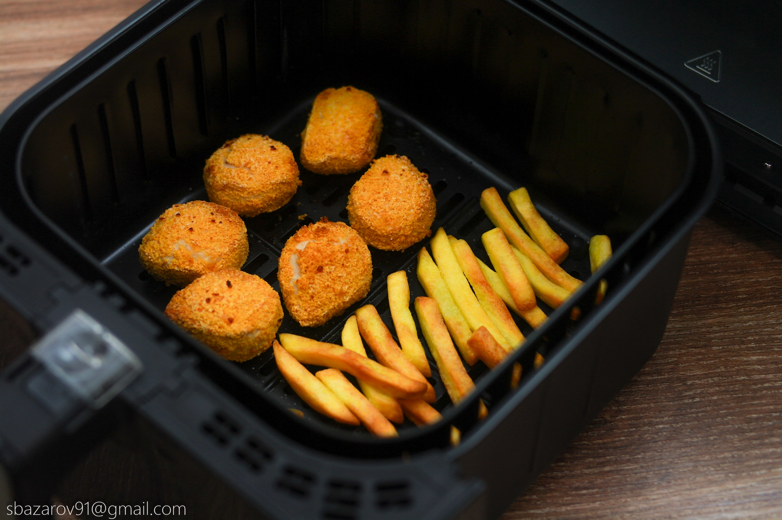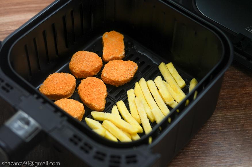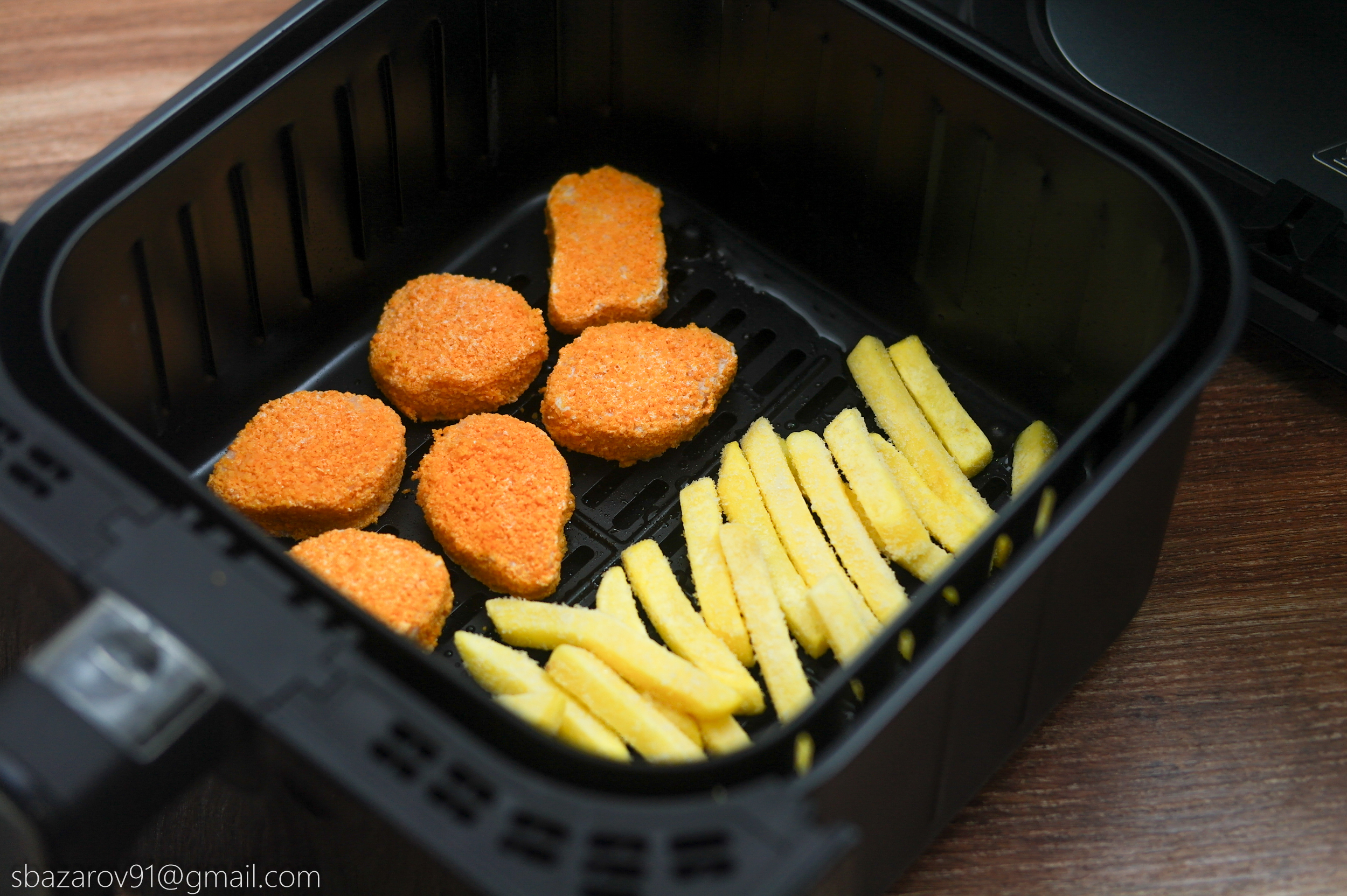 А теперь небольшой кулинарный эксперимент. В аэрогриле есть отдельный режим «Картошка фри» и мы решили проверить его универсальность. Почему бы не отправить туда одновременно картофель и наггетсы? Тем более что параметры приготовления для обоих продуктов идеально совпадают: классические 200 градусов и 18 минут. Оба продукта готовятся достаточно быстро и не требуют сложных манипуляций. Картофель получился вкусным даже без специй и добавления масла, а наггетсы — максимально нежными внутри.