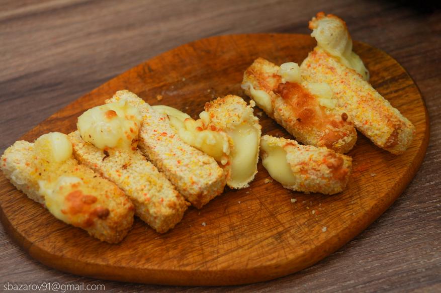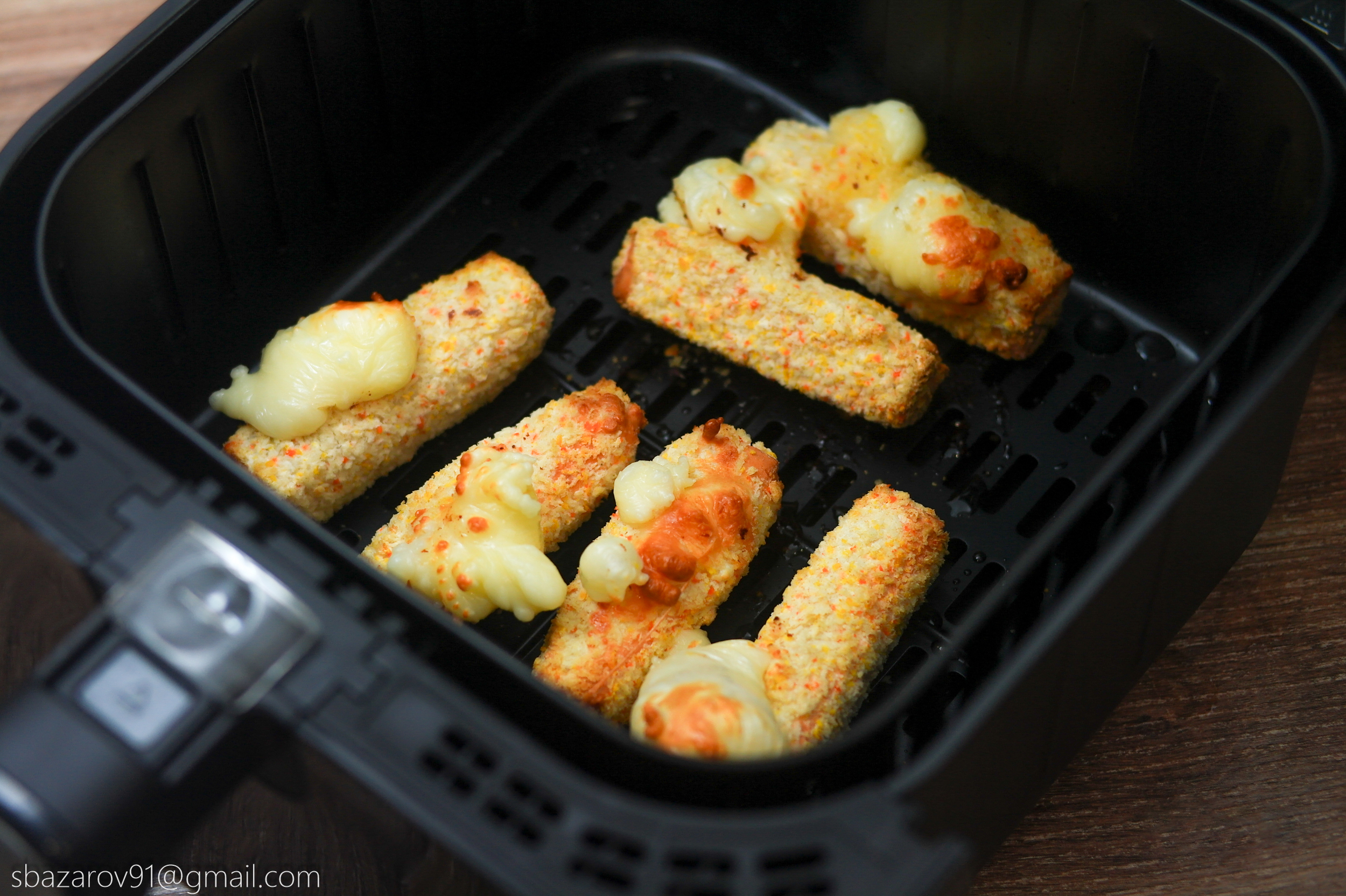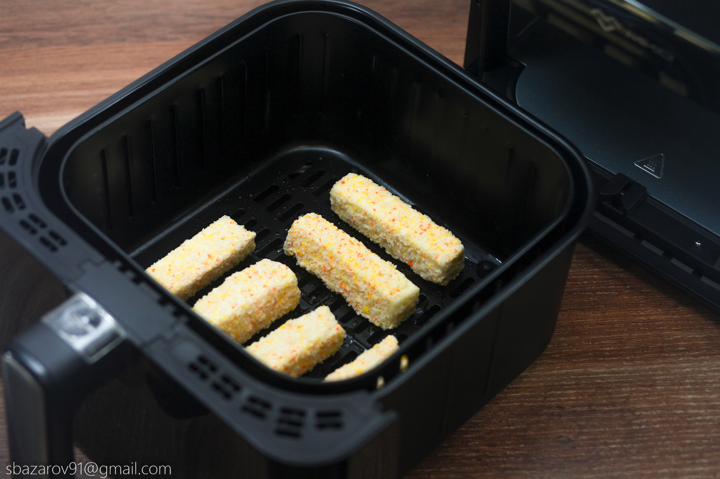 Если для купатов у нас была отдельная мясная программа, то для сырных палочек мы выбрали режим картофеля фри при 200°C. Главное здесь — не передержать, иначе сыр растечется по поддону. Всего 8 минут и перед нами идеальная закуска: сыр внутри еще не успел вытечь, но уже стал тягучим, а панировка подрумянилась до хруста. Идеальный вариант для быстрого перекуса или использование в качестве гарнира.