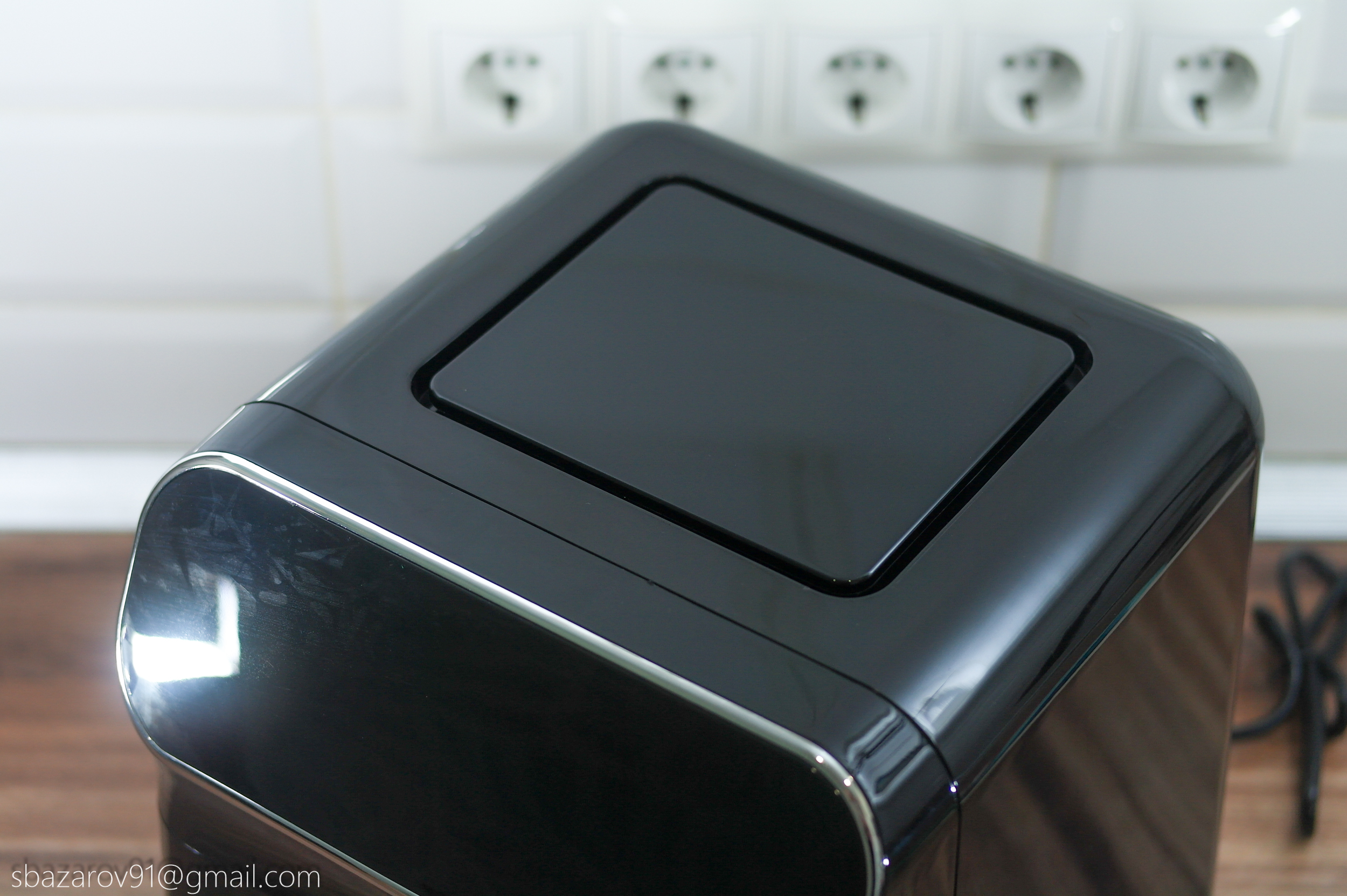 Всю переднюю панель занимает сенсорный блок. При включении аэрогриля в розетку загорается кнопка включения и он переходит в режим ожидания. Нажатие кнопки активирует всю панель, а если не трогать ее более 2-х минут, то устройство снова переходит в режим ожидания.