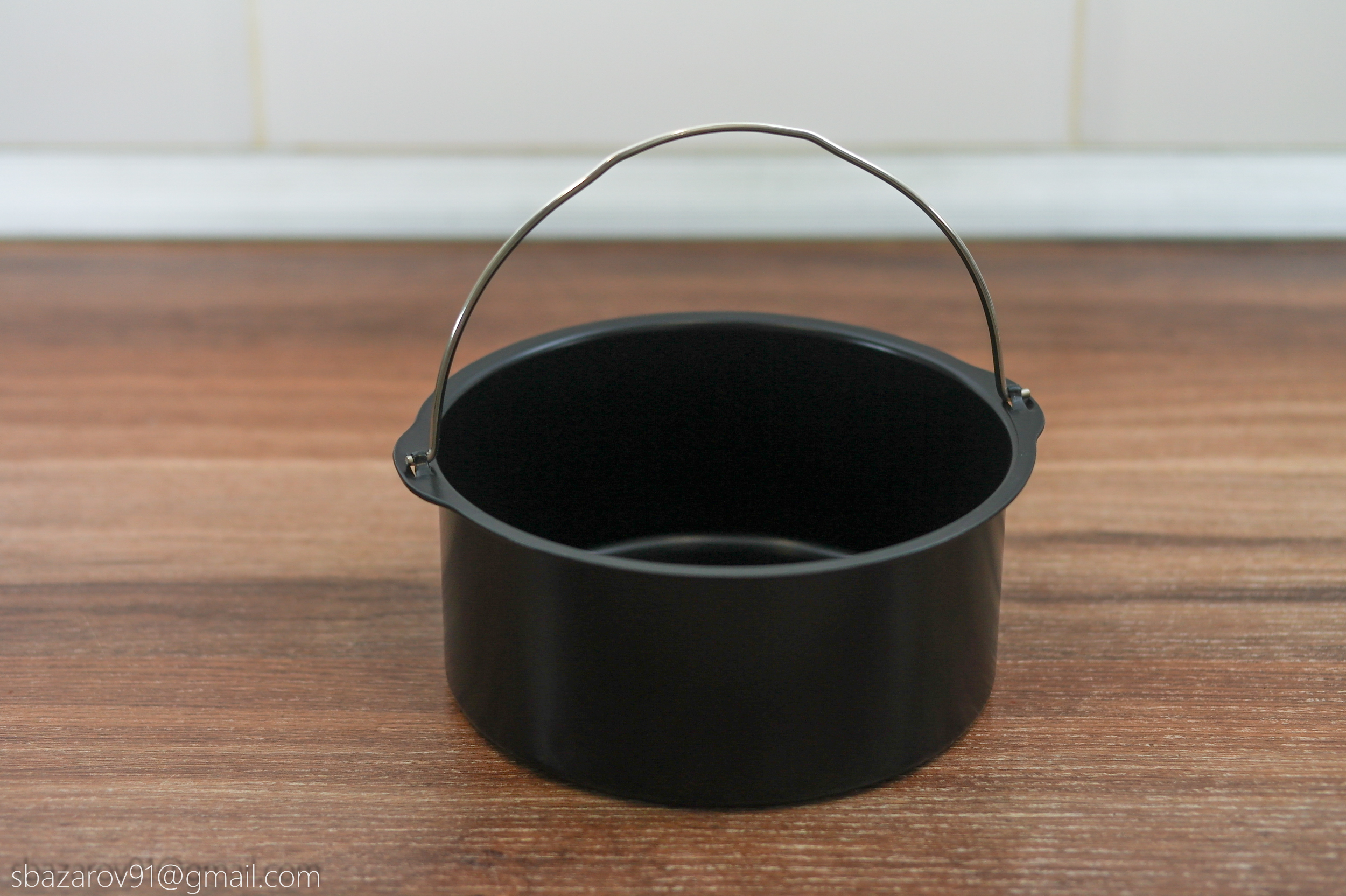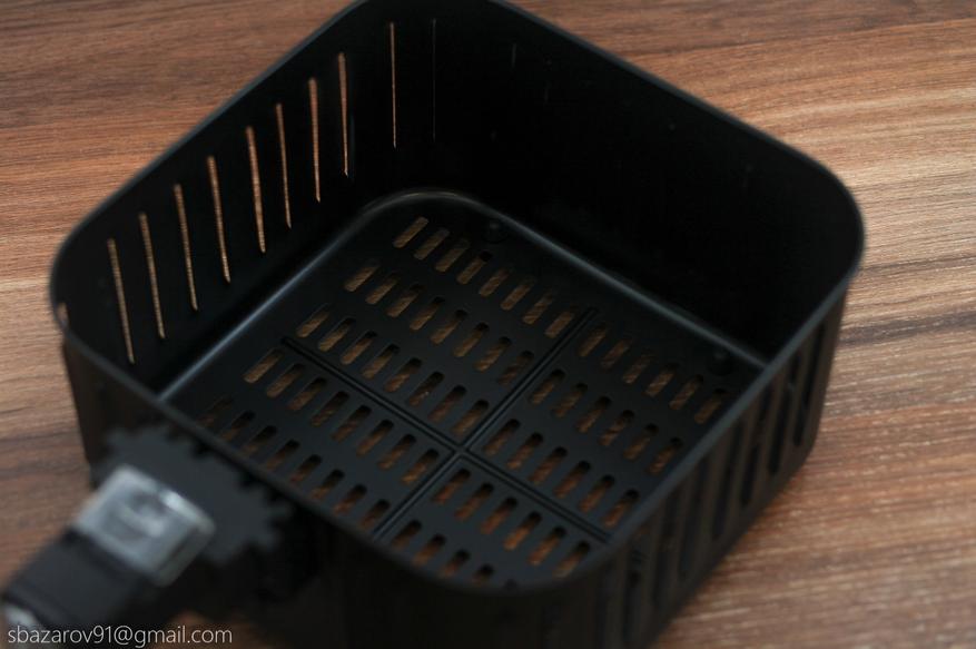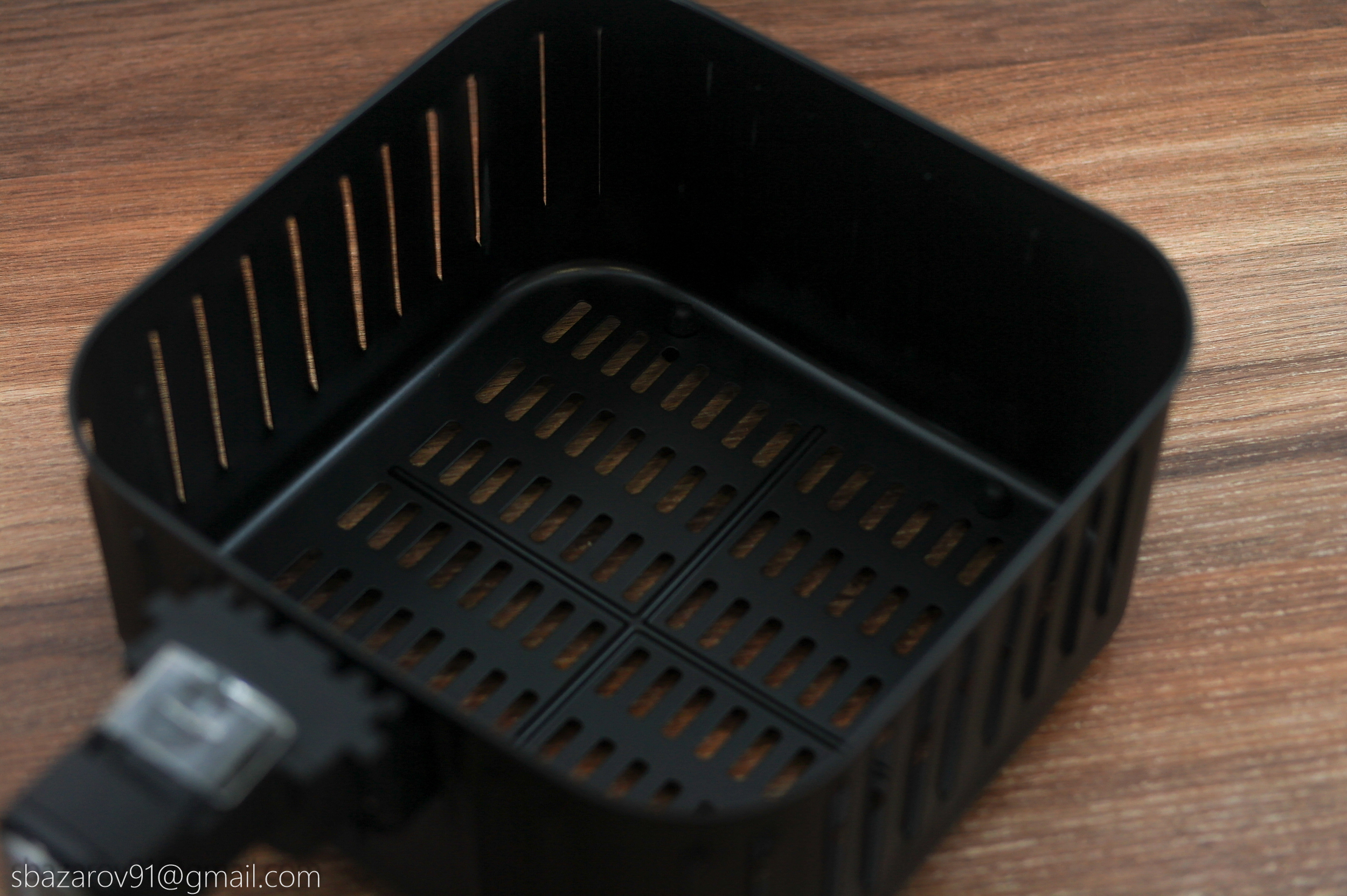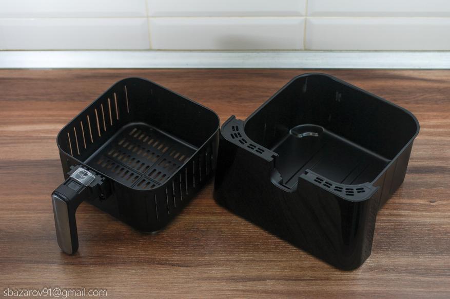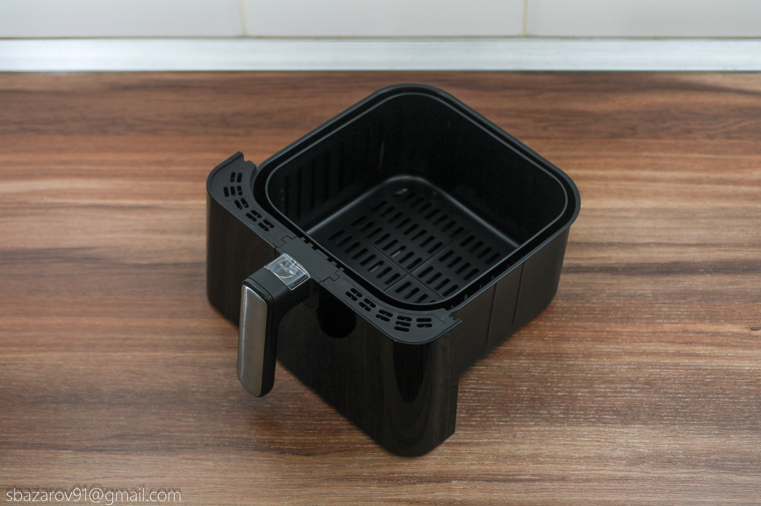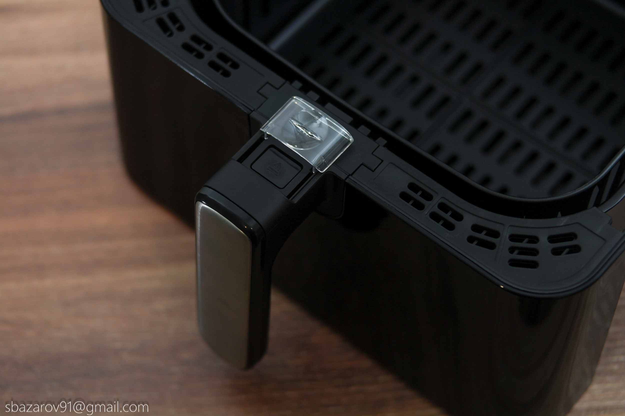 Внутри чаша на 5,5 литра, что позволяет готовить блюда на всю семью. Сама чаша двойная: внешняя, куда стекает масло и остатки пищи, и внутренняя, на которой готовится сама пища. В большинстве аэрогрилей используется внешняя решетка гриль, тогда как в MIKO AF20 пошли дальше и сделали конструкцию гораздо удобнее. Чем же, спросите вы? На корпусе чаши есть защитный колпачок: если сдвинуть его, открывается доступ к кнопке, благодаря которой обе чаши разъединяются и моются по отдельности в посудомоечной машине. Сама чаша и решетка гриль с антипригарным покрытием.