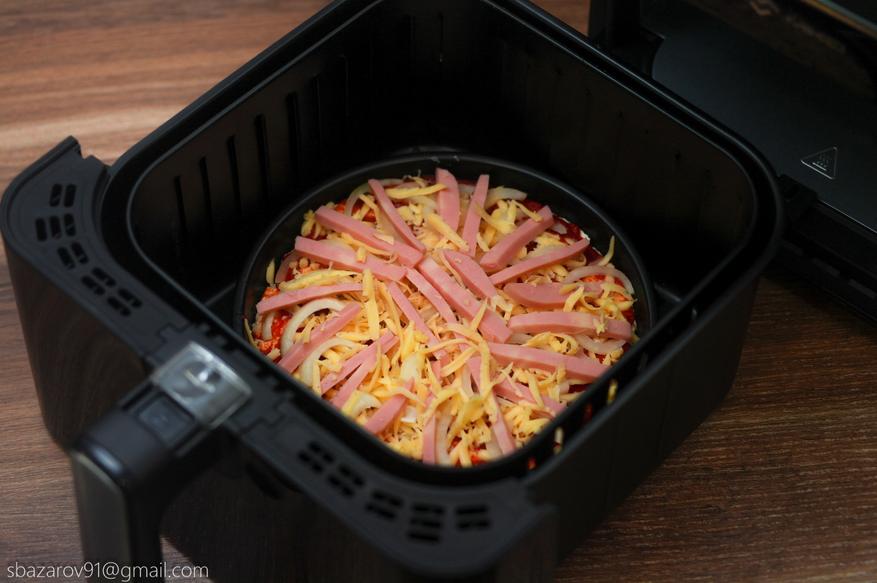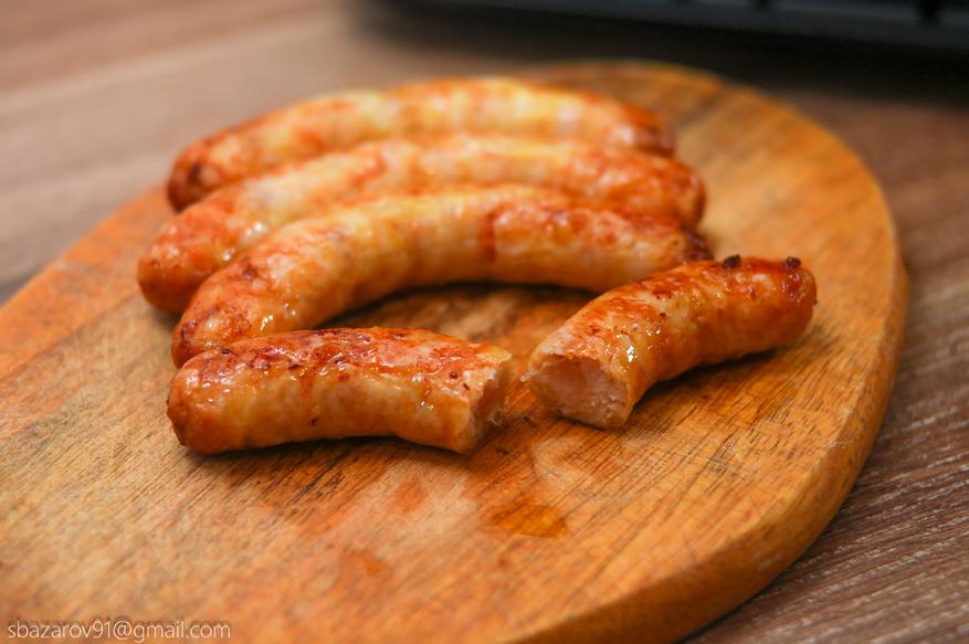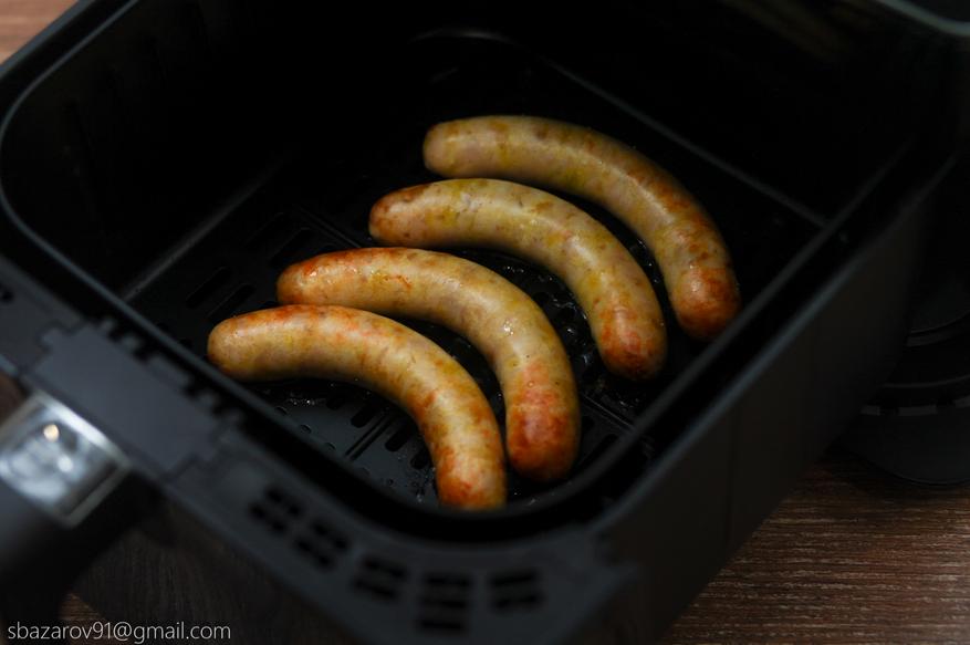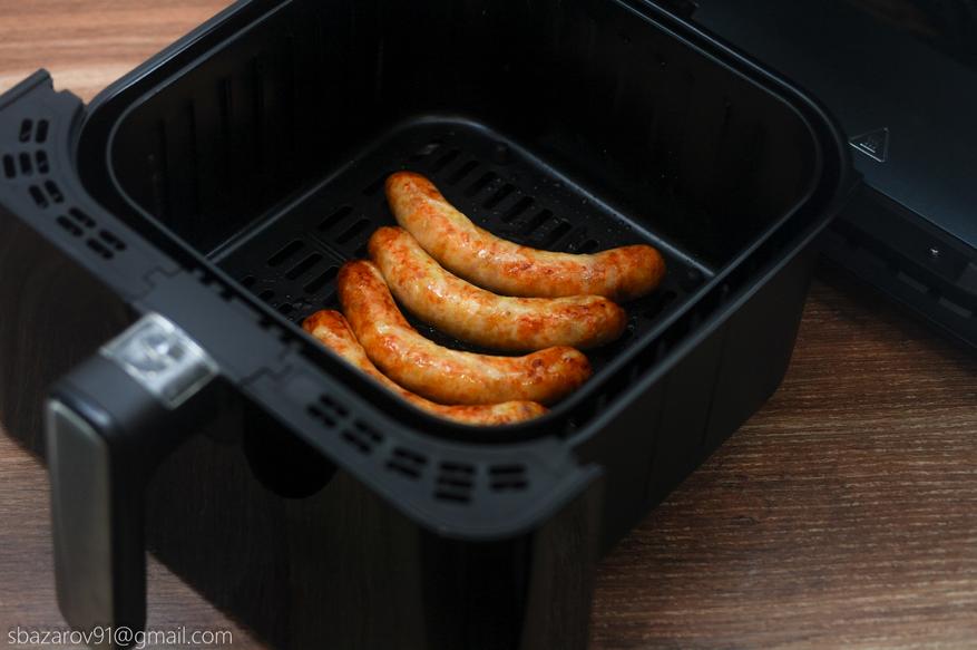 Первое блюдо, которое мы приготовим — куриные купаты. Для них в аэрогриле предусмотрена отдельная программа: готовятся они 18 минут при 200°C. Приятный бонус от автоматики — напоминание. Практически на середине приготовления (через 10 минут) раздастся сигнал и появится сообщение о том, что купаты лучше перевернуть. Это гарантия того, что они прожарятся равномерно. На выходе получаем то, что и хотели: хрустящую корочку и очень мягкое, сочное мясо внутри.