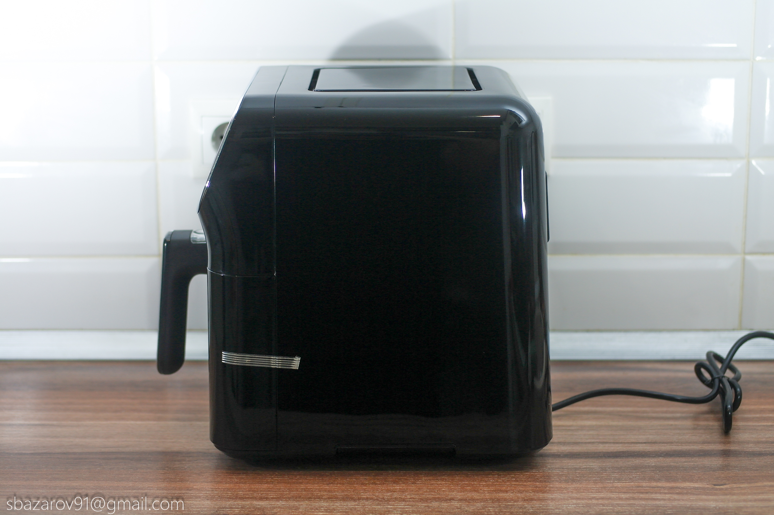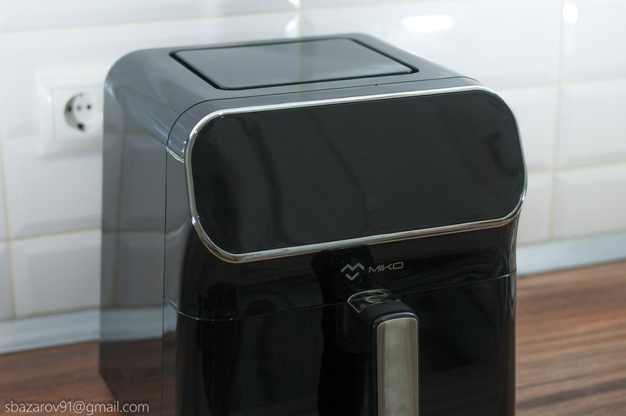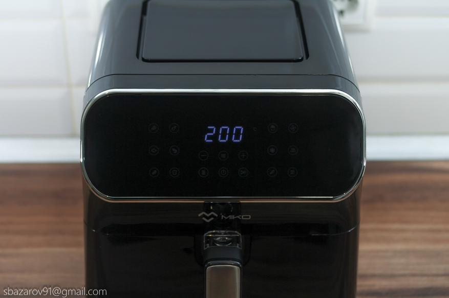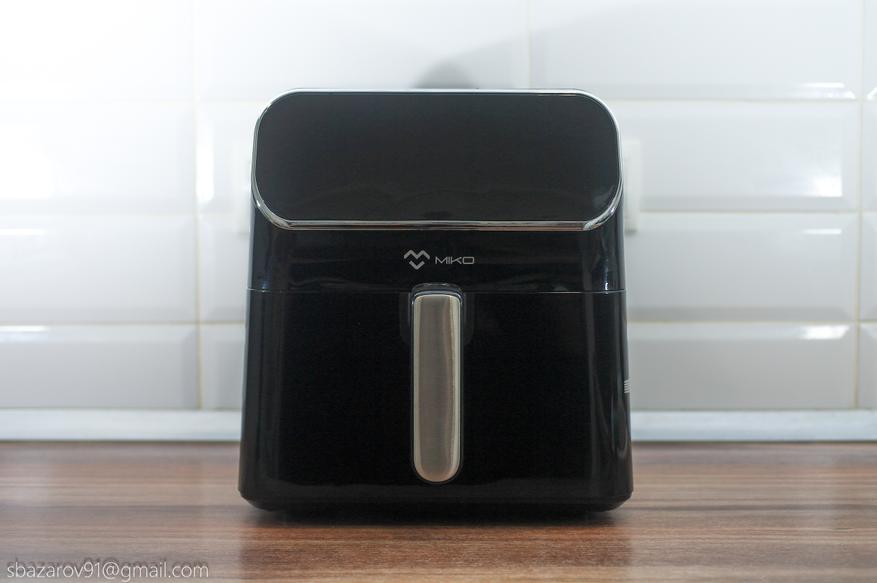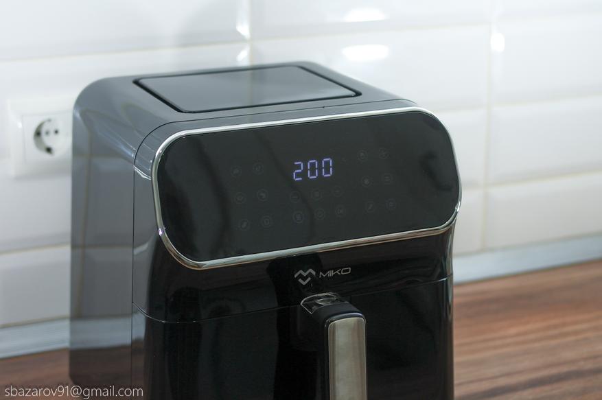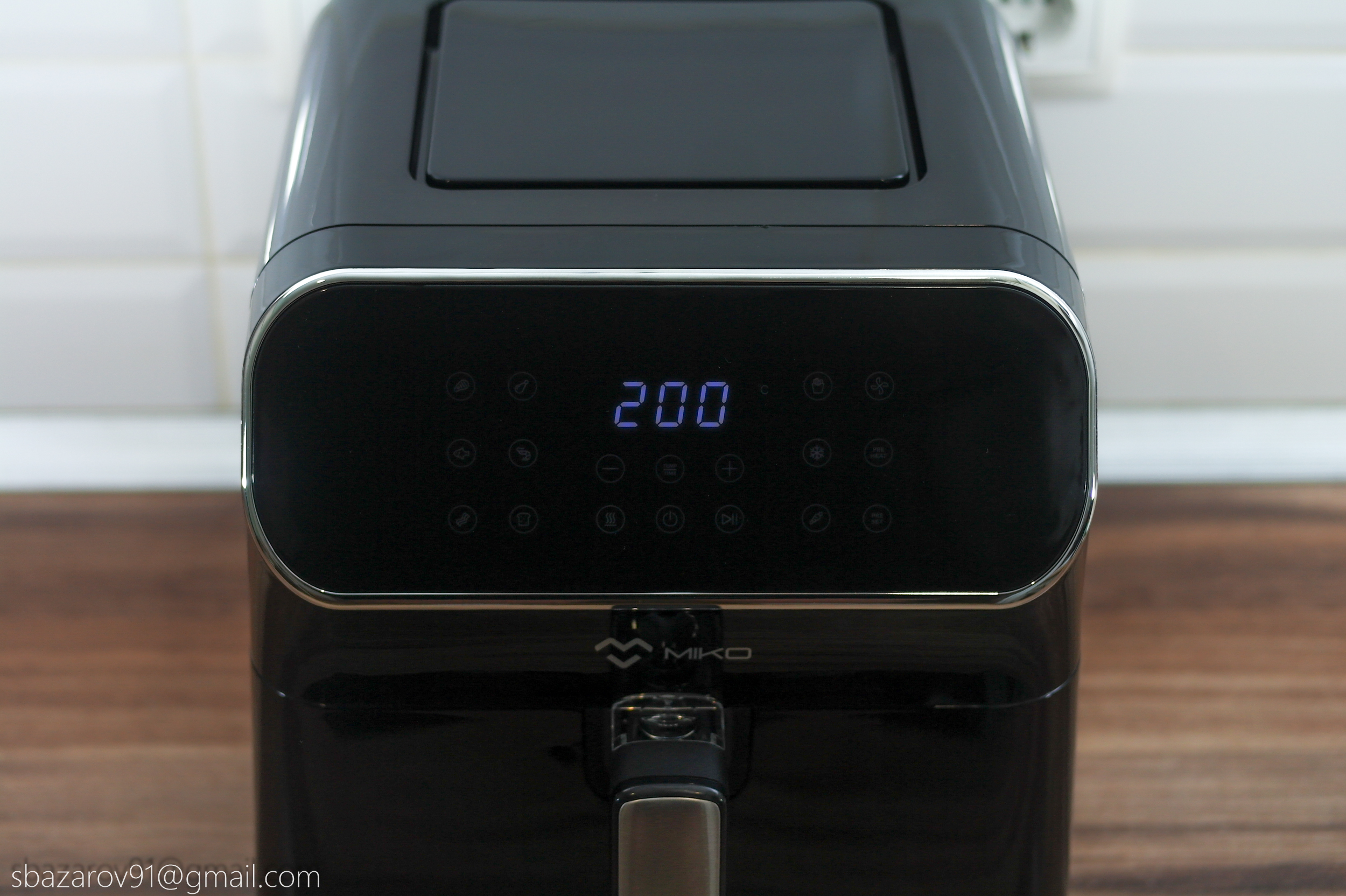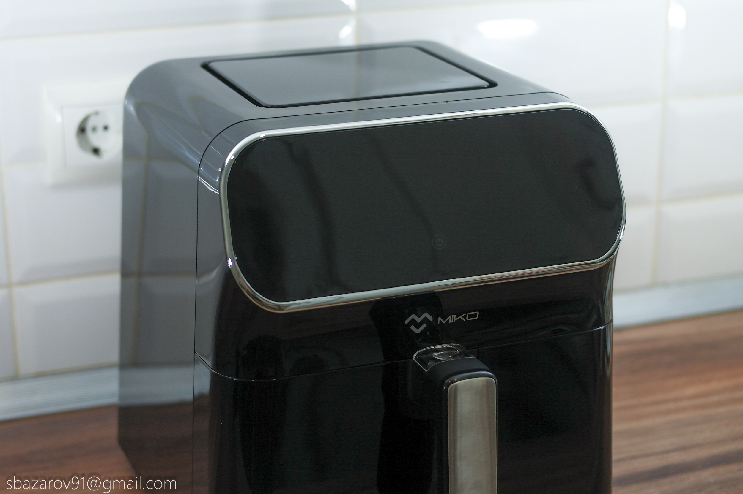 Аэрогриль MIKO AF20 — создан для уютных вечеров, чтобы вы могли «вкусно» скоротать время. Выглядит стильно, черная минималистичная башня с сенсорным блоком управления в верхней части. Что примечательно, уведомит вас звуковым сигналом и текстом на дисплее о том, что продукт стоит перевернуть для достижения лучшей прожарки. По габаритам всё просто — 398x344x377 мм, места на кухне займет не больше, чем половина микроволновки (глубина аэрогриля с учетом выпирающей ручки 360 мм).