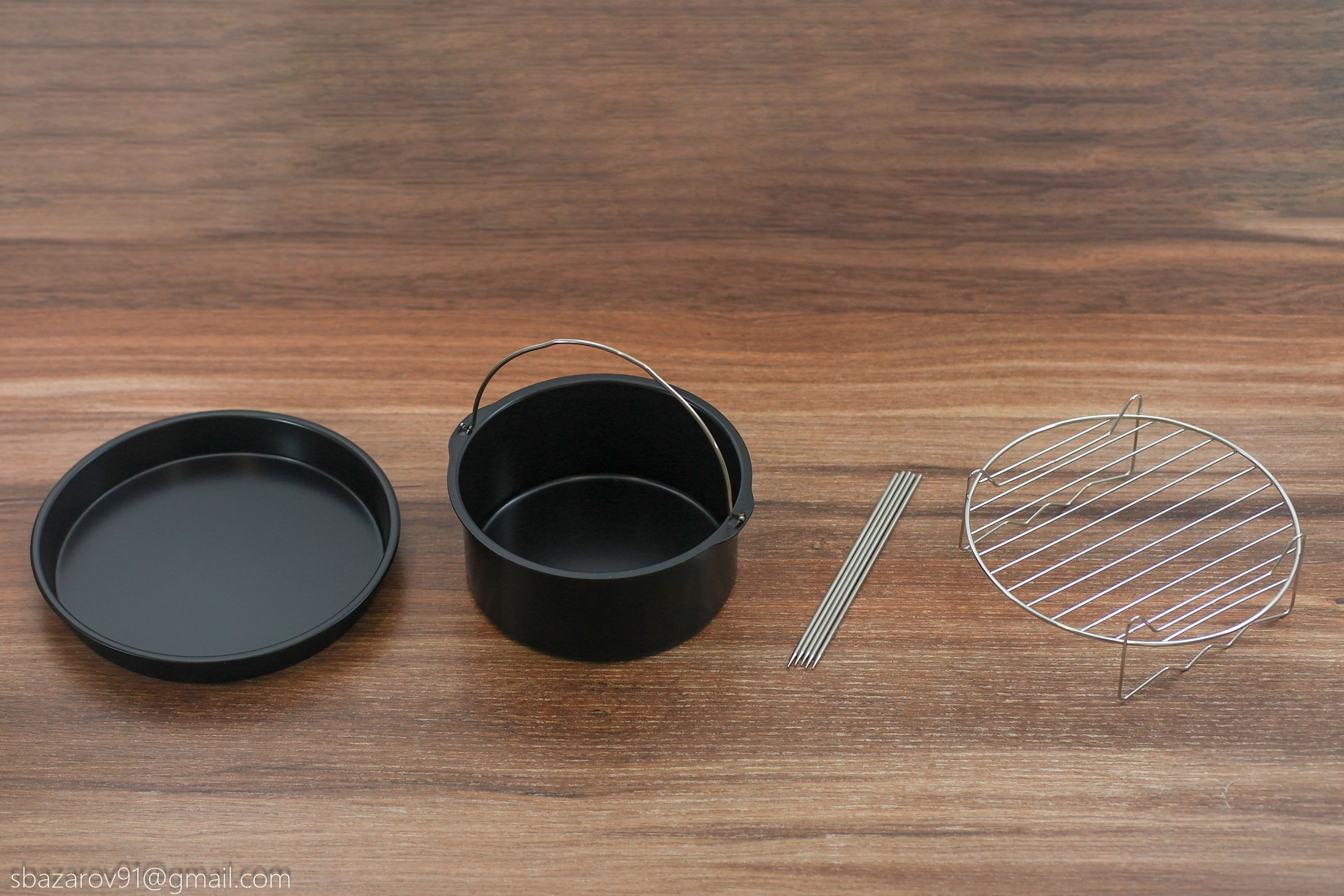 Еще хочется отметить богатую комплектацию, которая радует разнообразием: форма для выпечки, котелок, шпажки и решетка для гриля. Всё это не лишние элементы, а реально рабочие инструменты, которыми можно пользоваться каждый день.
