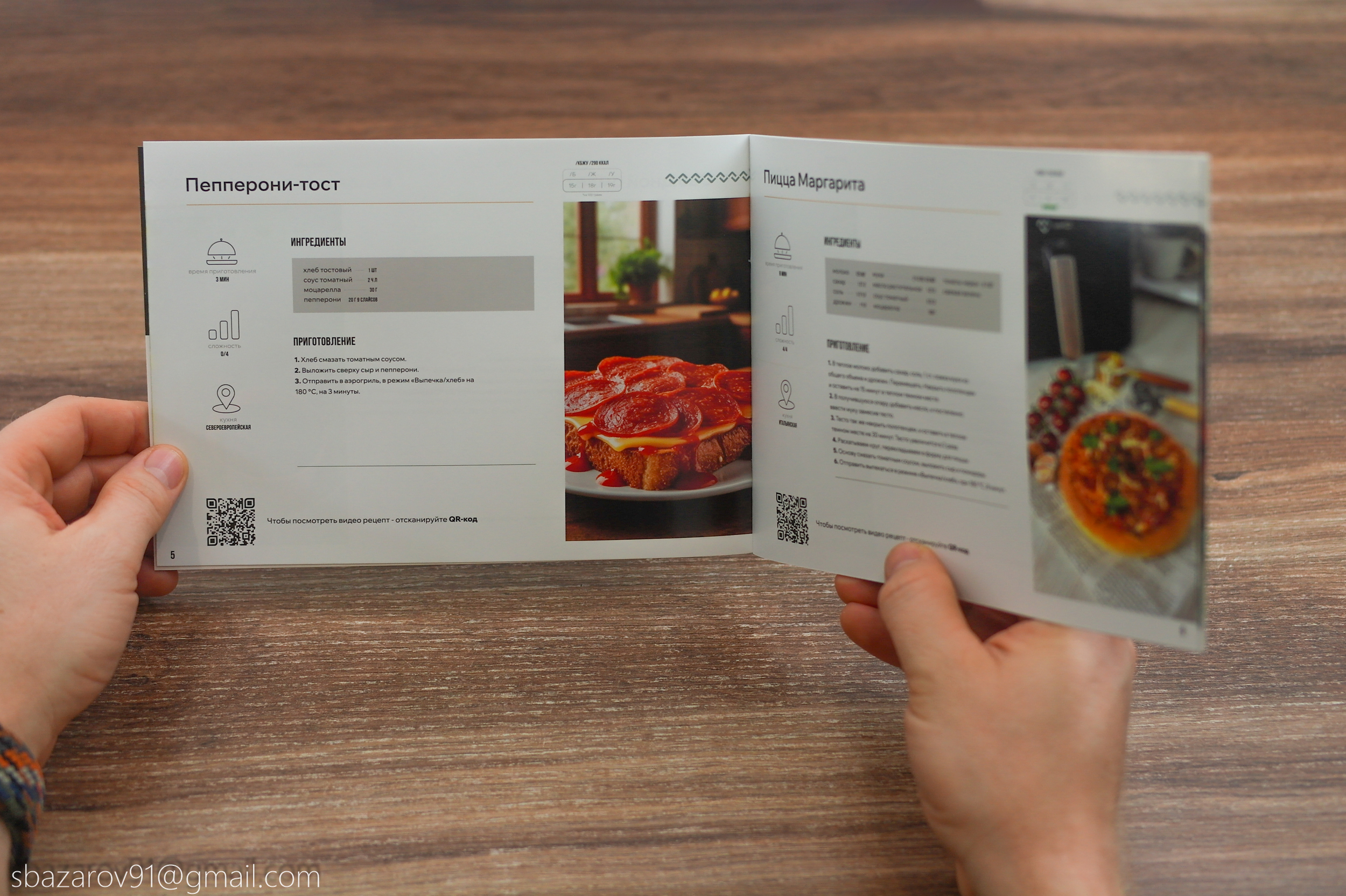 Внутри — аэрогриль, помещенный в пенопластовые вставки и пара буклетов, лежащих рядом: руководство по эксплуатации и книга рецептов.