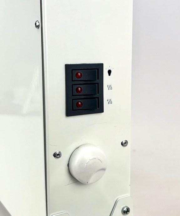 Мощность обогревателя 1500 Вт, но он может работать и в режиме половины мощности. На боку три выключателя — два включают две «половинки» нагревательного элемента (если включён любой один, мощность нагрева 750 Вт, когда оба — 1500 Вт), третий включает режим рециркулятора (включается лампа и вентиляторы). Ниже — ручка механического термостата, позволяющая регулировать температуру в помещении.