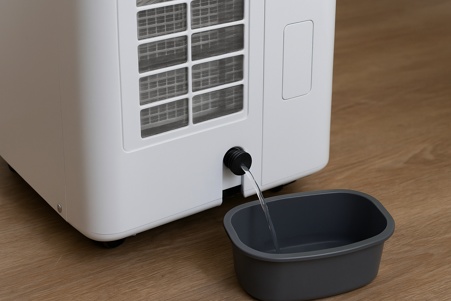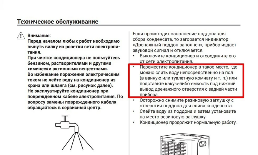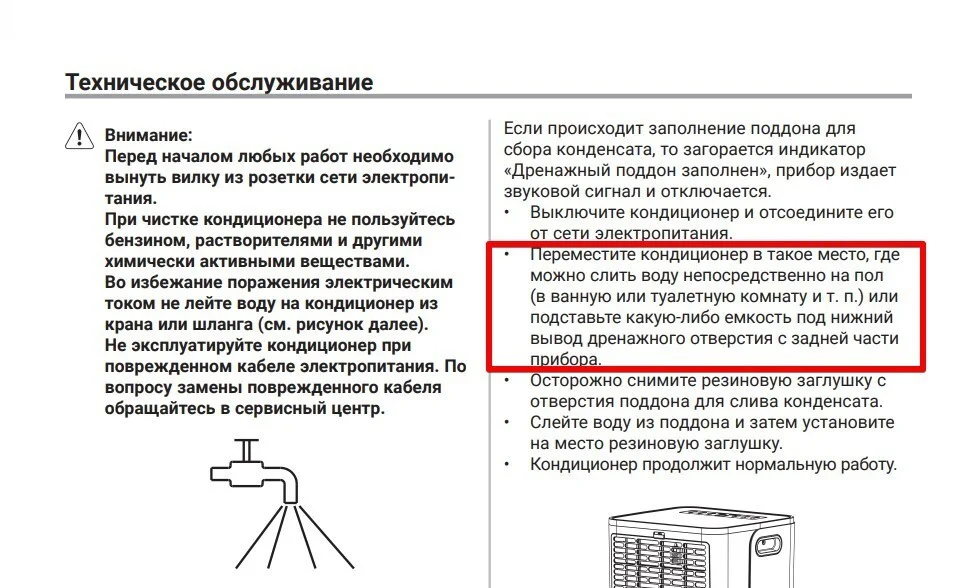 Сливное отверстие часто расположено внизу, и поставить под него ёмкость — тот ещё квест. Иногда проще откатить кондиционер в ванную и слить воду в пол. Или подставить пятилитровую баклажку и следить, чтобы не перелилась.