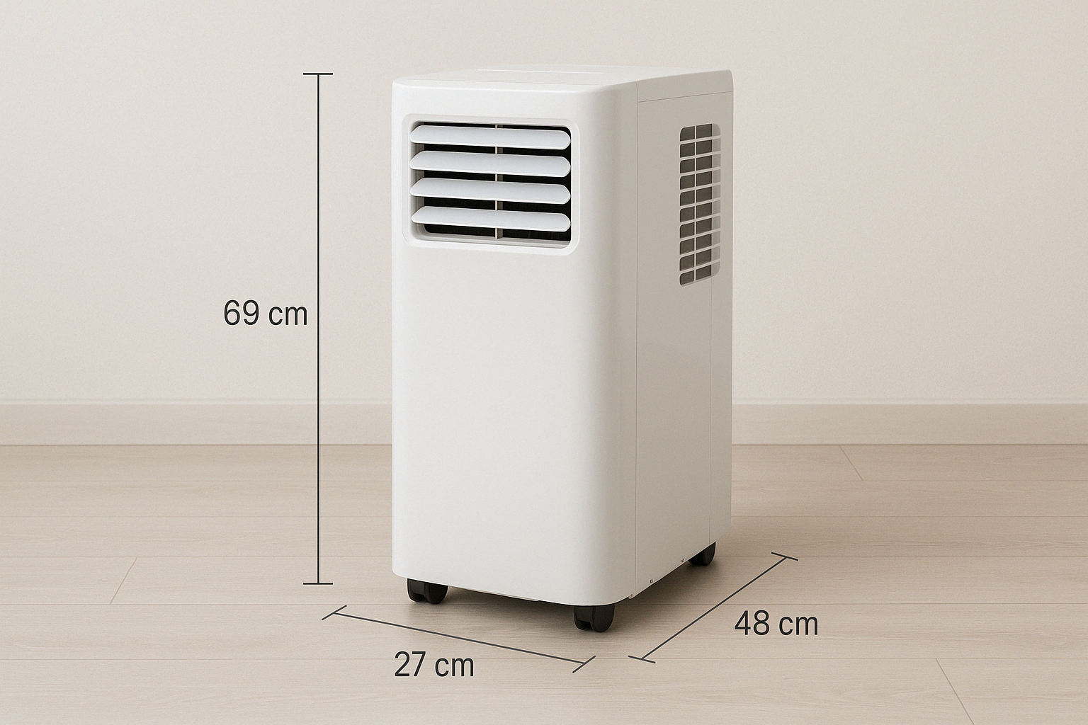 Мобильный кондиционер — это не кубик на колёсиках. Это большой пластиковый блок с выступами, трубой, шлангом и емкостью для воды. Он требует места. В маленькой комнате он будет мешаться. Плюс — его надо ставить недалеко от окна и розетки.