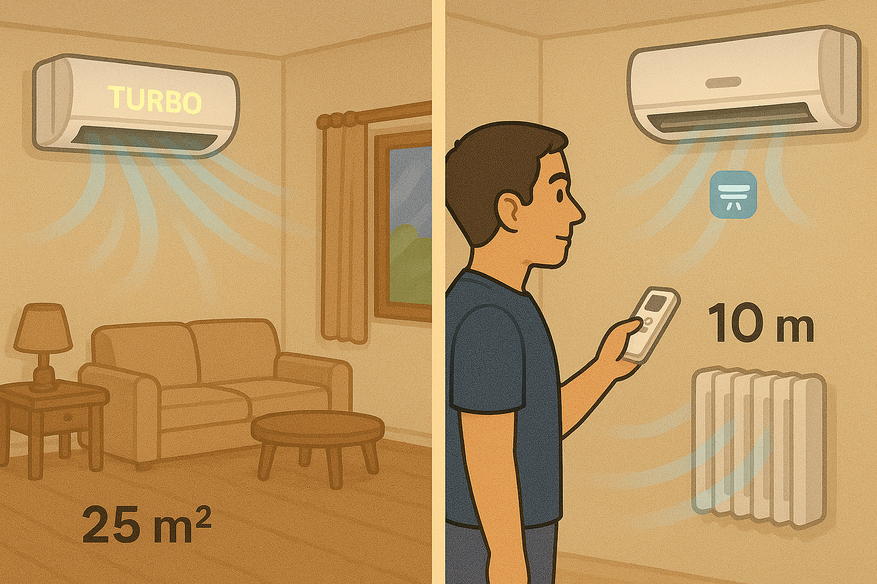 Турборежим позволяет быстро охладить или прогреть помещение. Особенно полезен в больших помещениях или если только пришли домой и нужно срочно освежить воздух. Но в маленькой комнате (до 10-12 м²) такой «форсаж» особо ни к чему, как показывает практика, там и обычный режим справится быстро.