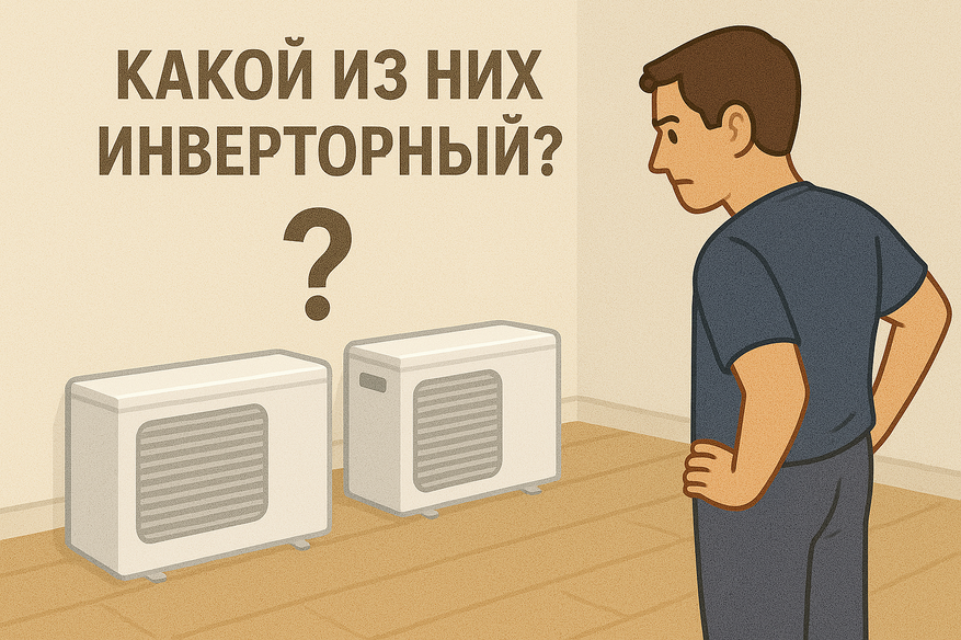Снаружи инверторный и обычный кондиционеры выглядят одинаково — два блока: один в комнате, второй на улице. Но суть в начинке. Главное отличие — как именно управляется компрессор. У инверторных он работает гибко, а не в режиме «вкл/выкл». И обычно на корпусе она подписана: «inverter».
