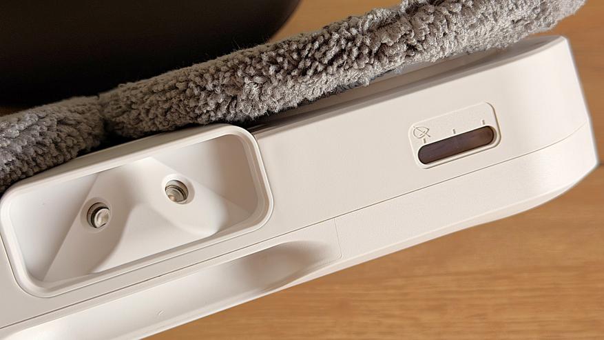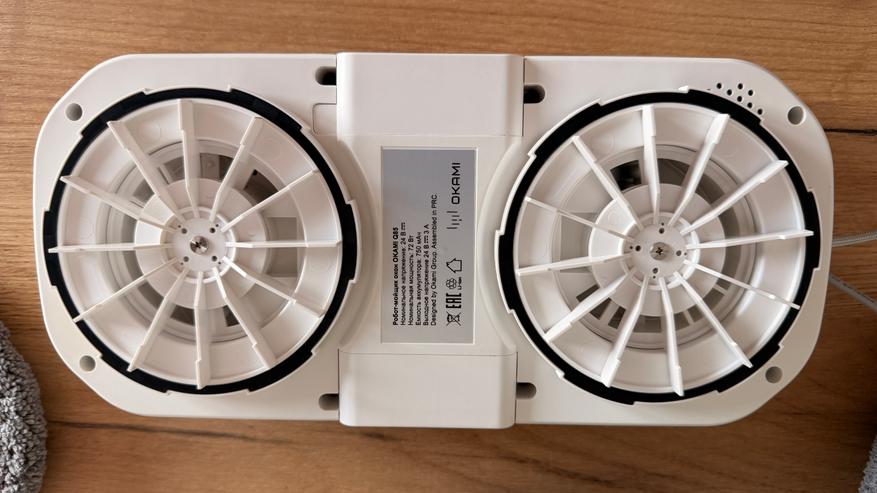 Сверху виден логотип бренда, а также кнопка с подсветкой статуса работы. Также заметна заливная горловина для воды или моющего средства с резиновой заглушкой. Снизу в собранном виде видны только салфетки моющих дисков.