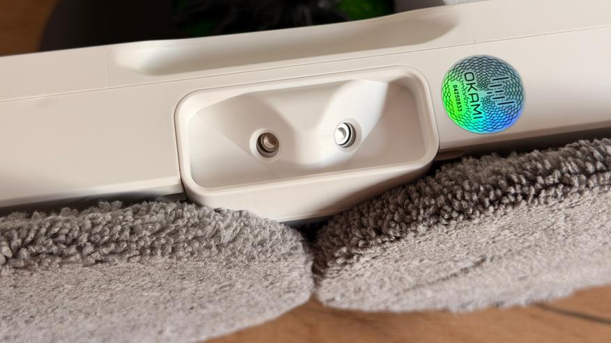 Ниже более детальные фотографии. Окно для проверки уровня воды или средства прозрачное, пользоваться привычно. Распылители при помощи особой формы выступов в корпусе направлены так, чтобы каждый мог направить струю воды по направлению движения робота и смочить конкретный моющий диск.