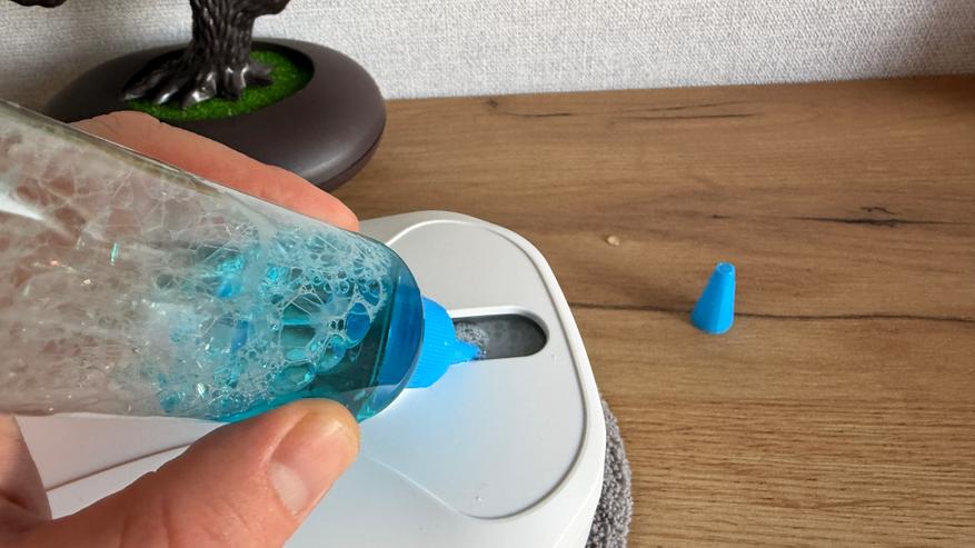 Для начала работы требуется только набрать воду или моющее средство в контейнер через заливную горловину. Сделать это просто при помощи комплектной емкости. В качестве дополнительного эксперимента, я использовал просто средство для мойки окон, не разбавляя его водой.