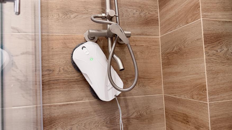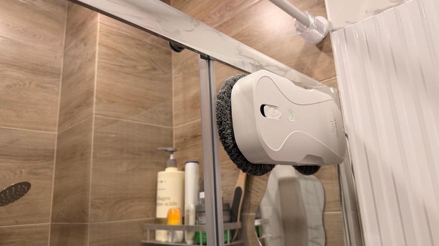 Дополнительно нагрузим робот мойщик окон бытовыми проблемами, которые просто лень делать самому. Он так спокойно обходит кафель в ванной, где есть доступ, стекла душевой кабинки и большие зеркала. Робот прекрасно находит границы зоны уборки, не только упираясь в рамки. Устройство автоматически определяет, что закончилась зона уборки, по пропаданию давления на одном из дисков и возвращается обратно. Например, на фотографии ниже видно, что он находит край душевой кабинки, чуть выглядывая за ее пределы, и возвращается в зону уборки.