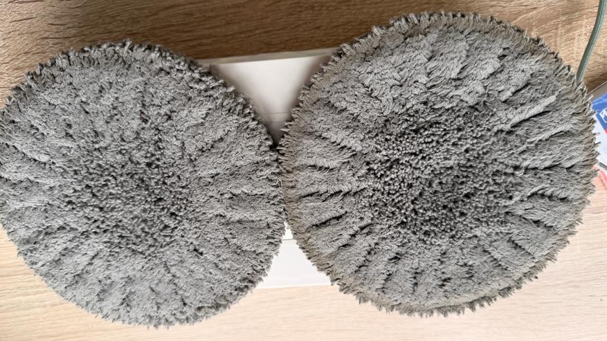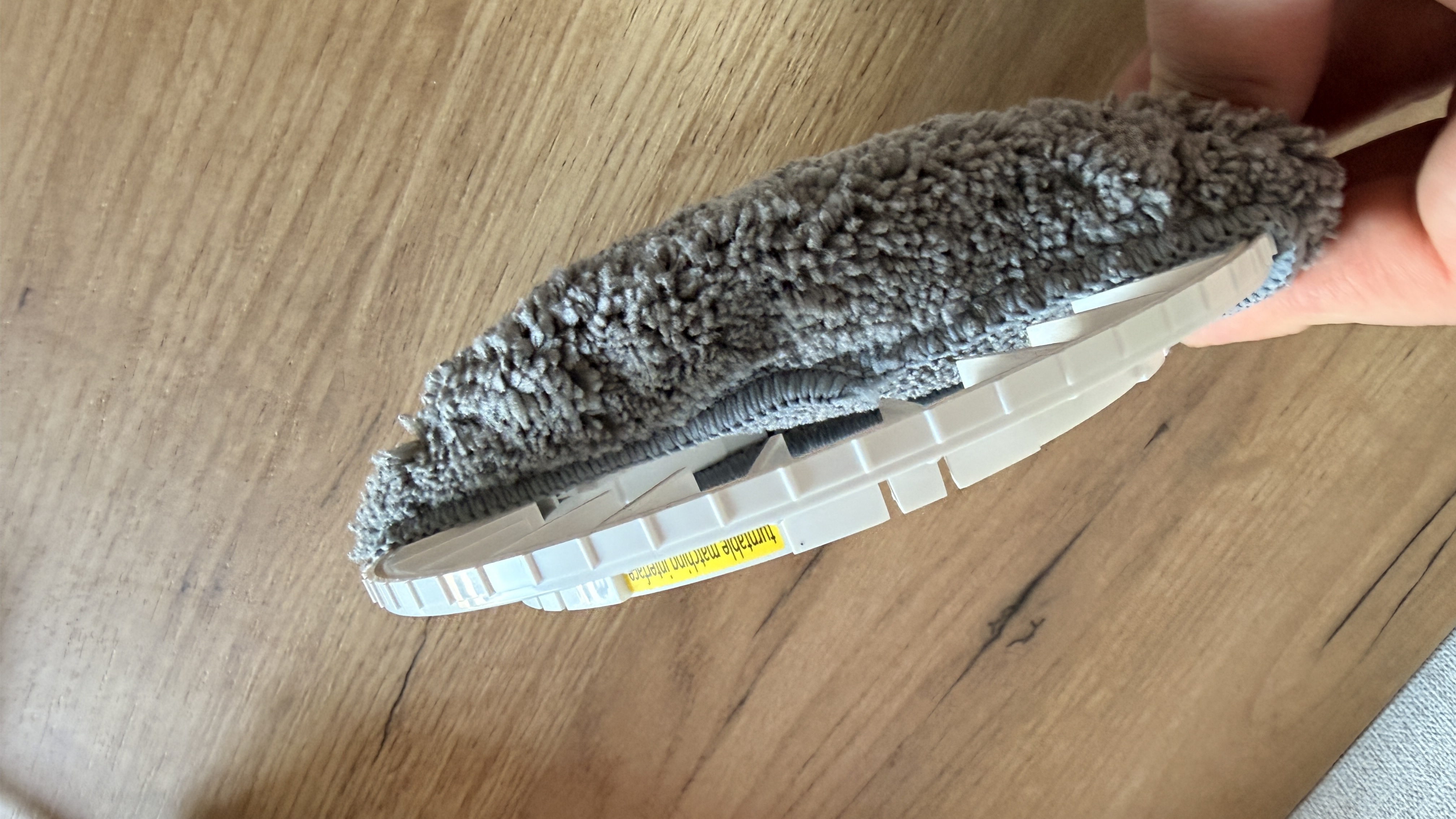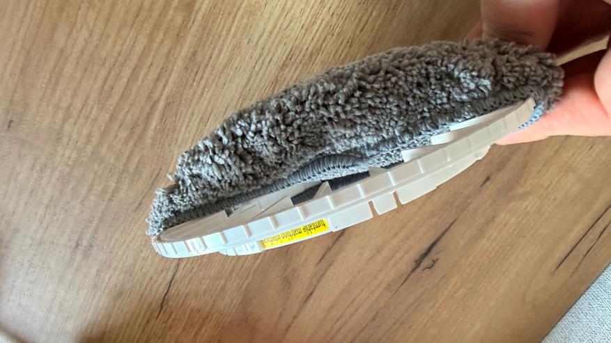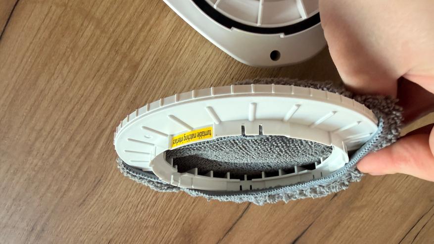 Моющие диски пластиковые, для их снятия достаточно с усилием потянуть на себя. Они удерживаются на защелках, но для корректной установки нужно убедиться в соответствии пазов и выступов. Это очень просто сделать по имеющимся наклейкам-указателям желтого цвета. Салфетки плотно натягиваются на диски при помощи резинок. Сами они не свалятся, а надеть не представляет сложности. После каждого прохождения во время мытья легко и быстро можно заменить салфетки.