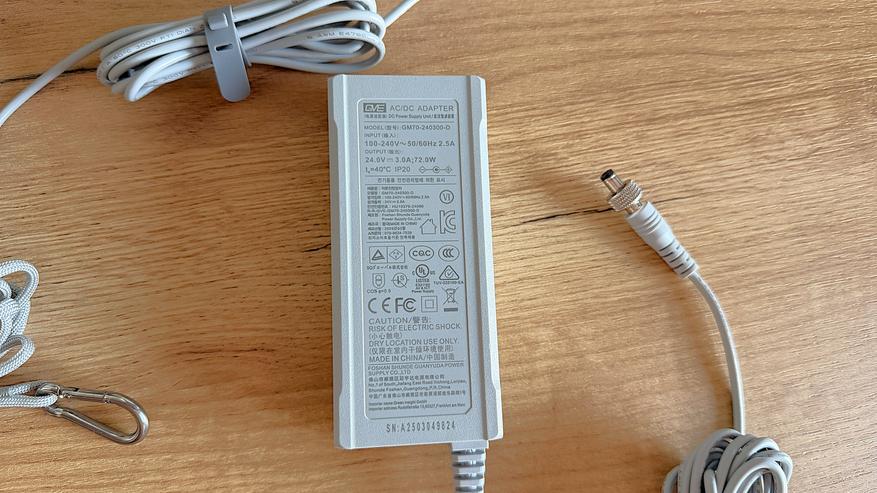 С нижнего торца видим места вхождения сетевого кабеля и страховочного троса. На противоположном торце просто ровный пластик.