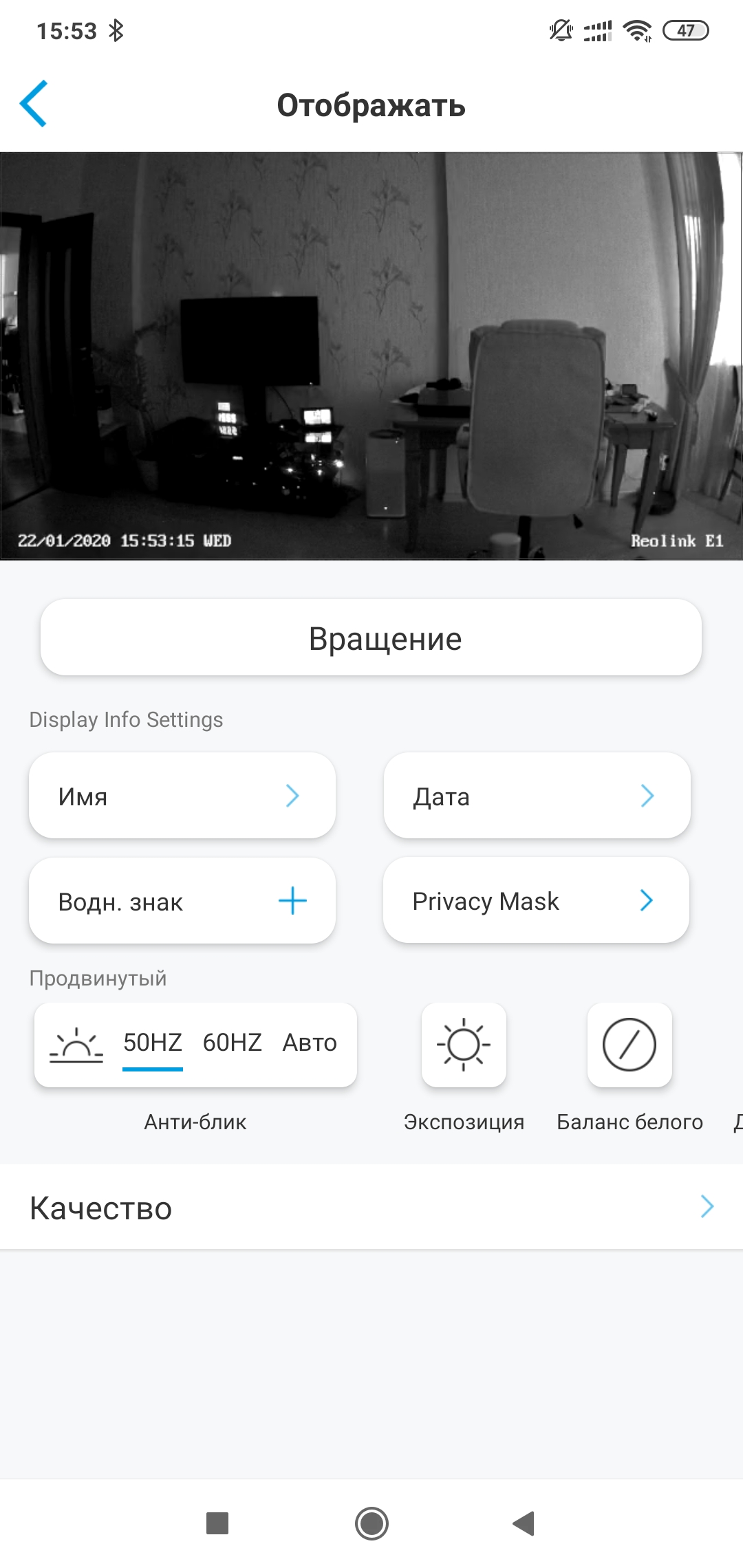 В зависимости от условий съемки и желаемого результата, тут есть 6 опций настройки изображения — антиблик, который поможет избежать мерцания от ламп дневного света, настройки экспозиции и баланса белого