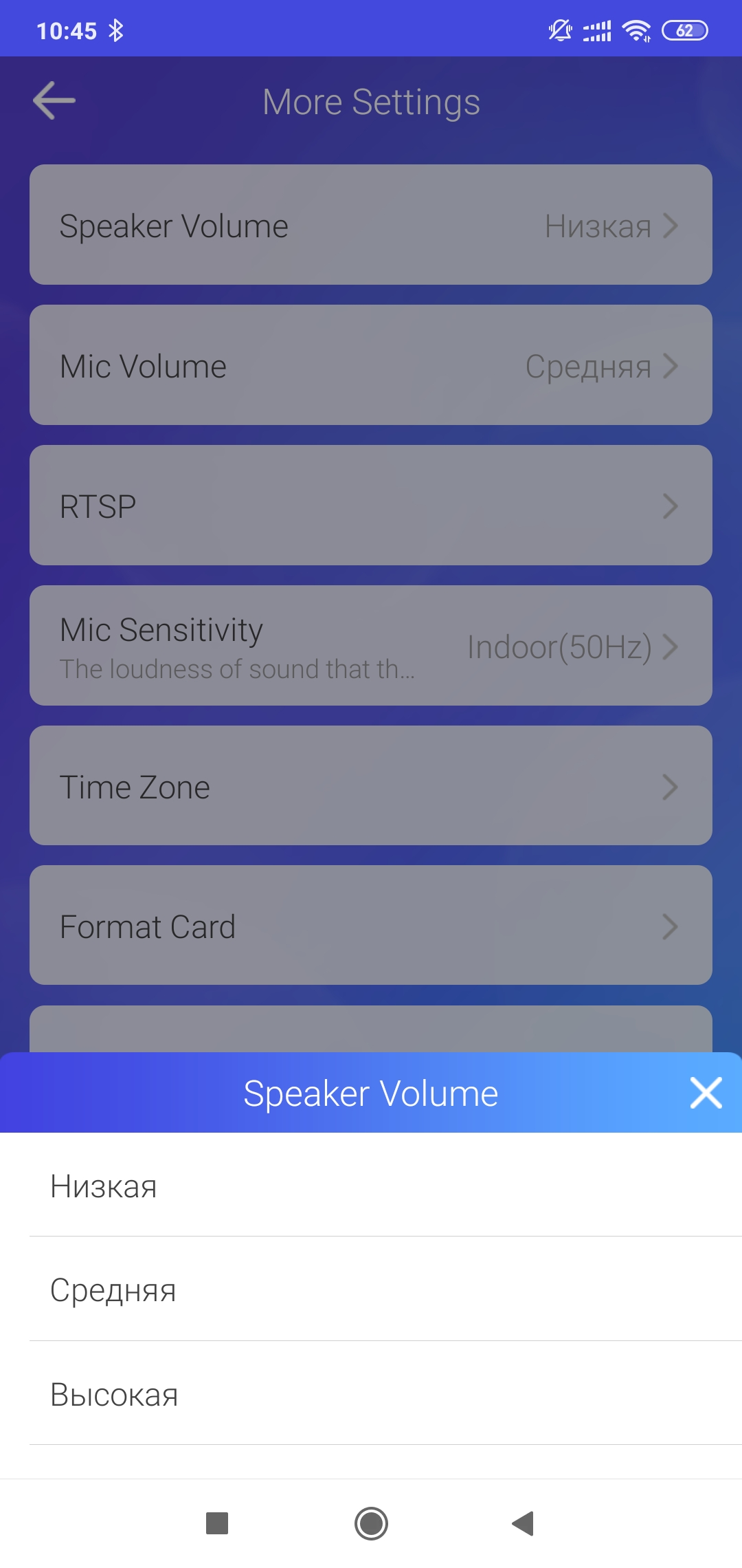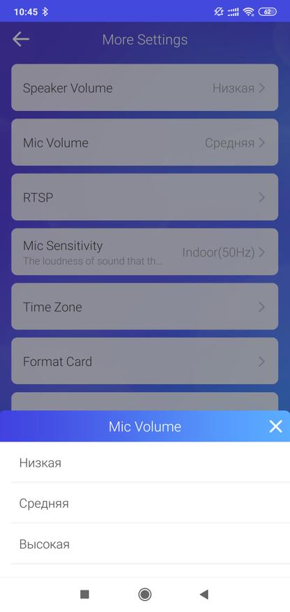 В меню расширенных установок есть опции настройки уровня громкости динамика и микрофона камеры