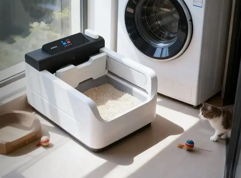 Лоток функционирует как стационарный сантехнический прибор, требуя врезки в водопроводную и сливную сети по аналогии со стиральной машиной. В качестве наполнителя применяются многоразовые моющиеся гранулы. Устройство запускает 45-минутный цикл очистки только после того, как животное покидает конструкцию. Твердые отходы измельчаются механизмом до состояния жидкой взвеси и напрямую смываются в канализацию. Далее система промывает гранулы водой с добавлением фирменного моющего средства, проводит дезинфекцию и высушивает наполнитель горячим воздухом. Встроенные датчики безопасности автоматически блокируют работу механизмов при приближении животного.