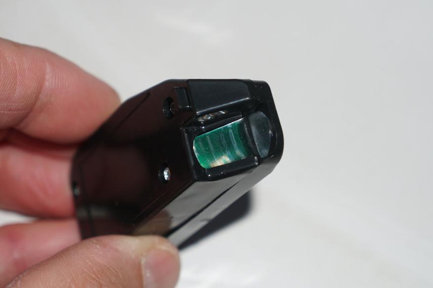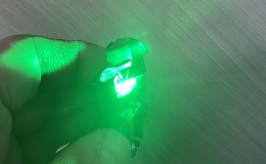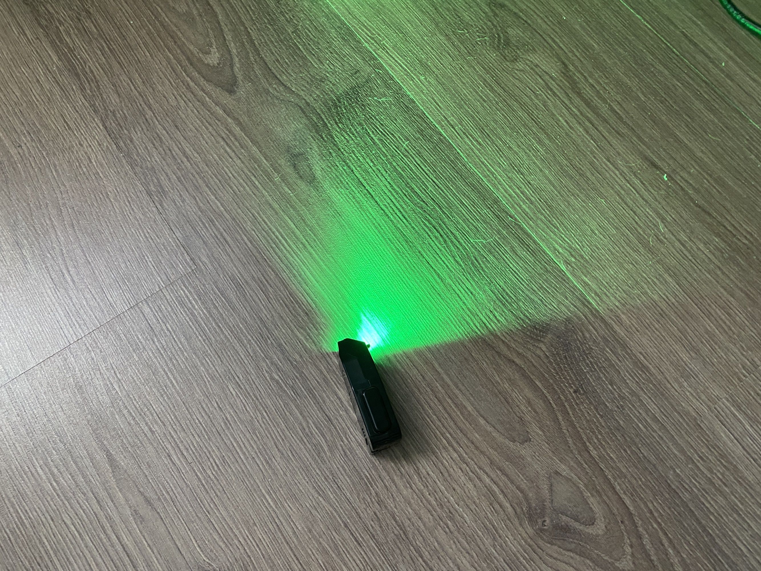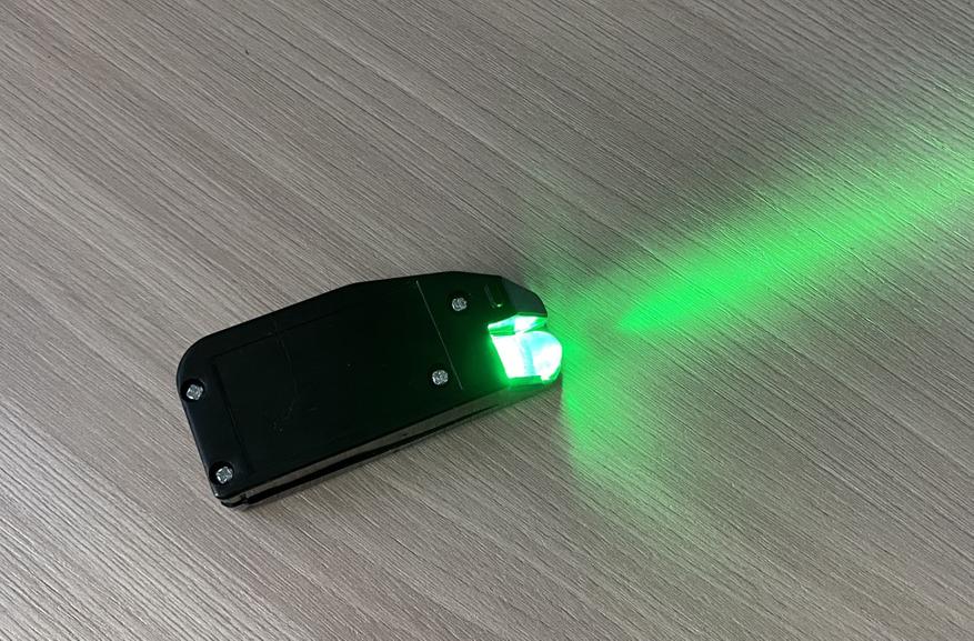 При нажатии на кнопку загорается яркий зеленый свет, проходящий через линзу.