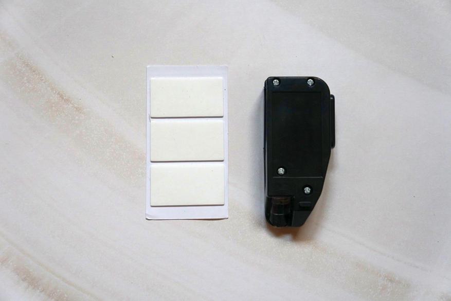 На одной из боковых сторон определена площадка для фиксации двухстороннего скотча, идущего в комплекте. Там же находится небольшой штырек-ограничитель, который позволяет позиционировать модуль на щетке пылесоса в нужном положении.