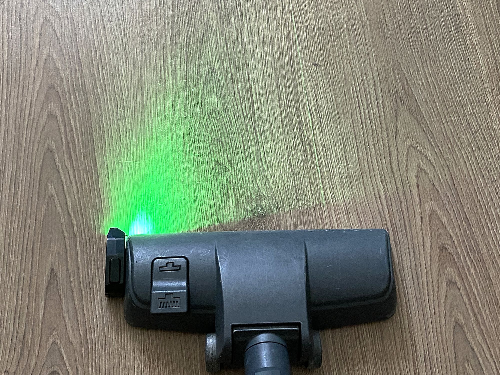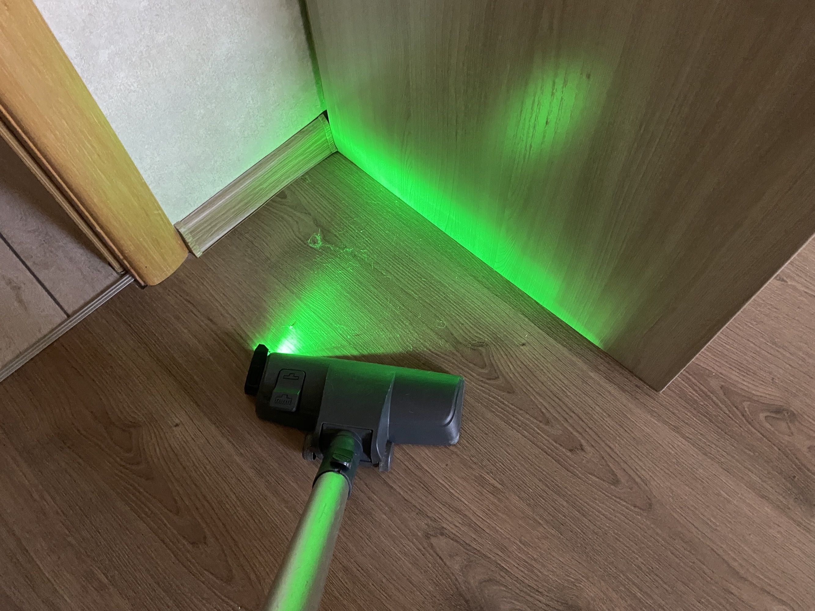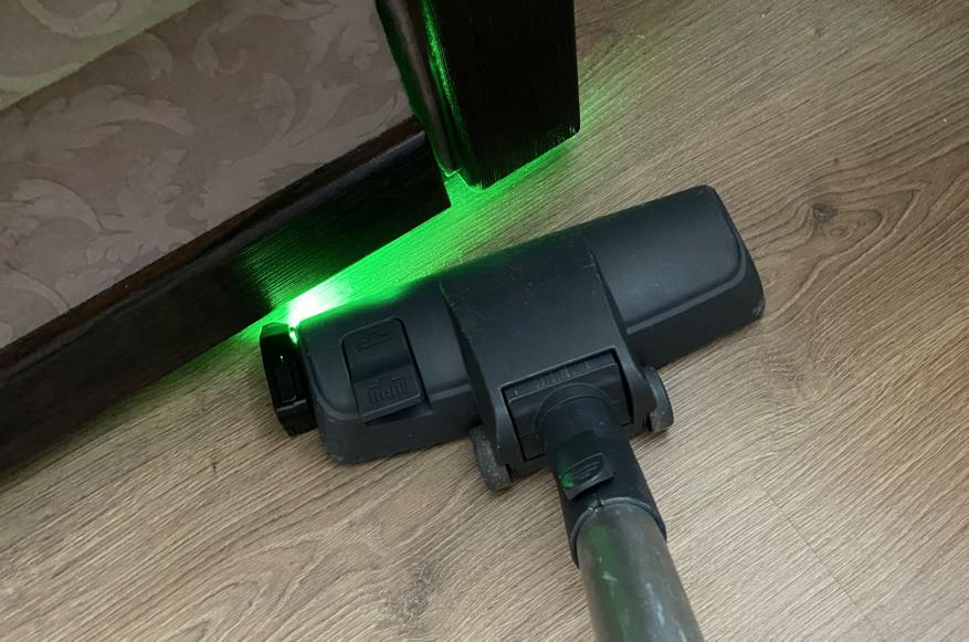 Вот наглядное сравнение как выглядит пол без подсветки и с подсветкой (одно и тоже место). То есть зеленая яркая подсветка действительно выявляет пыль и шерсть и позволяет лучше проводить уборку.