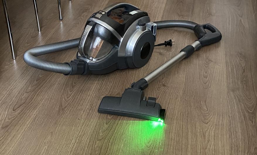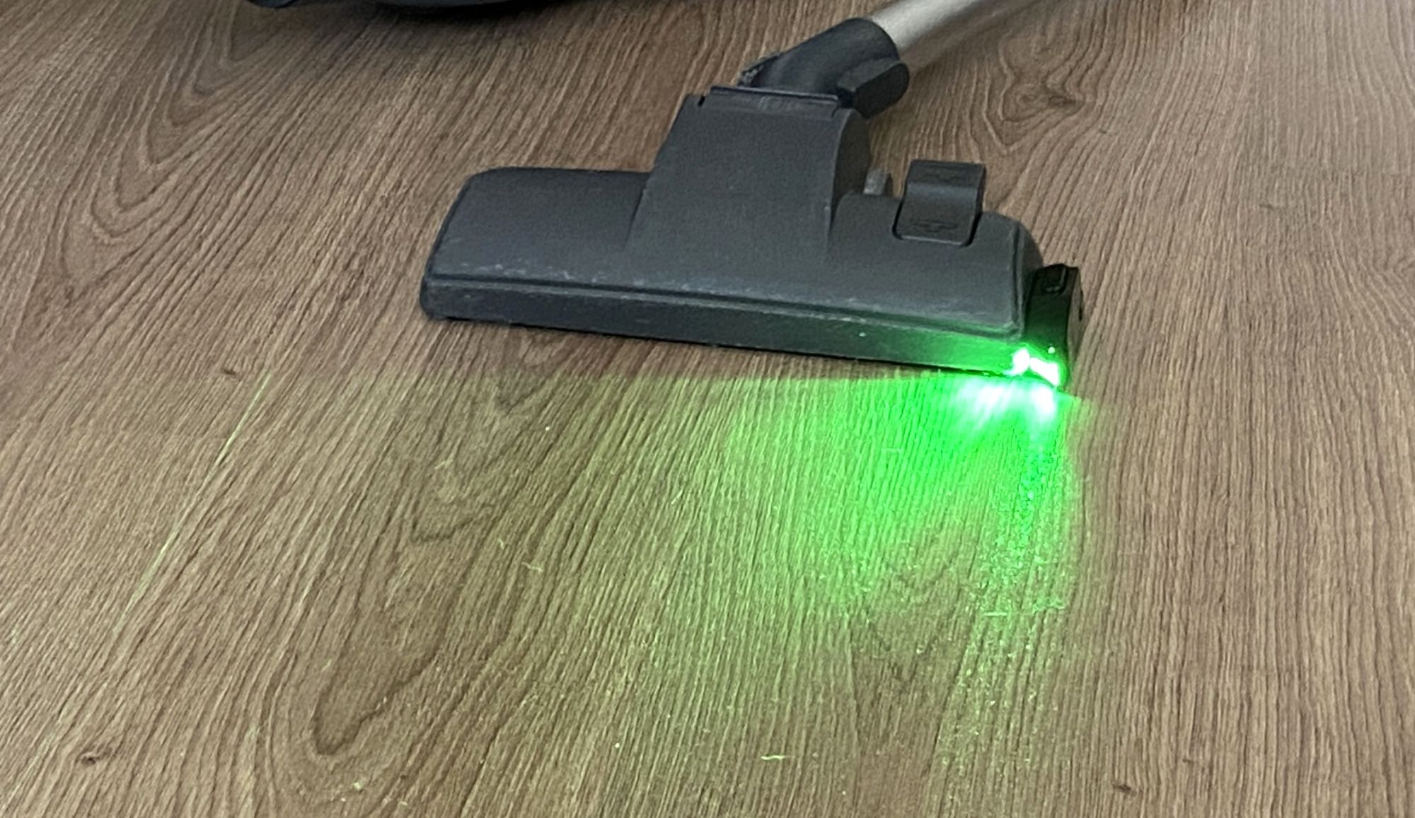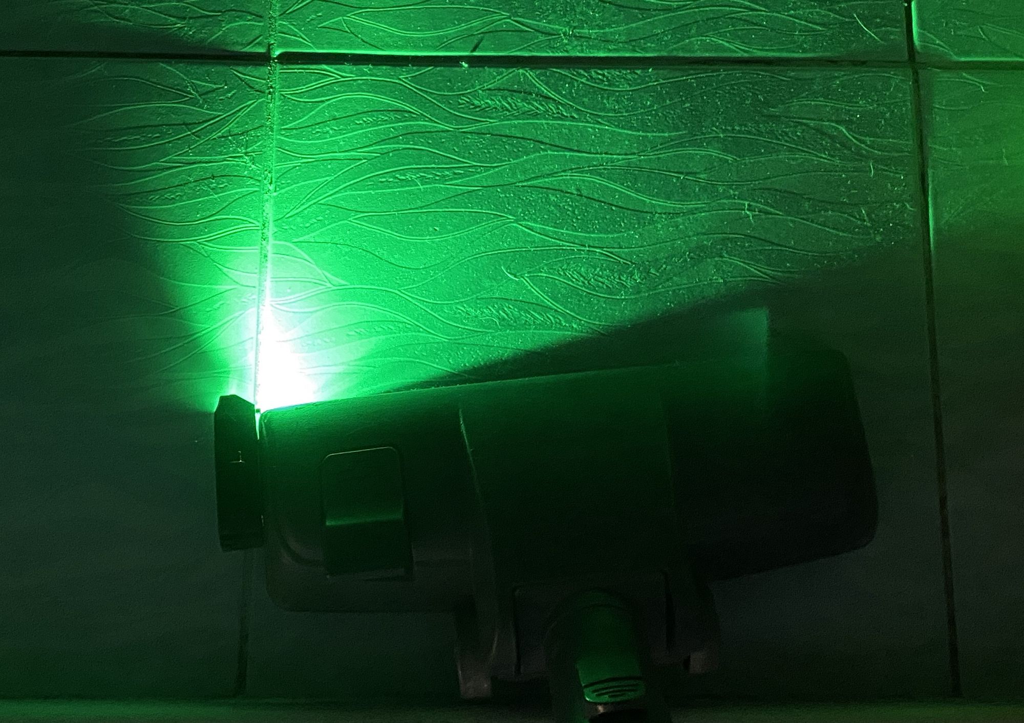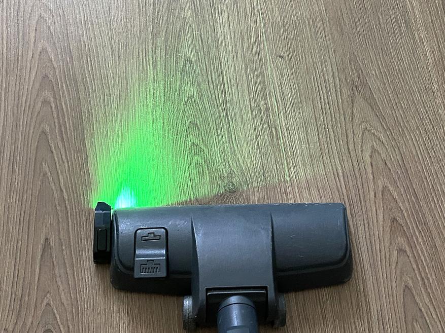 Вот наглядное сравнение как выглядит пол без подсветки и с подсветкой (одно и тоже место). То есть зеленая яркая подсветка действительно выявляет пыль и шерсть и позволяет лучше проводить уборку.