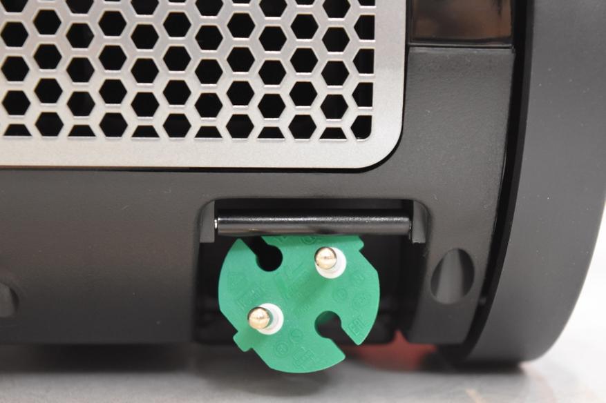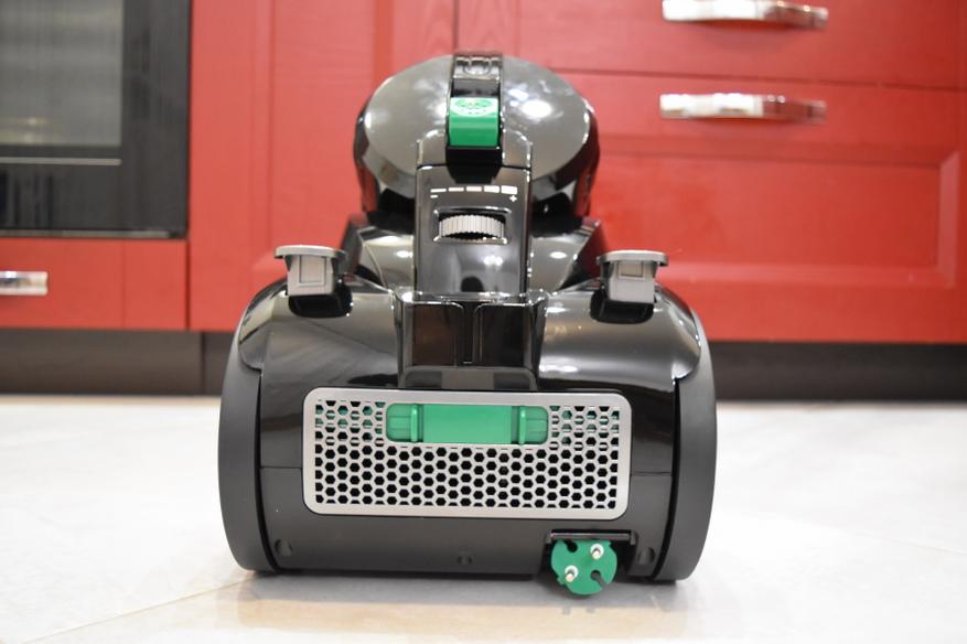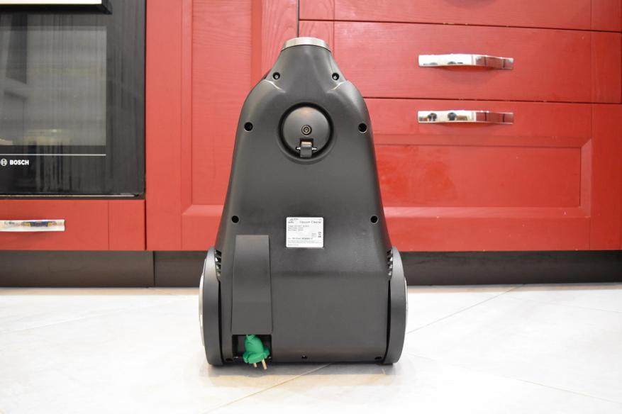 Спереди есть вращающееся колесико небольшого размера. Оно резиновое. С противоположной стороны расположился выход кабеля питания, который, кстати, тоже зеленого цвета и имеет длину 5 м. Для того, чтобы кабель не терся о корпус пылесоса при вытягивании, производитель оснастил пылесос металлическим валиком. На кабель нанесены 2 метки (желтая и красная), и производитель рекомендует вытягивать кабель до желтой отметки.