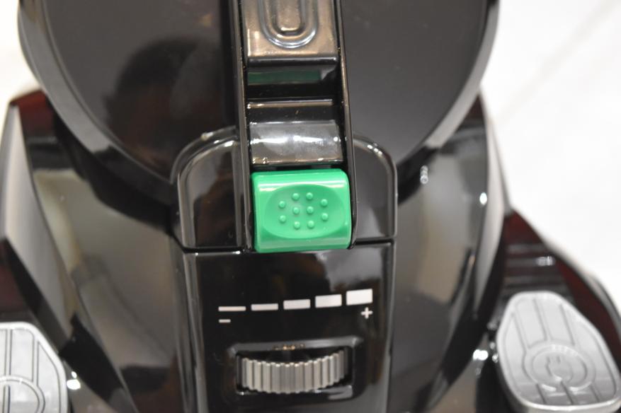 Двигатель работает тихо на минимальной мощности, а вот на максимальной шумит громче. На корпусе устройства есть переключатель мощности всасывания, которая плавно регулируется. Наверное, было бы удобнее, если бы переключатель находился на рукоятке.