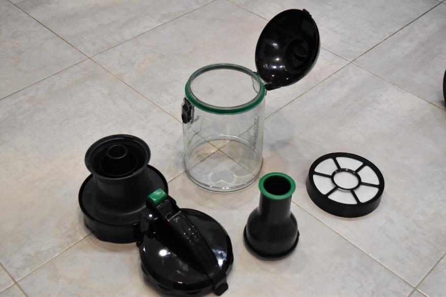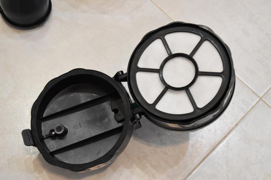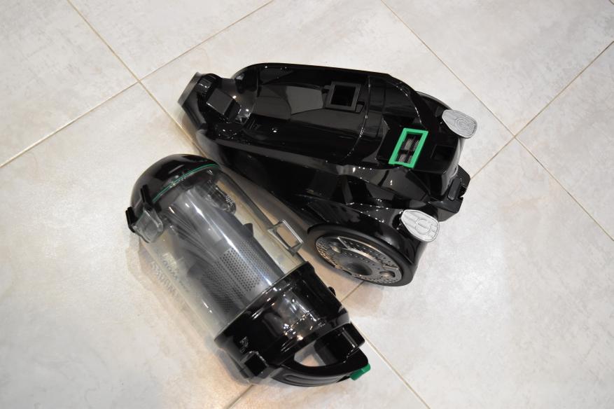 Этот пылесос с контейнером для мусора, емкостью аж 2,5 л. Пылесборник съемный и его можно мыть. Чтобы очистить его от мусора, достаточно открыть дверцу и высыпать мусор. В конце уборки желательно достать оба фильтра и тот, который в пылесборнике, и тот, который служит для очистки воздуха в корпусе изделия, и промыть их теплой водой, можно с добавлением мыльного раствора.