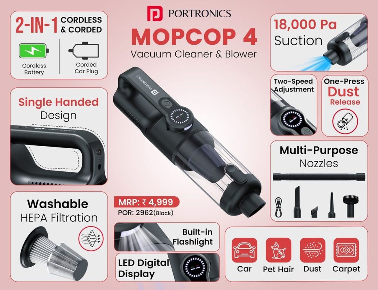 Как сообщается, компания Portronics представила новинку в линейке портативных очистительных устройств — Mopcop 4, сочетающий функции беспроводного пылесоса и воздуходувки. Модель, ставшая четвёртой в серии, ориентирована на бытовую уборку и чистку автомобилей, предлагая мощность всасывания до 18 000 Па, съёмный аккумулятор на 2000 мАч и возможность работы от прикуривателя.