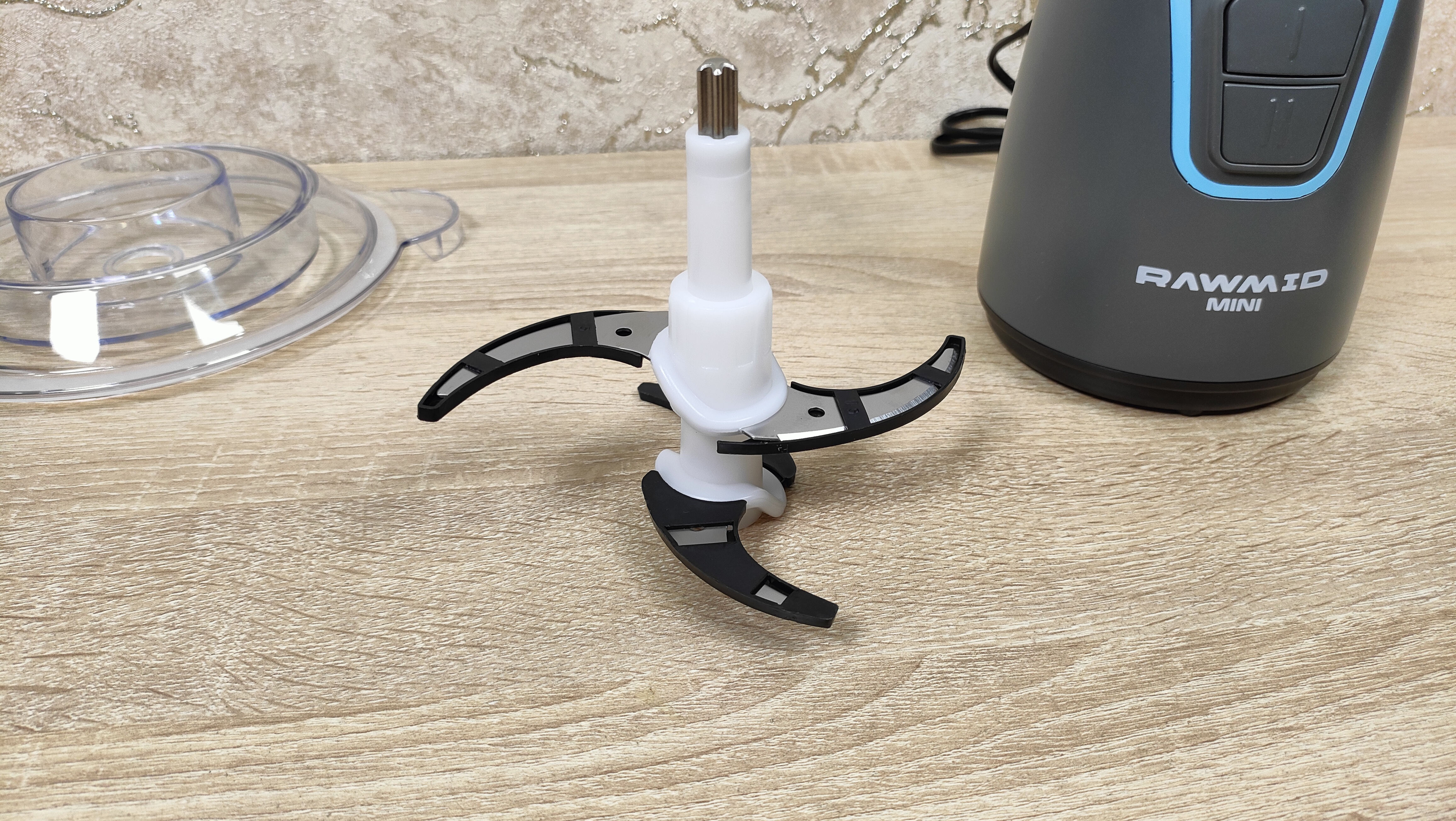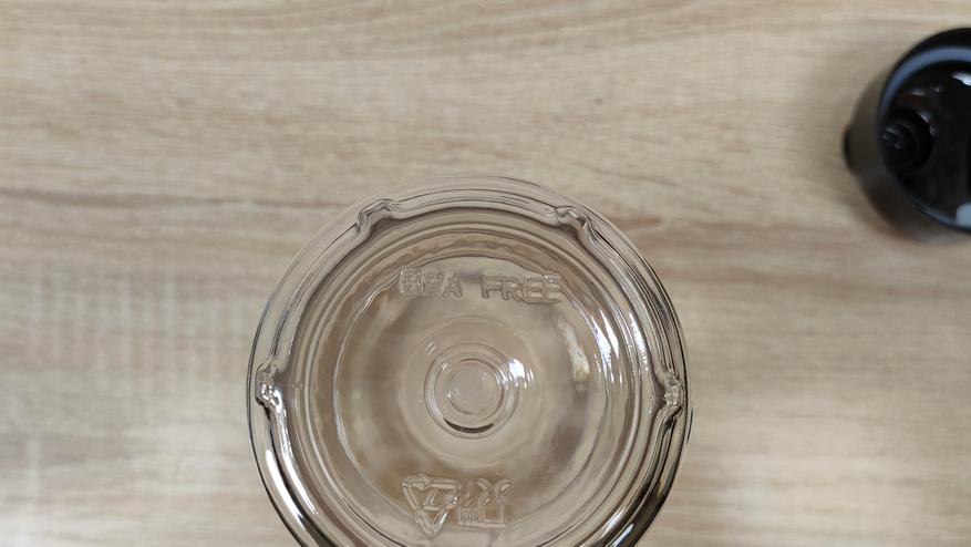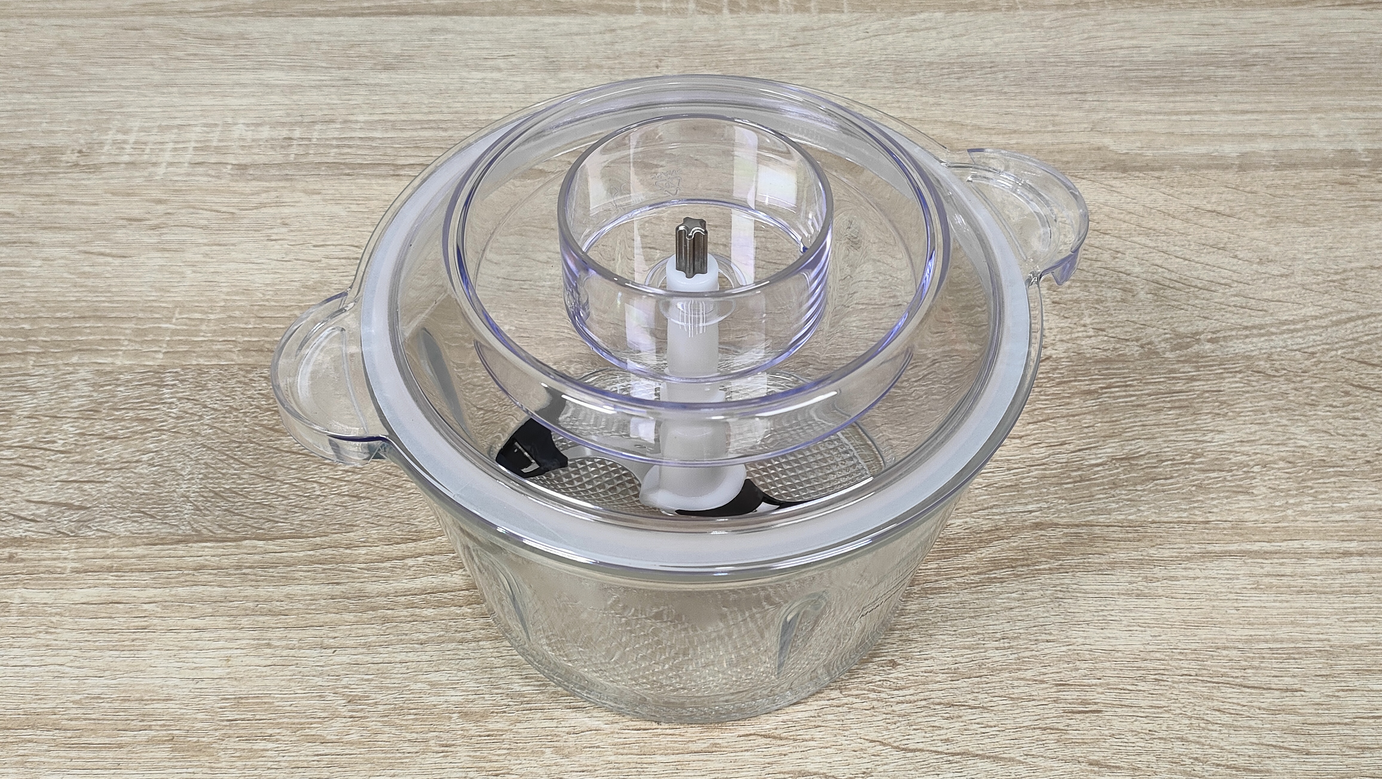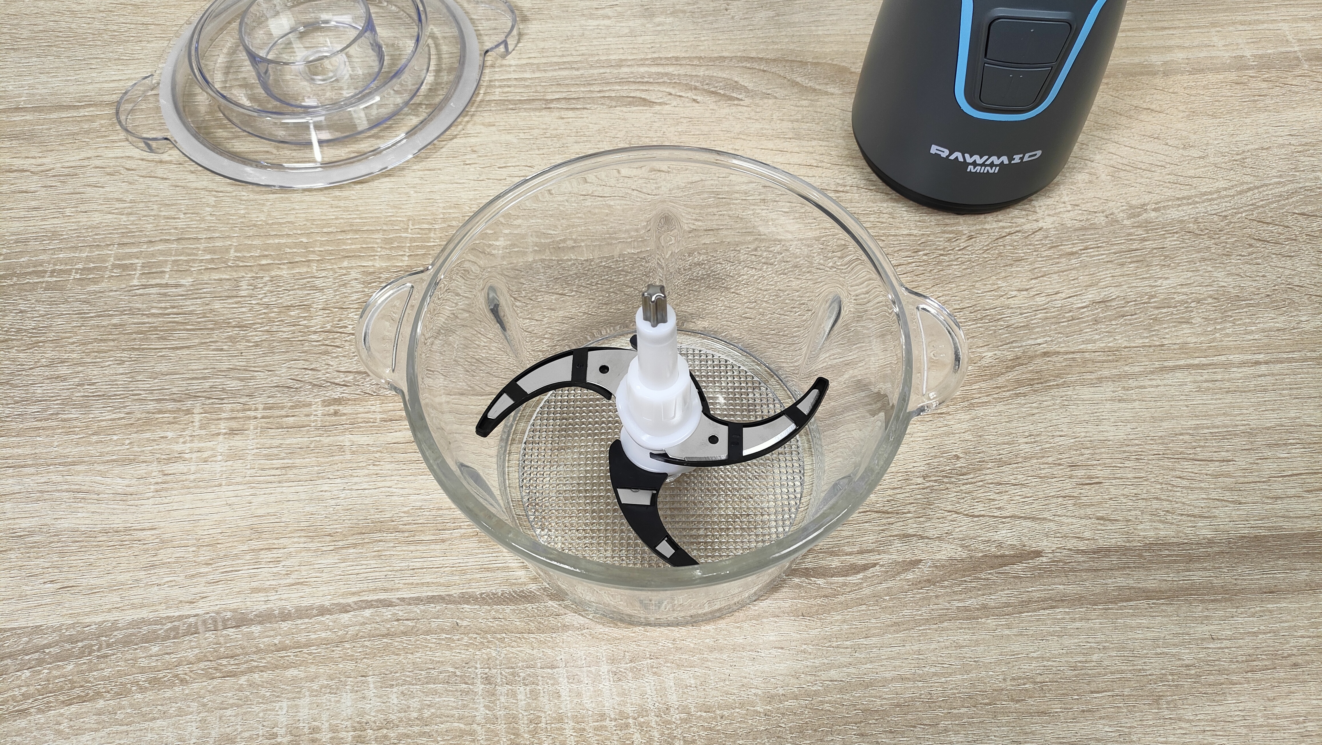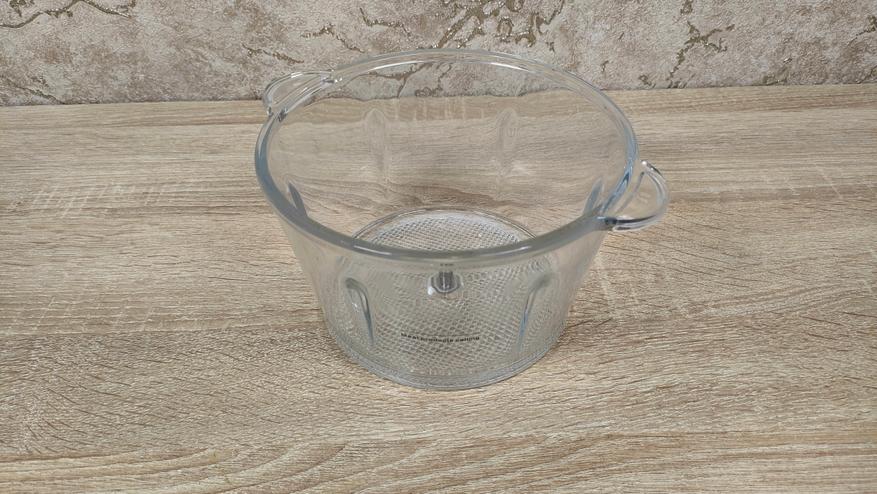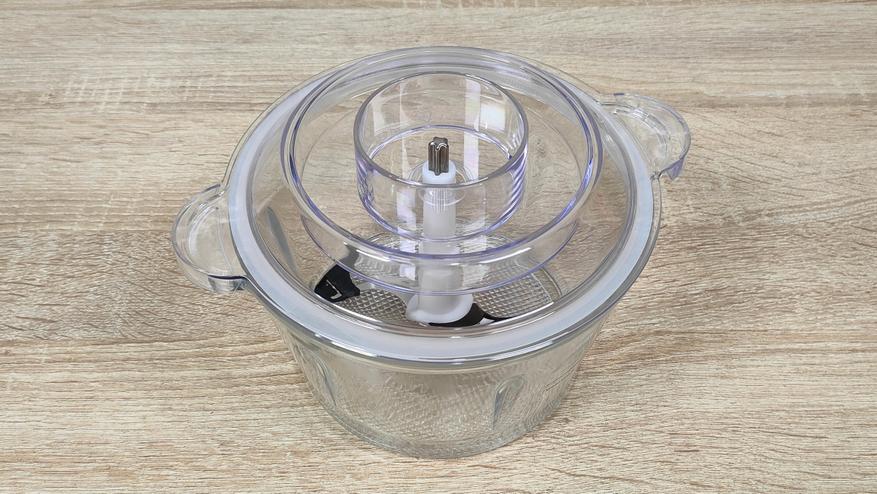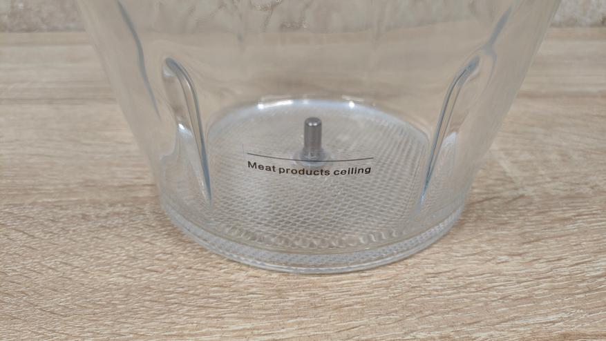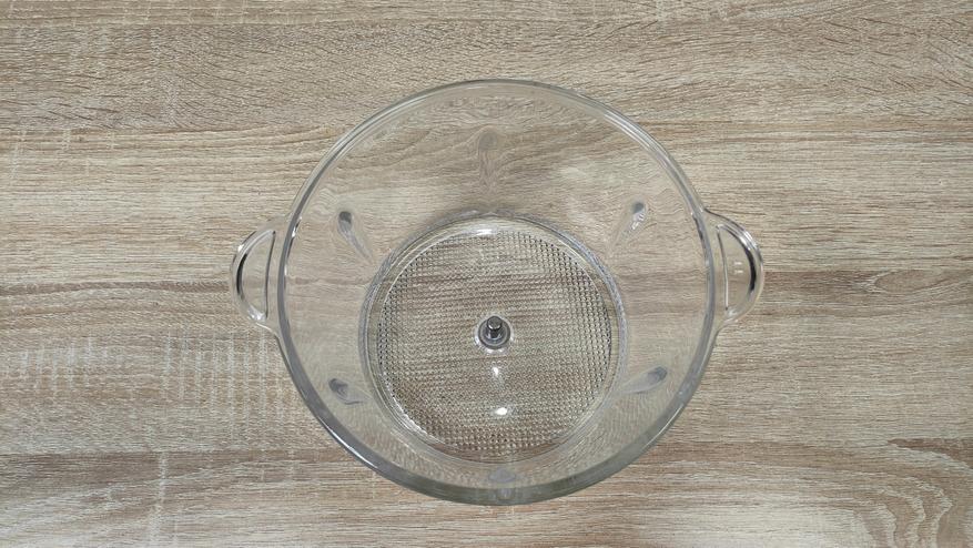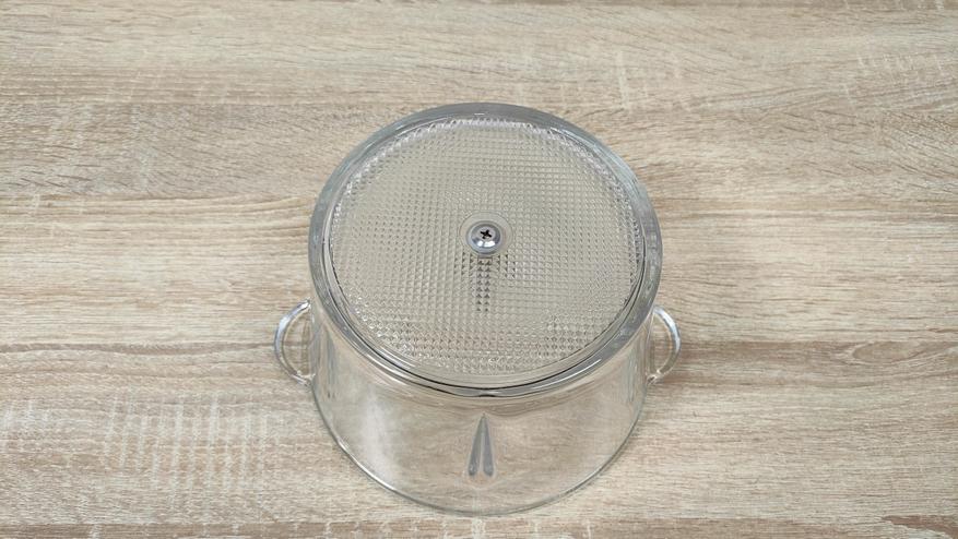Чаша выполнена из толстого стекла и имеет приятную тяжесть, что кроме всего прочего, ещё и для того, чтобы сместить центр тяжести к рабочей поверхности, для исключения опрокидывания. Объём чаши до краёв составляет 1,7 л, соответственно полезный, приблизительно 1,4-1,5 л. Для неё в комплекте есть привычный нож с двумя лезвиями, но на нее есть специальная насадка которая добавляет ещё два лезвия перпендикулярно существующим.