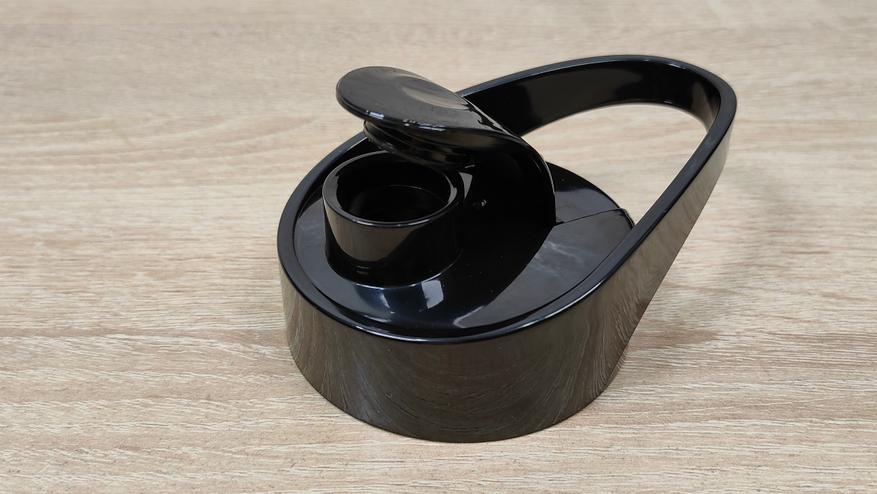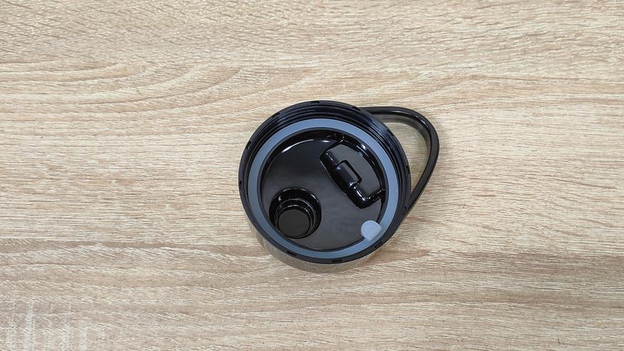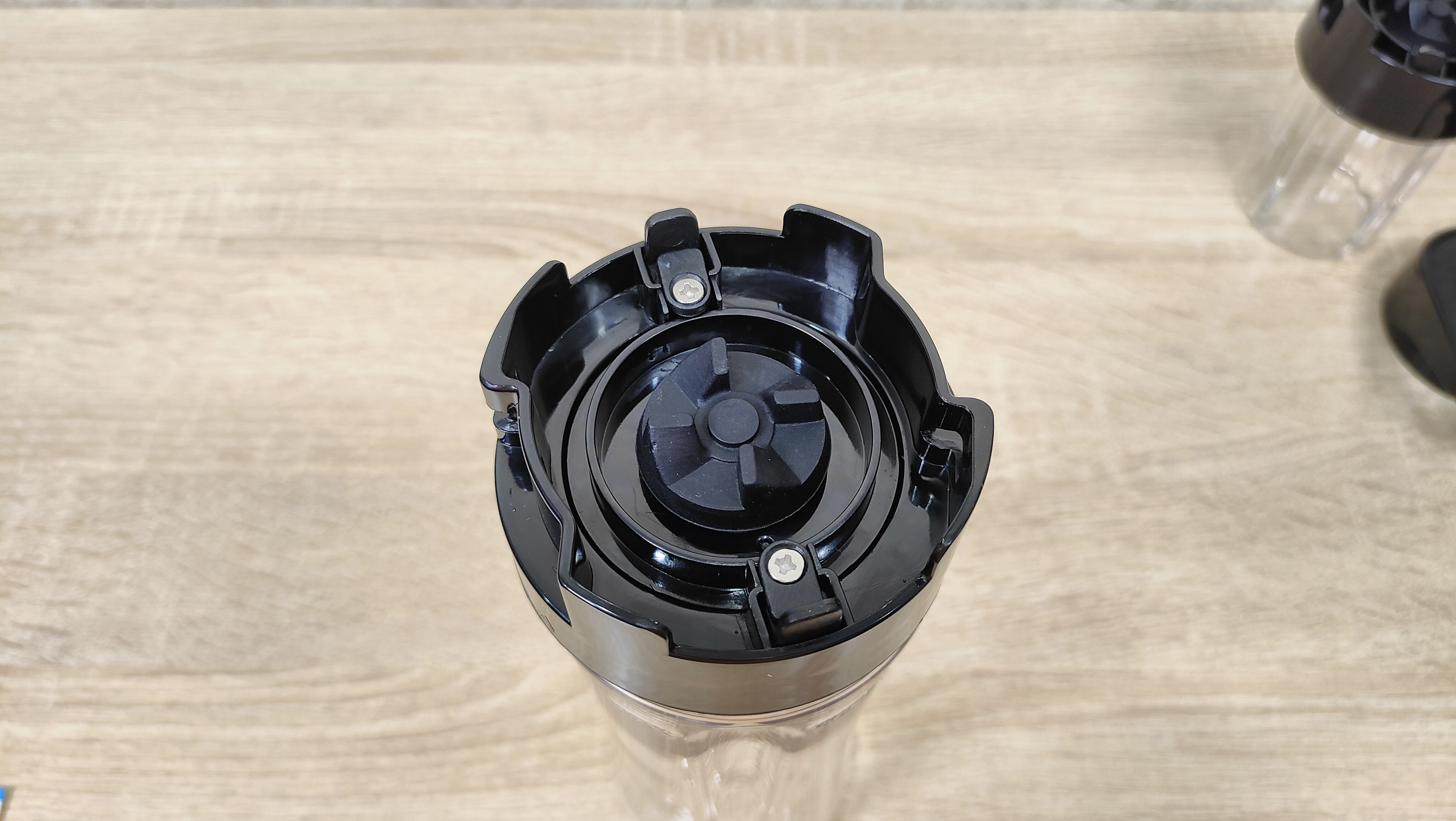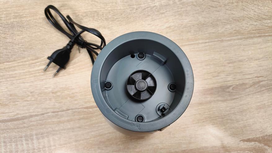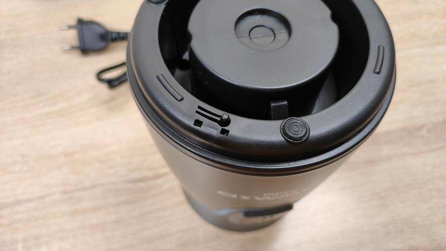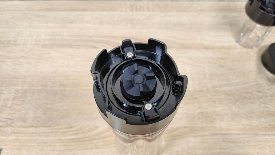 Привод для бутылок у него находится сверху, он закрыт крышкой. Она снимается без какого-либо труда, точно так же, повторюсь, без какого-либо труда на блендер устанавливаются и бутылки. При работе с чашей блендер устанавливается на неё без переворота, так как там есть крестовина, которая прикрыта шторками, это убережёт её от попадания чего-либо внутрь, например, во время готовки, когда можно не аккуратно поставить устройство на что-то в спешке или суете. С этой же стороны, которая является дном, есть предохранительная кнопка, которая нужна при работе с бутылками, то есть при опрокидывании блендера во время работы, он попросту отключится.