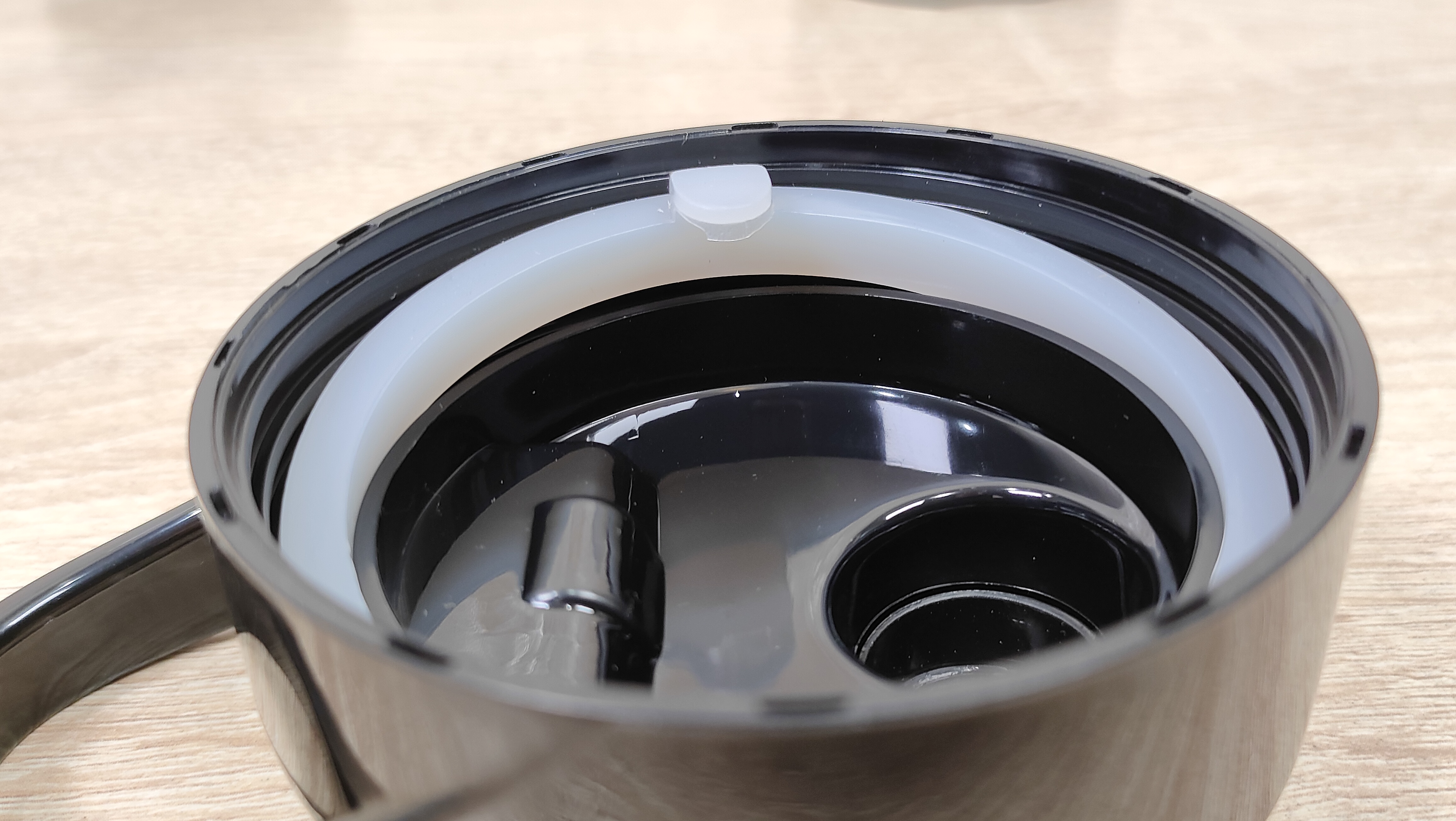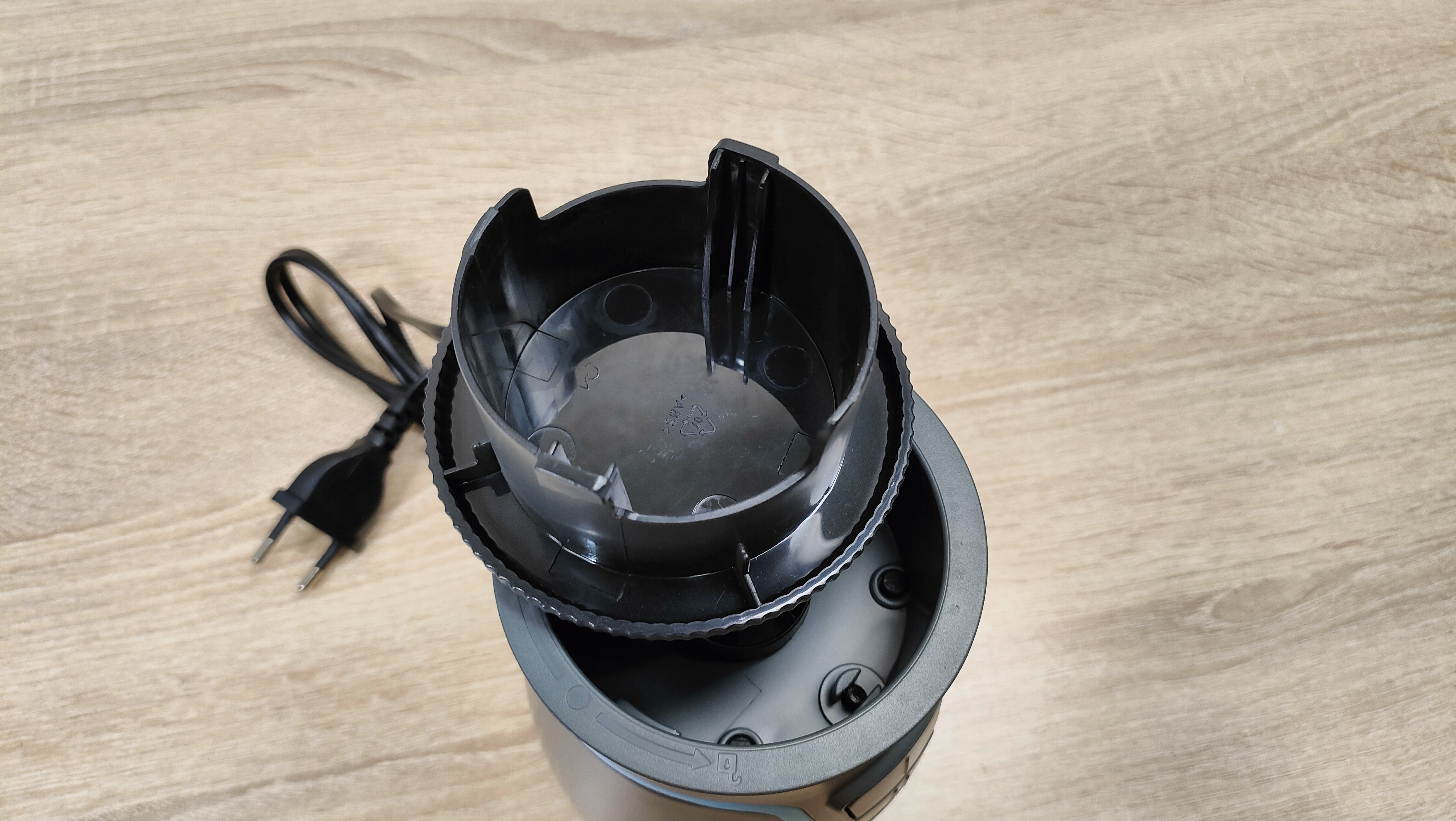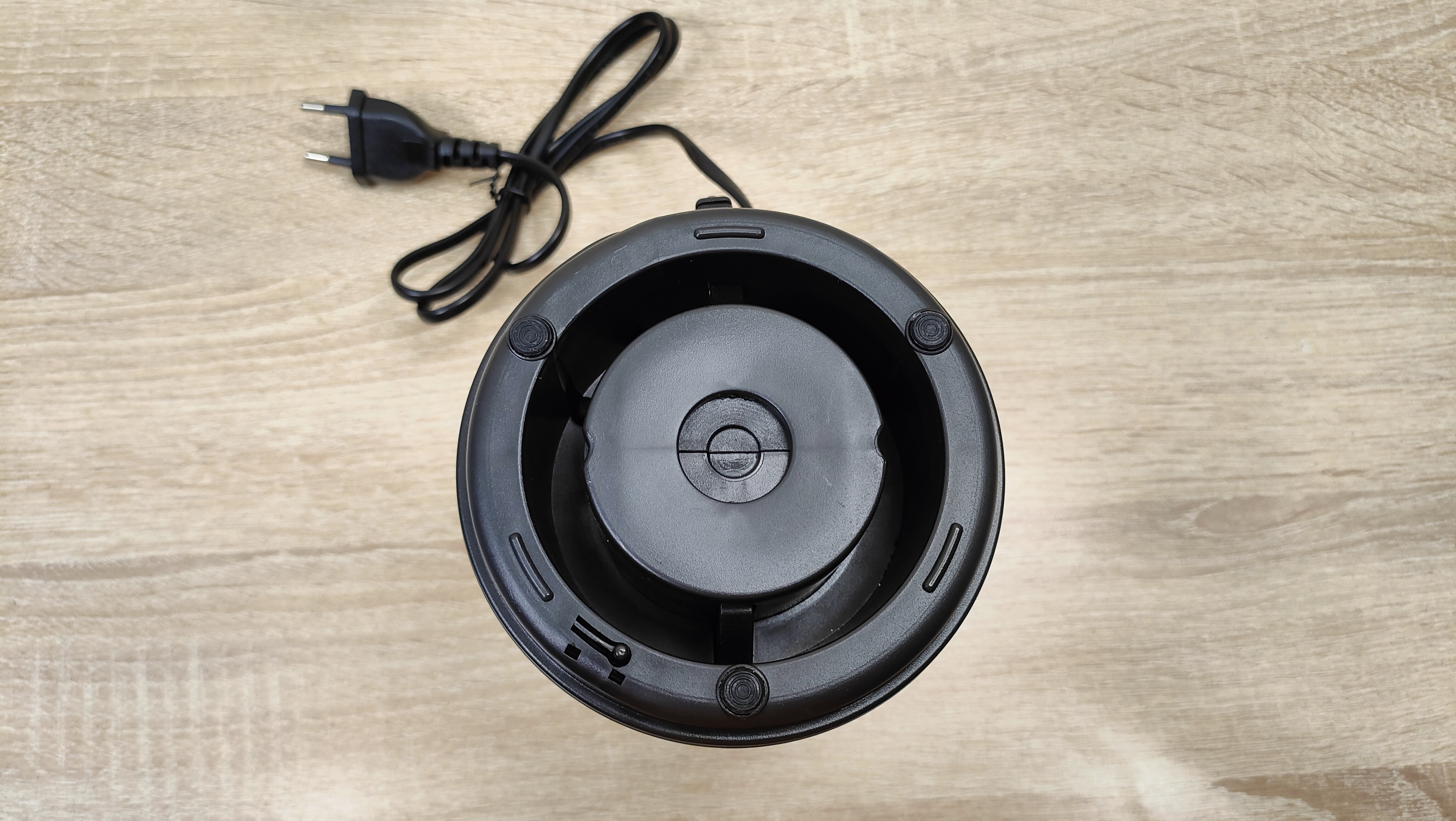 Привод для бутылок у него находится сверху, он закрыт крышкой. Она снимается без какого-либо труда, точно так же, повторюсь, без какого-либо труда на блендер устанавливаются и бутылки. При работе с чашей блендер устанавливается на неё без переворота, так как там есть крестовина, которая прикрыта шторками, это убережёт её от попадания чего-либо внутрь, например, во время готовки, когда можно не аккуратно поставить устройство на что-то в спешке или суете. С этой же стороны, которая является дном, есть предохранительная кнопка, которая нужна при работе с бутылками, то есть при опрокидывании блендера во время работы, он попросту отключится.