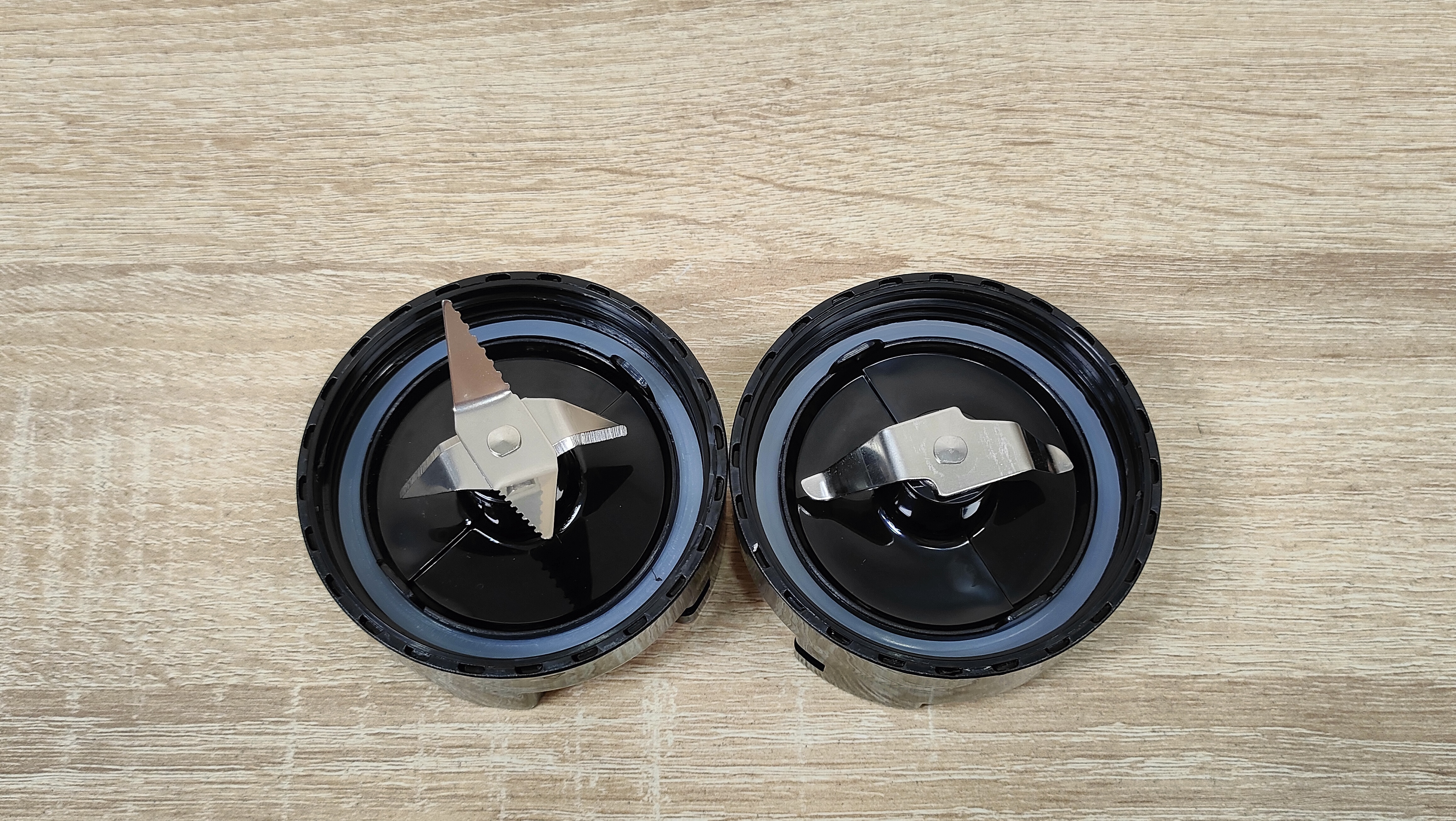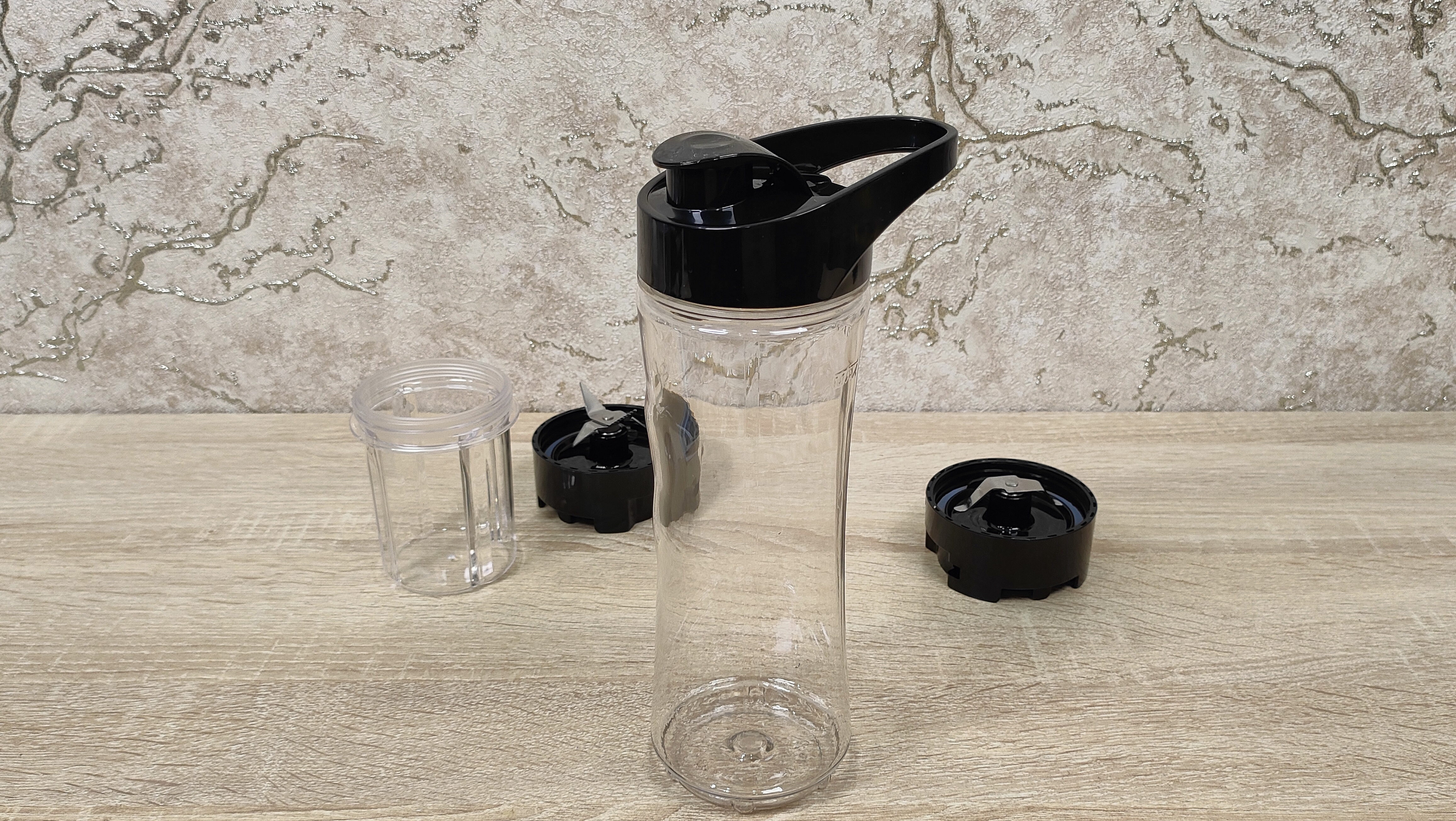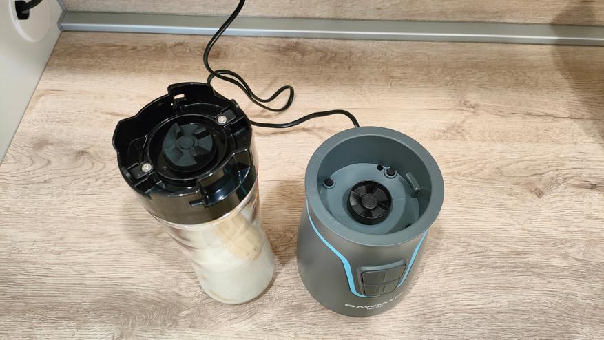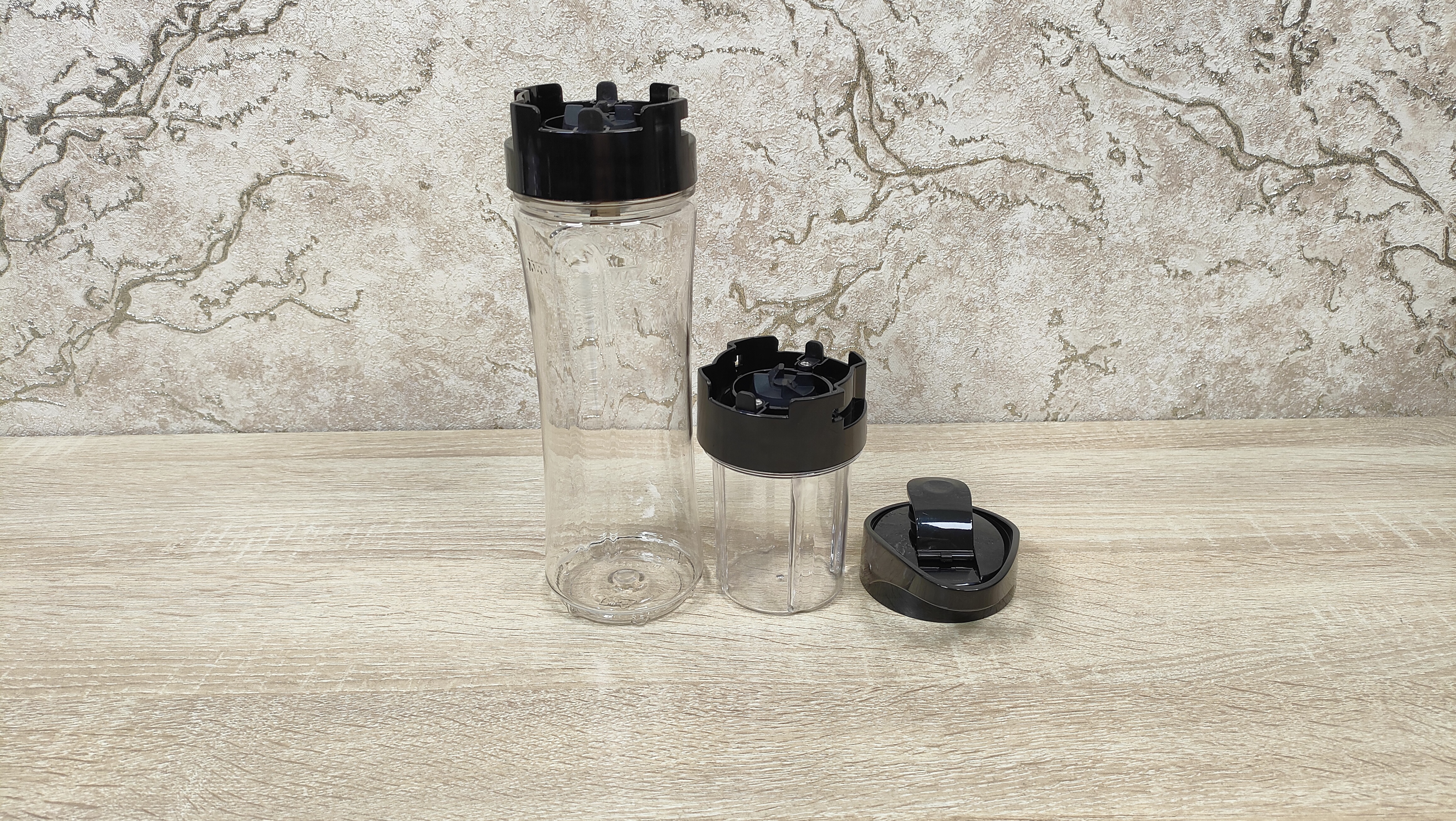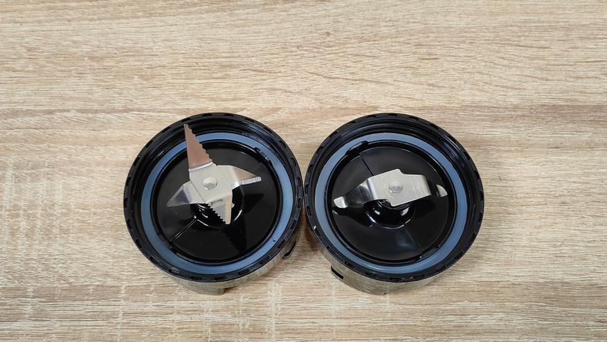 Одна бутылка объёмом 550 мл до отметки Max, другая бутылка, а точнее стакан объёмом 200 мл, до широкого бортика, но наверняка, лучше ограничиться объёмом 180 мл. На них предустановлены крышки с ножами разной конфигурации. Их можно превратить в спортивные (или просто бутылку, которую берут с собой), просто установив комплектную крышку с клапаном, очень удобно, особенно для тех, кто ходит в спортзал, можно приготовить себе сразу «предтрен», изотоник, либо другой нужный состав до тренировок/во время тренировок/после. Малая тара пригодится для тех случаев, когда продукта немного и есть шанс того, что просто большая часть будет разбросана по стенкам.