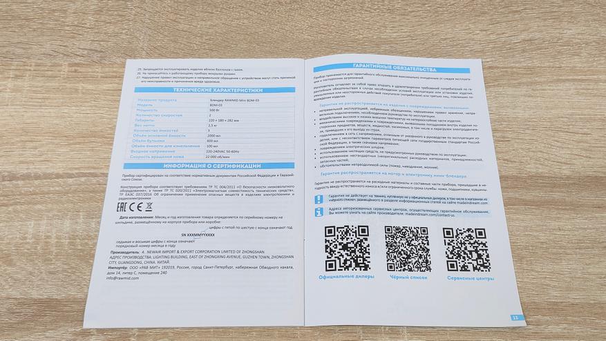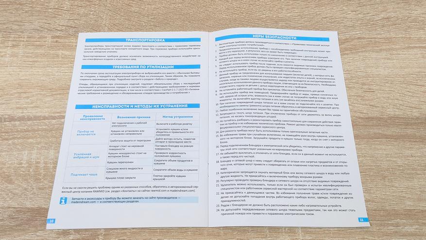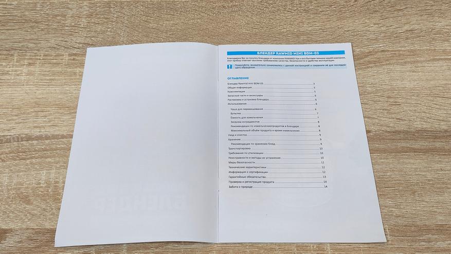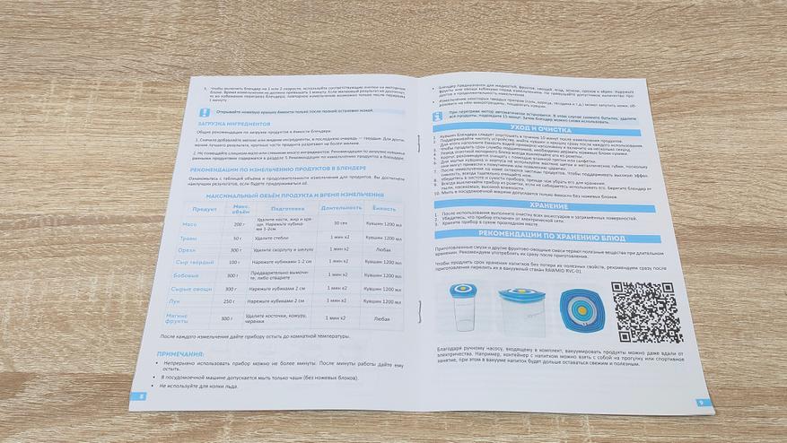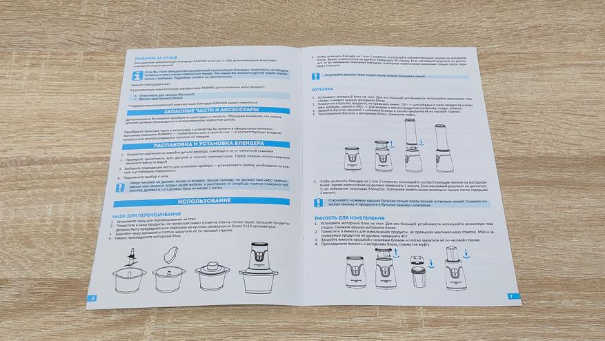 Из них можно узнать немало информации, так как всё подробно расписано, включая характеристики и основные особенности. Комплектация следующая: блендер, основная чаша с ножом, две бутылки разного объёма и с разными ножами, крышка для этих бутылок, которая превращает их в спортивную, дополнительный нож в чашу, уплотнительное силиконовое кольцо, две дополнительные насадки: для чистки чеснока, для взбивания, они входят в расширенную комплектацию, гарантийный талон и руководство пользователя.