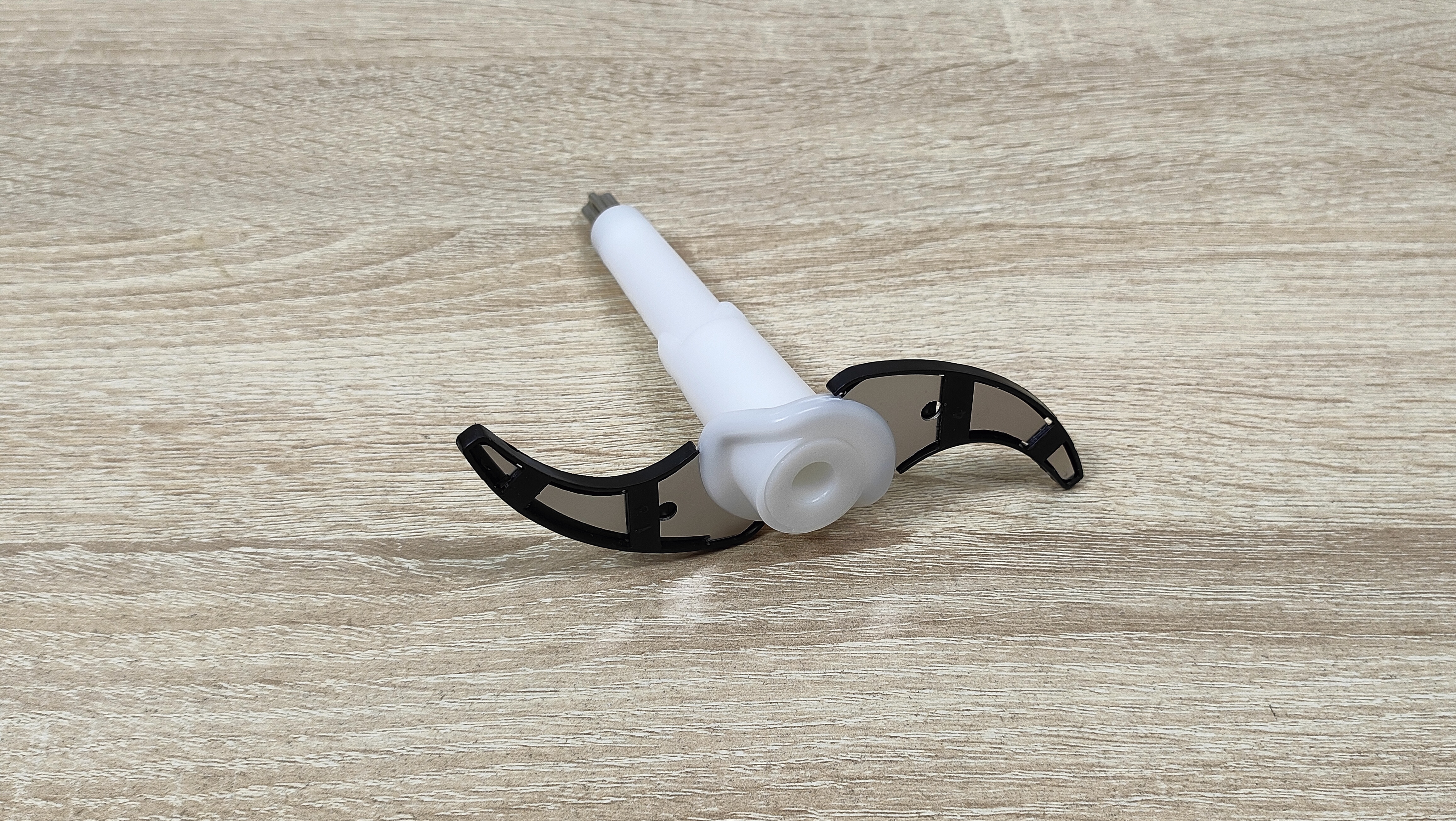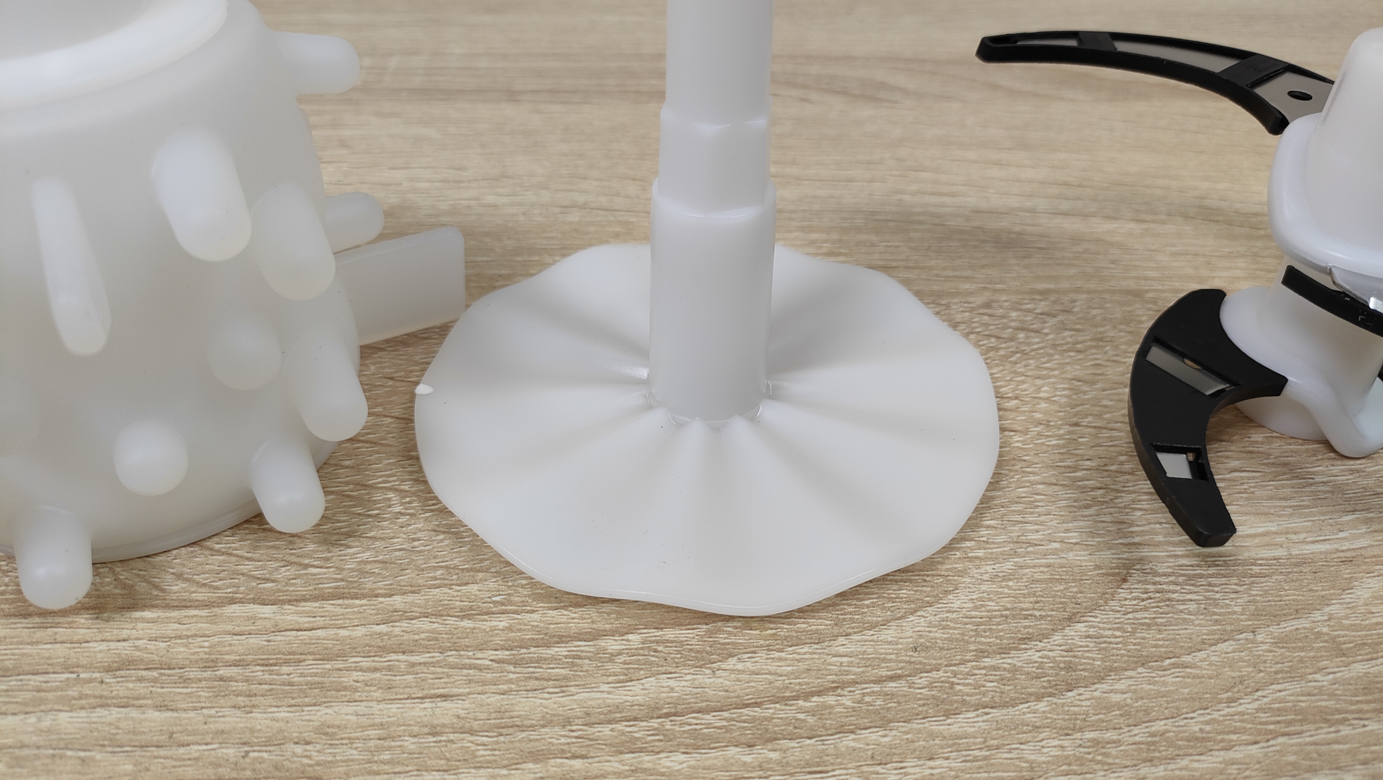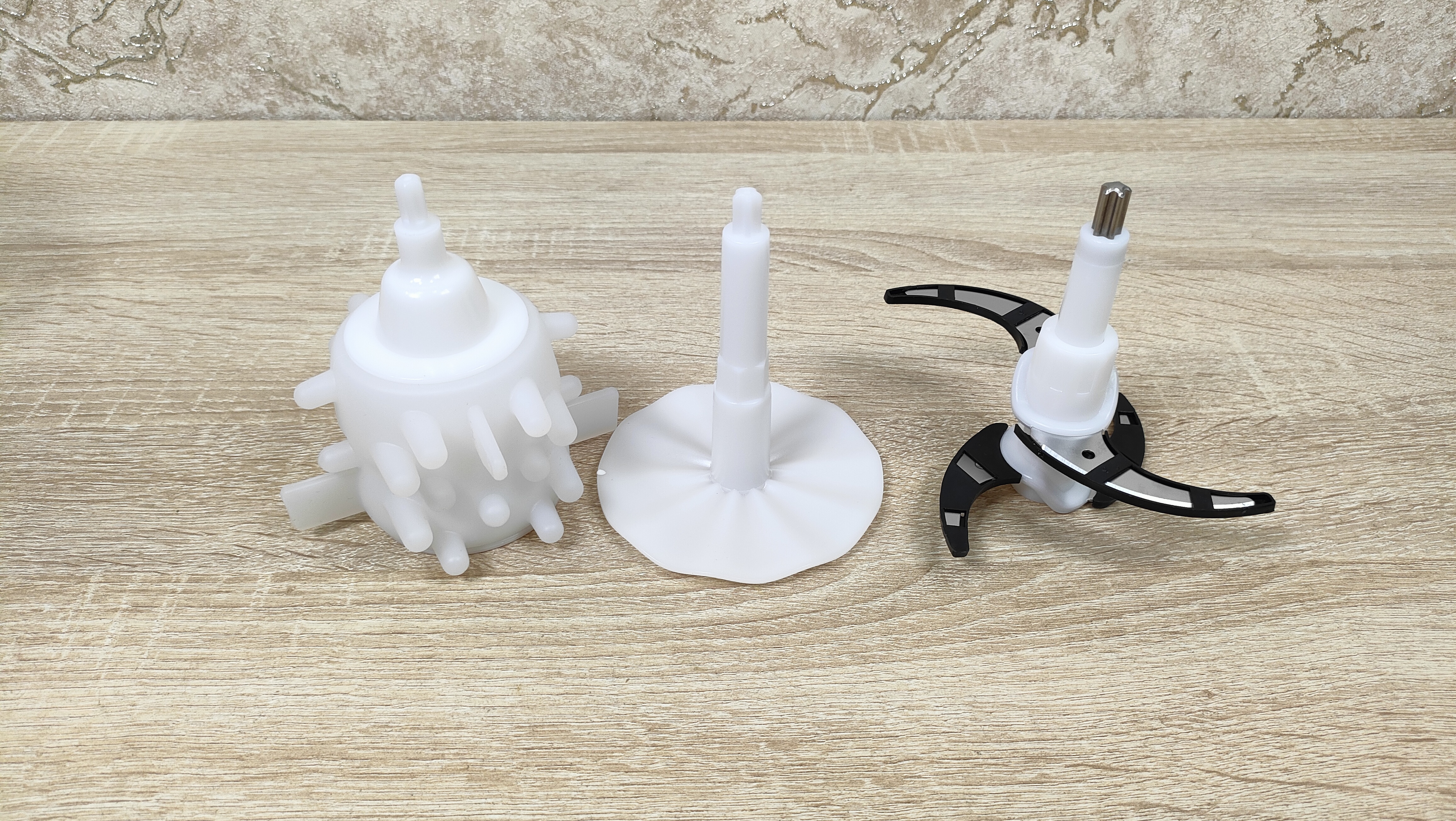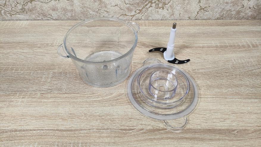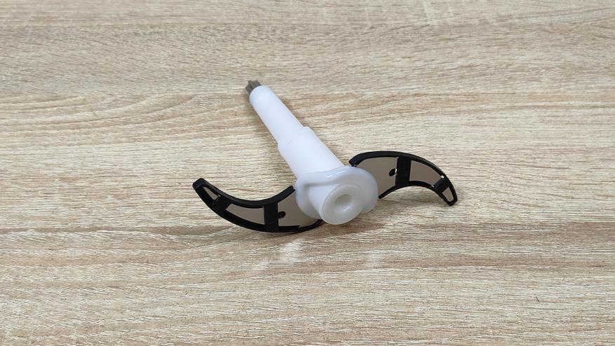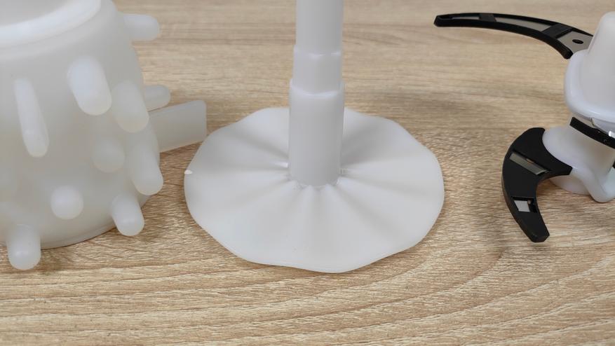 Он будет полезен, учитывая что чаша немаленькая и поможет быстрее переработать продукт. Кроме этого в дополнительное оснащение входит две насадки, одна для чистки чеснока с мягкими силиконовыми выступами разной длины, другая для взбивания.