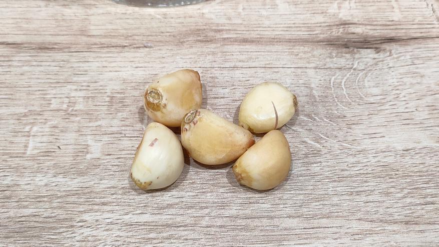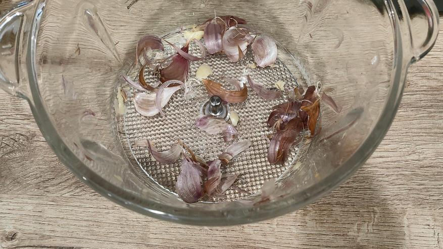 Чеснок, конечно, печальный, но какой есть. Я только отделил зубчики от головки и сразу бросил их в чашу. Я не убирал пленку, не отрезал хвостик и «корешок». В итоге все отлично очистилось, на первой скорости. Я попробовал вторую и ошибся, чеснок немного пострадал из-за высоких оборотов, но я вовремя заметил это и прервал процесс, не совершайте моих ошибок. В любом случае, результат хороший. Мы большую часть выращенного чеснока замораживаем в тонких пластах, поэтому, в сезон уборки чистить его приходится много, такая штука однозначно пригодилась бы.