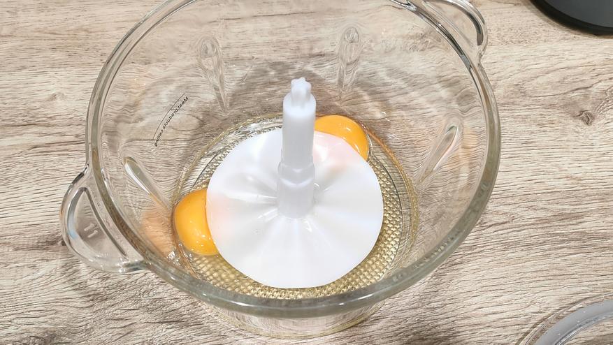 2 яйца отлично превратились в однородную болтунью. Я добавил третье, чтобы посмотреть, насколько изменится состояние. С желтком не получить стойких пиков, но вот если отделить их изначально, то все получится.