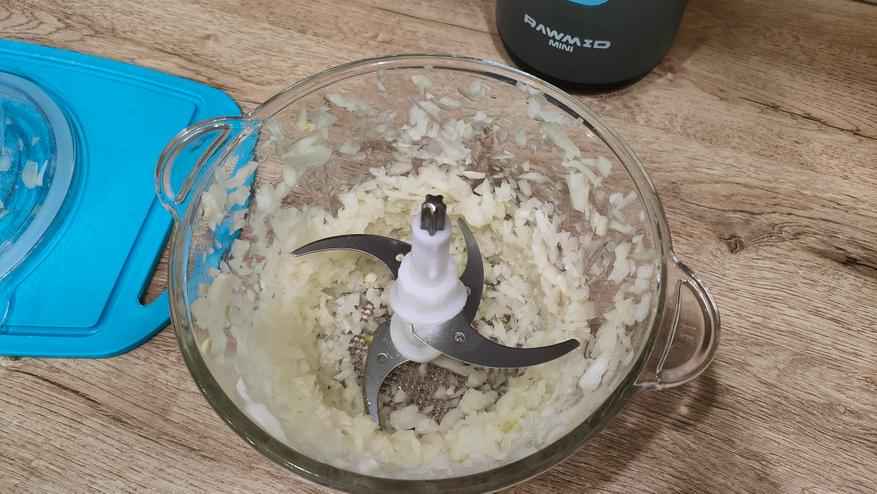 Первым будет лук, я выбрал его, чтобы проверить, как обстоит дела в чаше с двумя ножами, суть в том, что у меня есть блендер где один нож и сталкиваюсь с такой ситуацией, когда у ножей уже кашица луковая, а сверху есть крупные фракции.