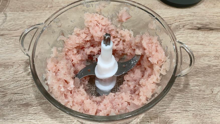 Тут ситуация сильно лучше, я бы сказал отлично. Во-первых, нормальная однородность, во вторых, процесс занял около 5-6 секунд. Очень быстро. Куриное филе грудки, 2 штуки, я порезал на 4 части каждое. Процесс занял тоже очень мало времени, при этом однородность меня также порадовала. Все делалось на 1 скорости, я выбрал ее, т.к. хотел посмотреть, насколько быстро все получится. В общем, ко второй я и не перешел, т.к. было все готово.