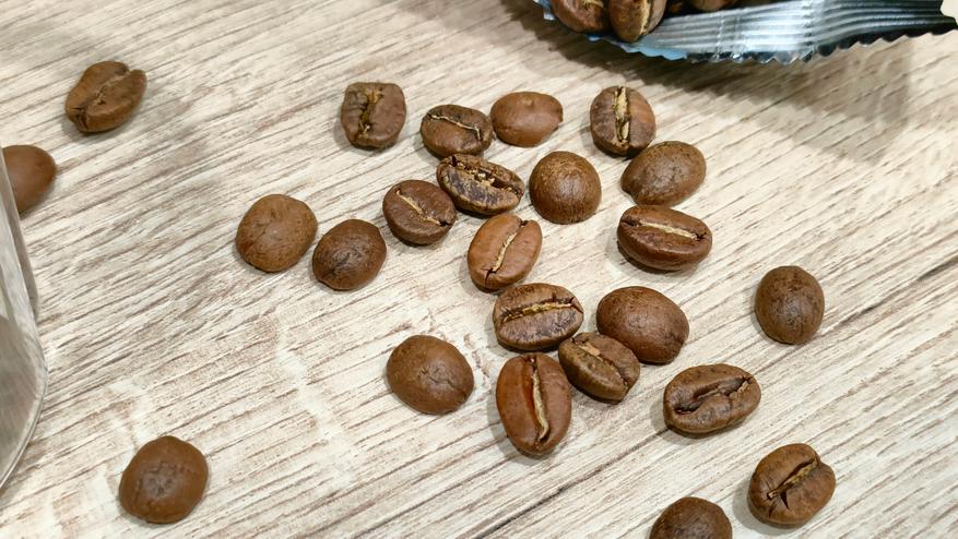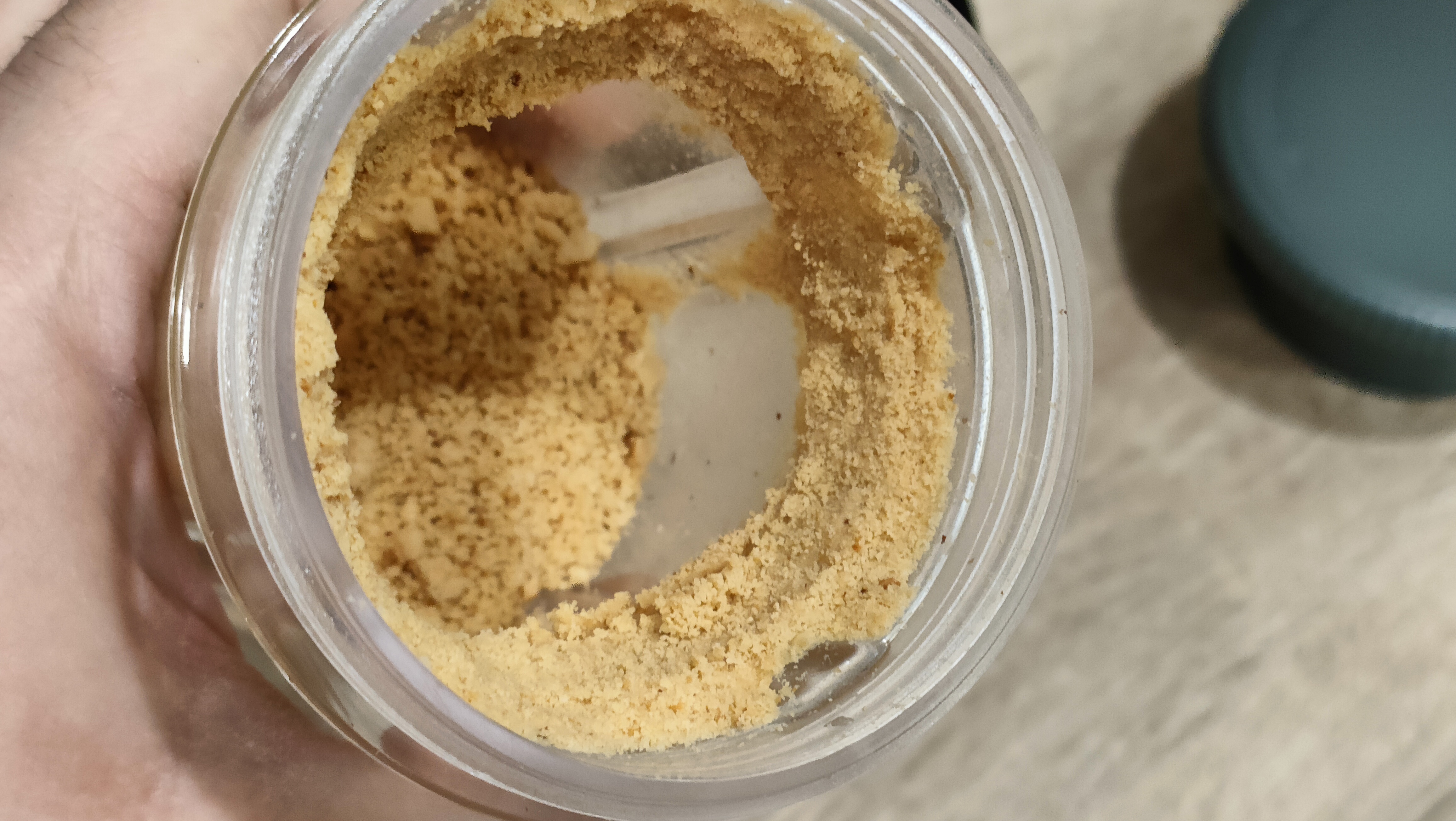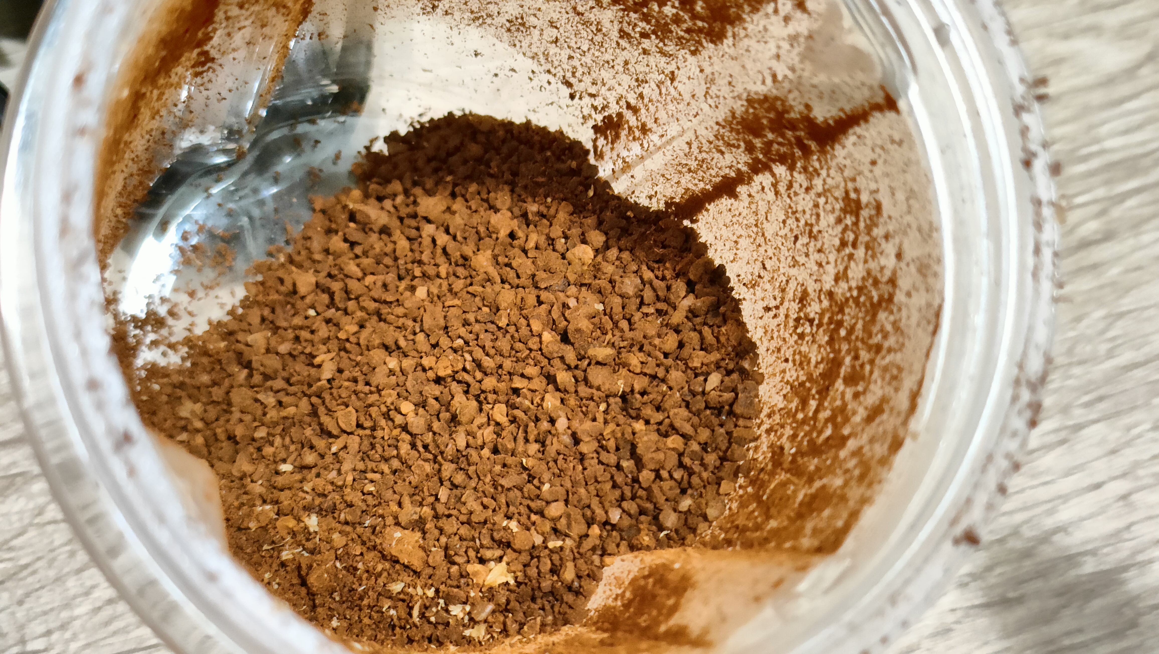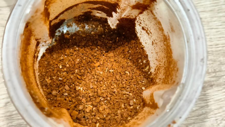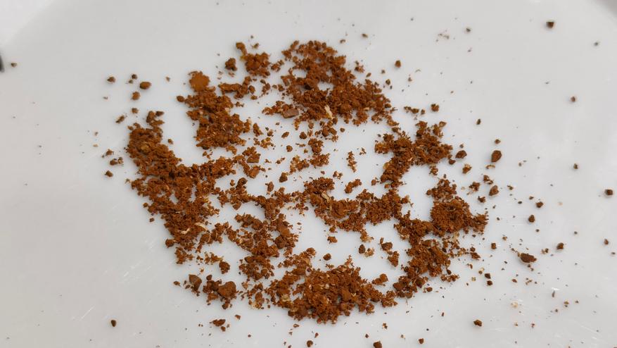 Первое фото в емкости, после 20 секунд. Крупные вкрапления это не фракция, а «комочки», которые образовались из-за выделения из кофе масел и последующего вращения. Добавил еще 20 секунд, почти ничего не поменялось. Высыпал на тарелку, все эти «комочки» рассыпаются. Данного помола хватит, например, на капельную кофеварку, где рекомендуется средний, примерно, как морская соль.