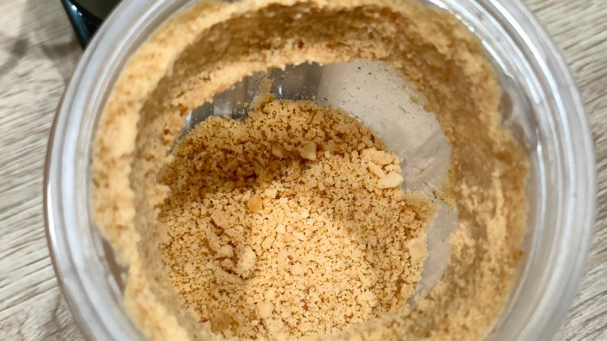 Арахис неплохо измельчился, но естественно, часть пытается прилипнуть к стенкам и приходится иногда стряхивать его в кучу, не снимая с блендера, который можно уже назвать измельчитель. Орехи начинают выделять масло, этого не избежать, так что, это специфика продукта. Арахис относительно мягкий продукт, попробую на более твердом — кофе.