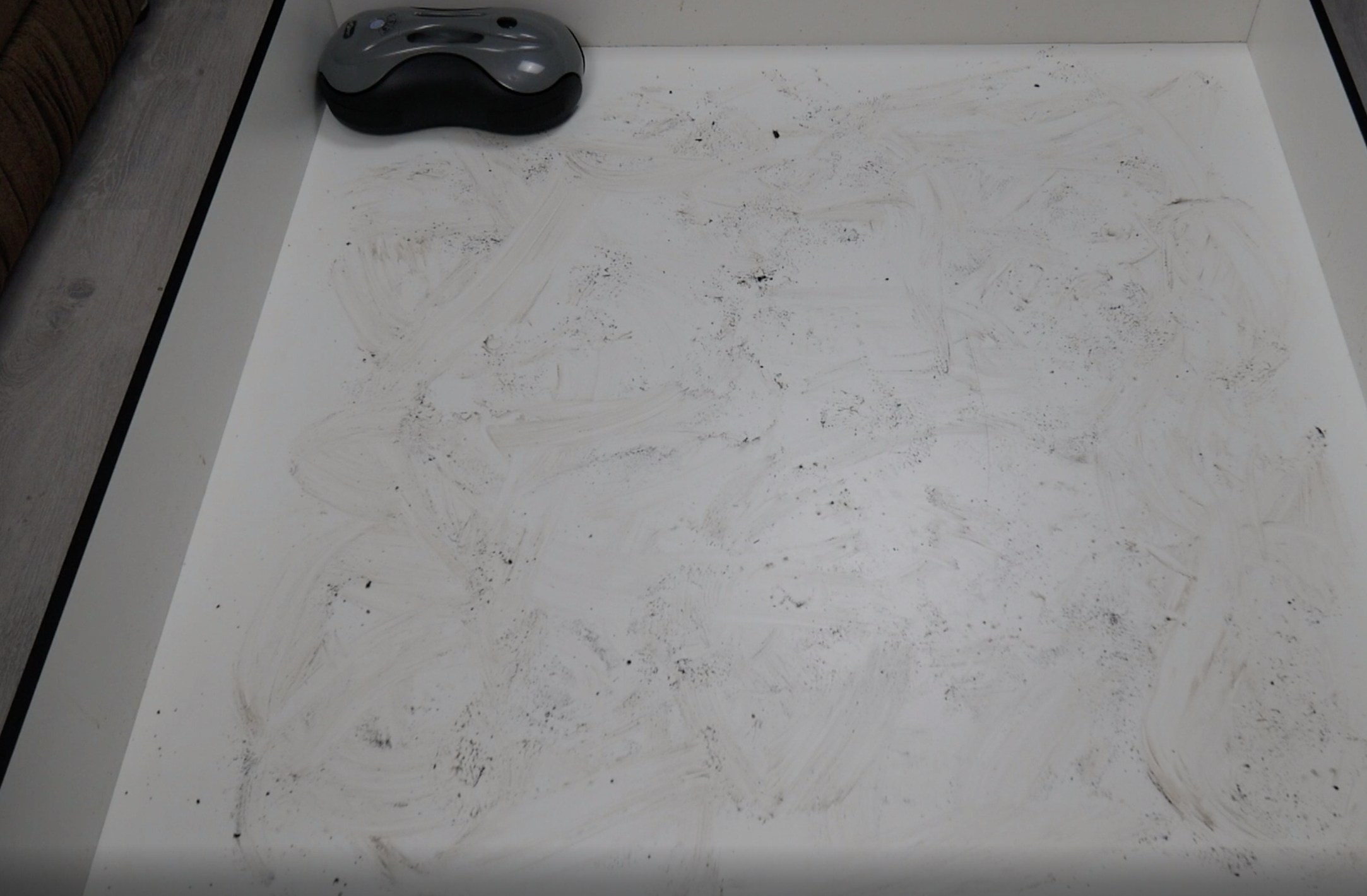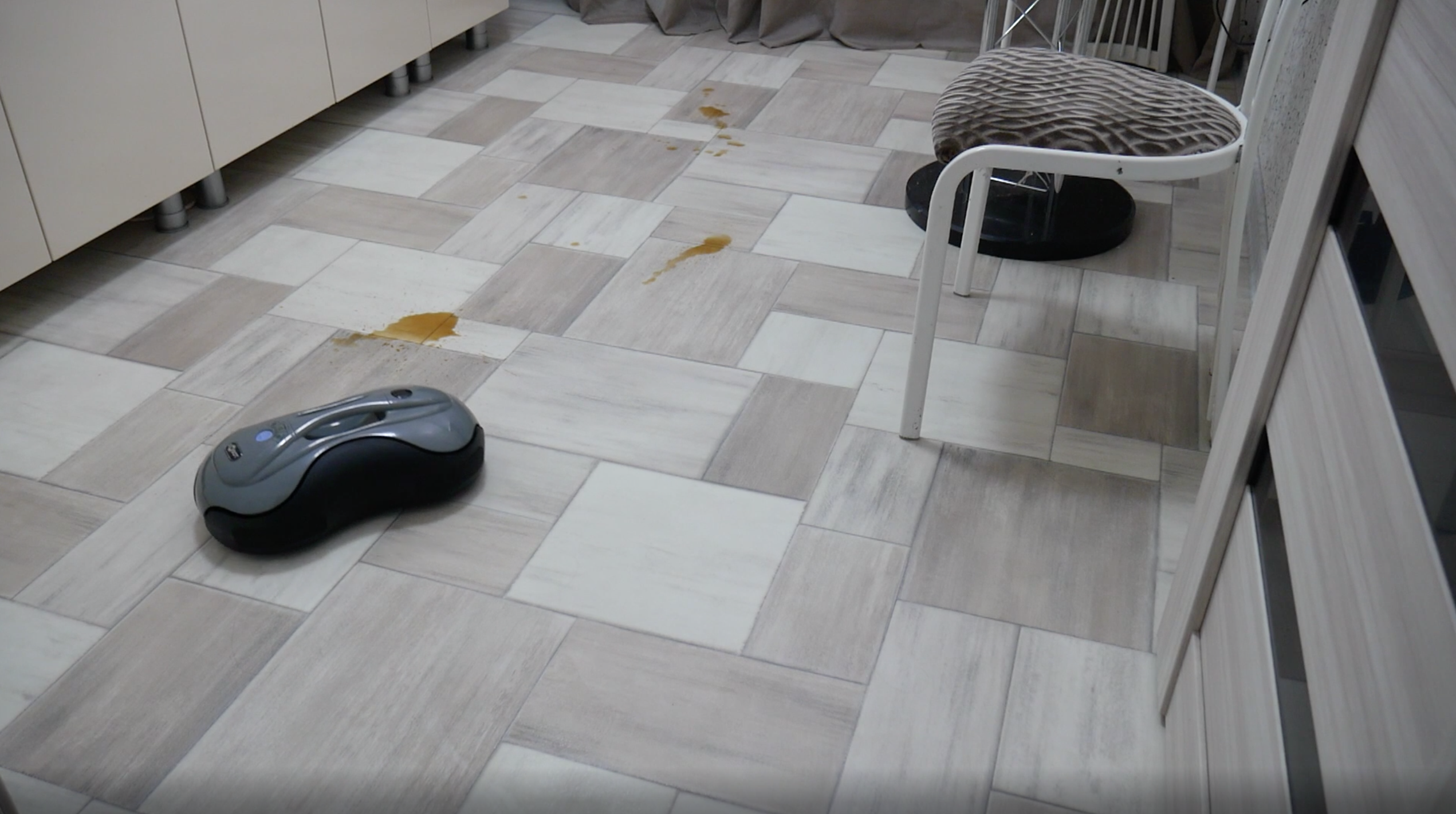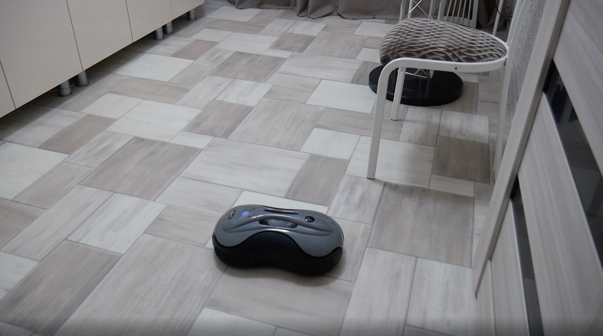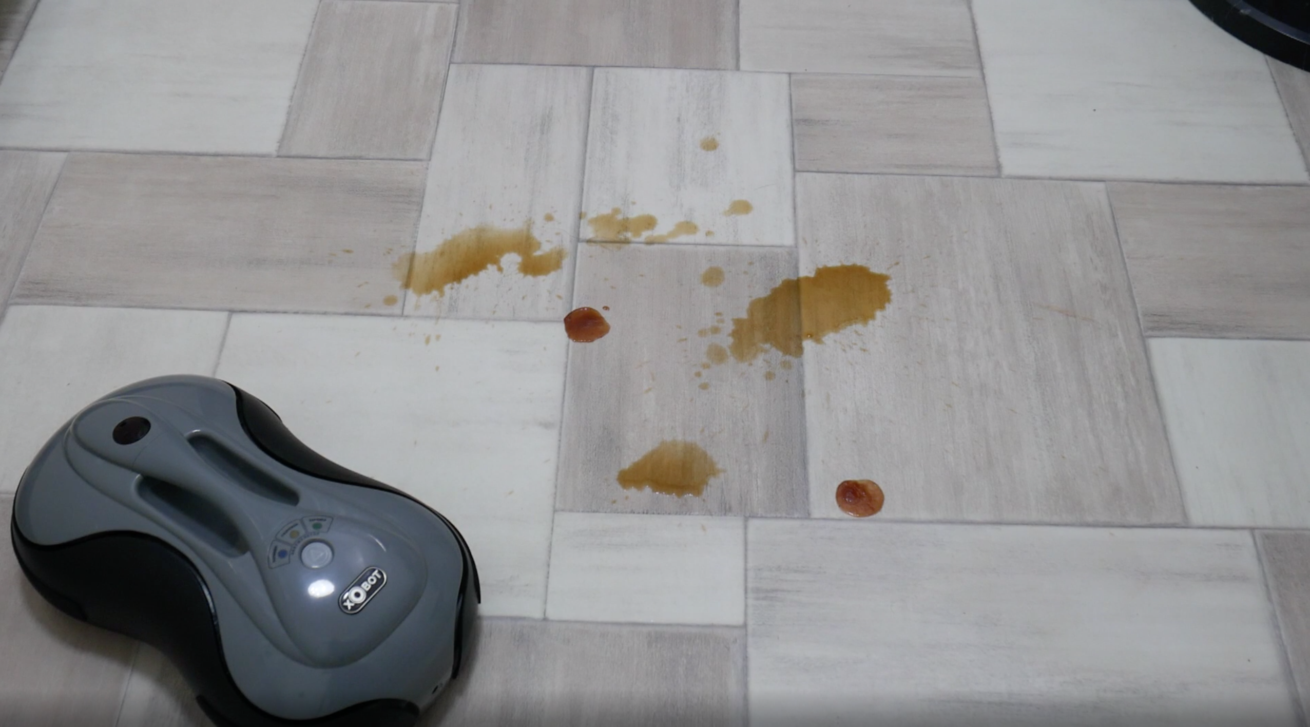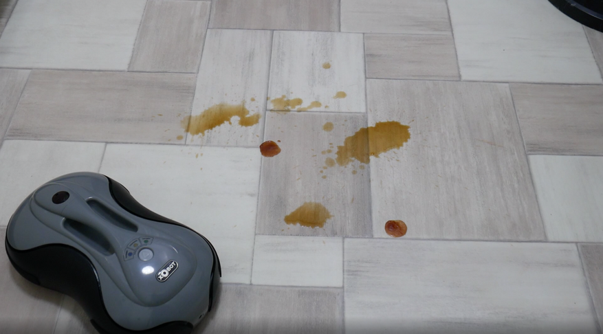Тест №1 – лужица кофе на кухонной плитке. С этим заданием робот справляется достаточно уверенно. Уже после второго прохода пол становится абсолютно чистым.