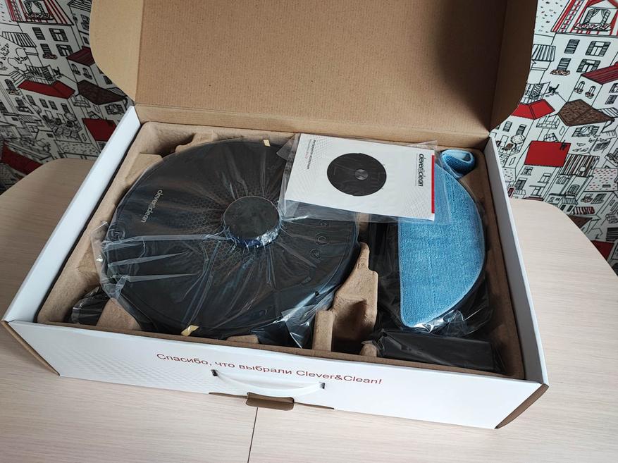 Поставляется пылесос в картонной матовой коробке, где спереди изображён сам робот-пылесос при взгляде сверху. Также там указана его модель и нанесён логотип компании Clever&Clean. Остальные стороны упаковки особого интереса не вызывают из-за присутствия на них только краткой информации об устройстве и данных о производителе. Комплект поставки включает в себя всё необходимое для полноценного функционирования пылесоса прямо из коробки, а именно: док-станция, сетевой адаптер, щётка для чистки съёмных компонентов, контейнеры для сухой и влажной уборки, запасные фильтры и накладки из микрофибры, комплект боковых щёток, инструкцию по эксплуатации и сам робот-пылесос. Более того производитель подумал о сохранности при транспортировке и добавил к той коробке, что описана выше еще одну для больше сохранности. Получается коробка в коробке.