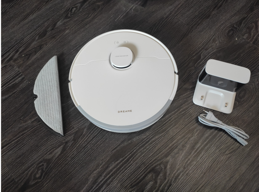 В коробке сам робот-пылесос Dreame D20 Pro, зарядная станция, шнур и насадка для швабры.