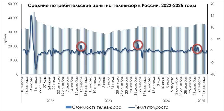 Естественно видим аномальное увеличение средней стоимости телевизора в конце февраля и начале марта 2022 года в связи с внешнеполитическми факторами. Тогда цена увеличилась почти на 15% с 33,5 тысяч рублей до 38,5 тысяч. Затем наблюдаем некоторую сезонность, которую я выделил на графике: в начале года цена увеличивается на 1,5-3%. При этом если в начале 2022 года телевизор в среднем стоил 32,4 тысячи рублей, то в начале 2025 — 35,4 тысячи.